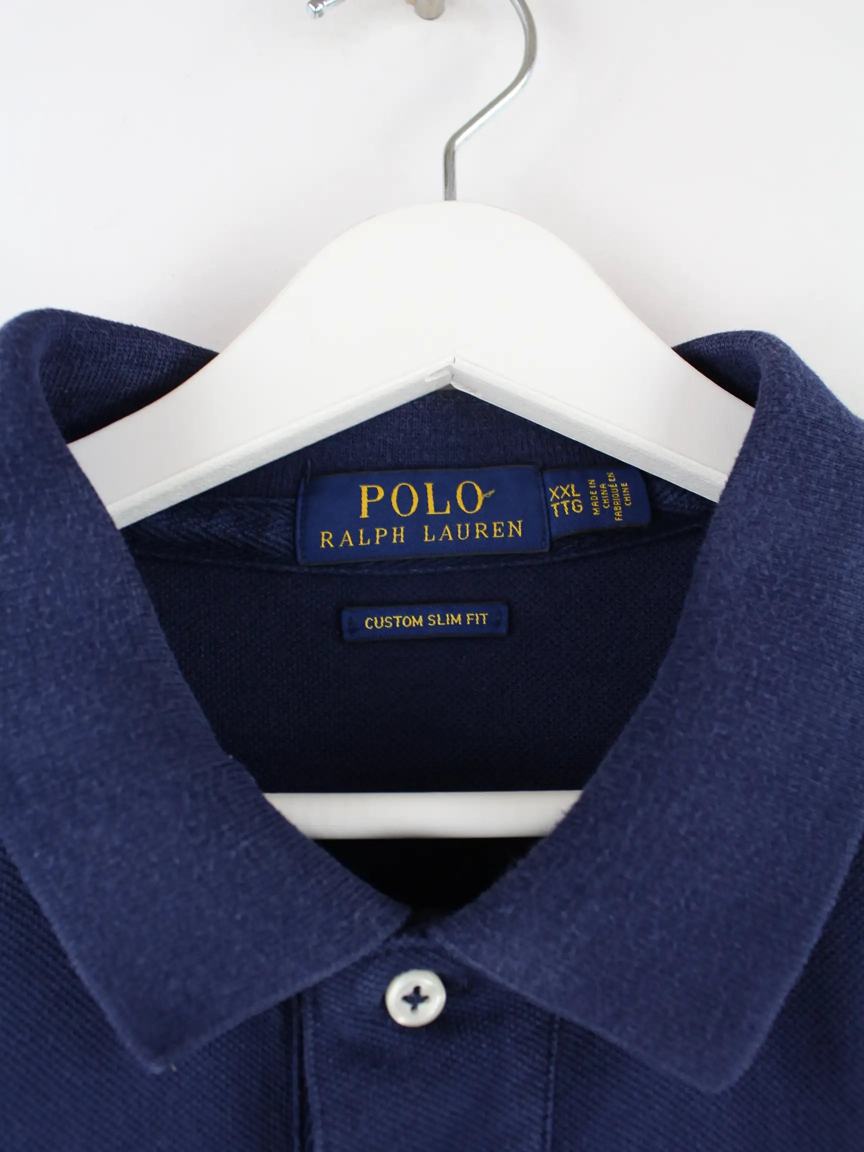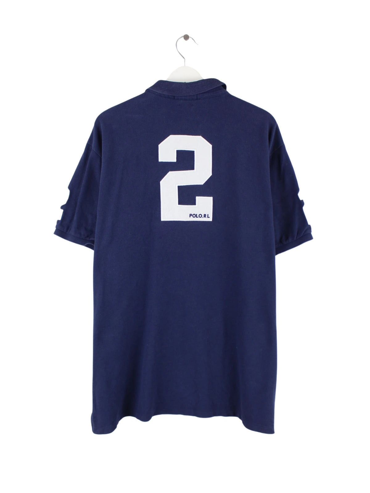 Blaues Poloshirt mit gestickten Motiven vom Brand Ralph Lauren aus den 90'ern in Größe XXL. Es ist aus Baumwolle produziert und in sehr gutem Zustand zu bekommen.