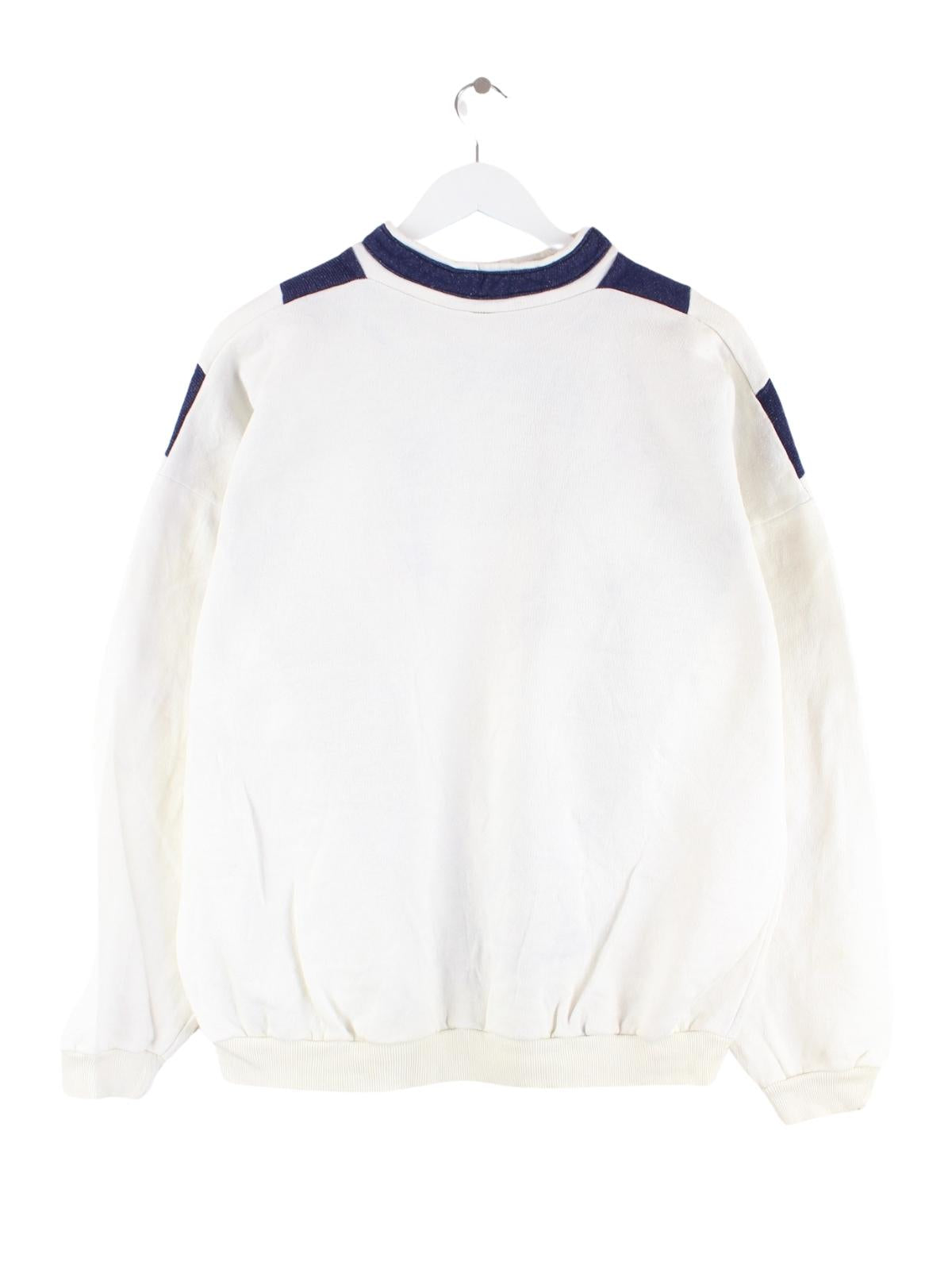 Weißer Sweater des Labels Reebok aus den 80'ern in Größe S. Er ist aus einer Baumwollmischung gefertigt und in gutem Zustand bei uns vorrätig.