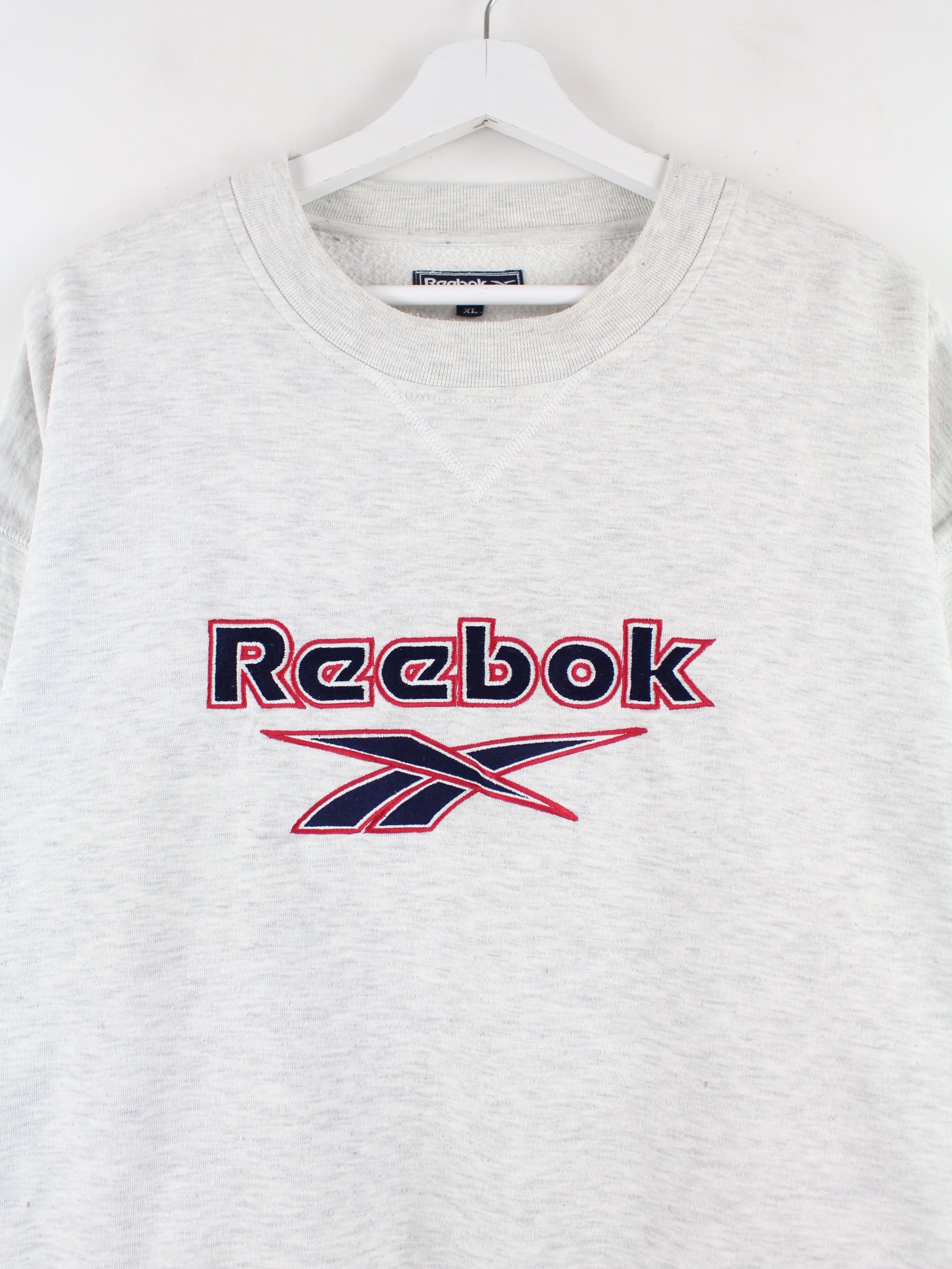 Sweater der Marke Reebok mit Stickereien in Größe XL aus den 90'ern. Er ist aus einer Baumwollmischung hergestellt und in Grau zu haben.