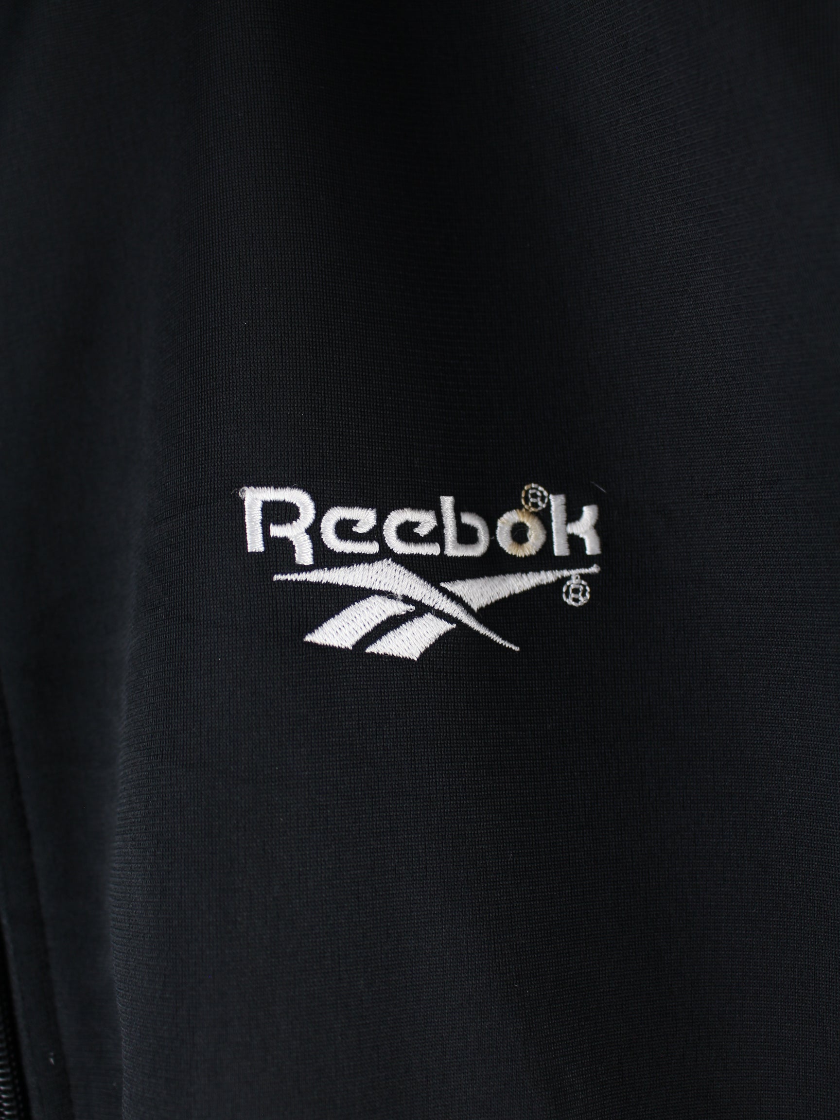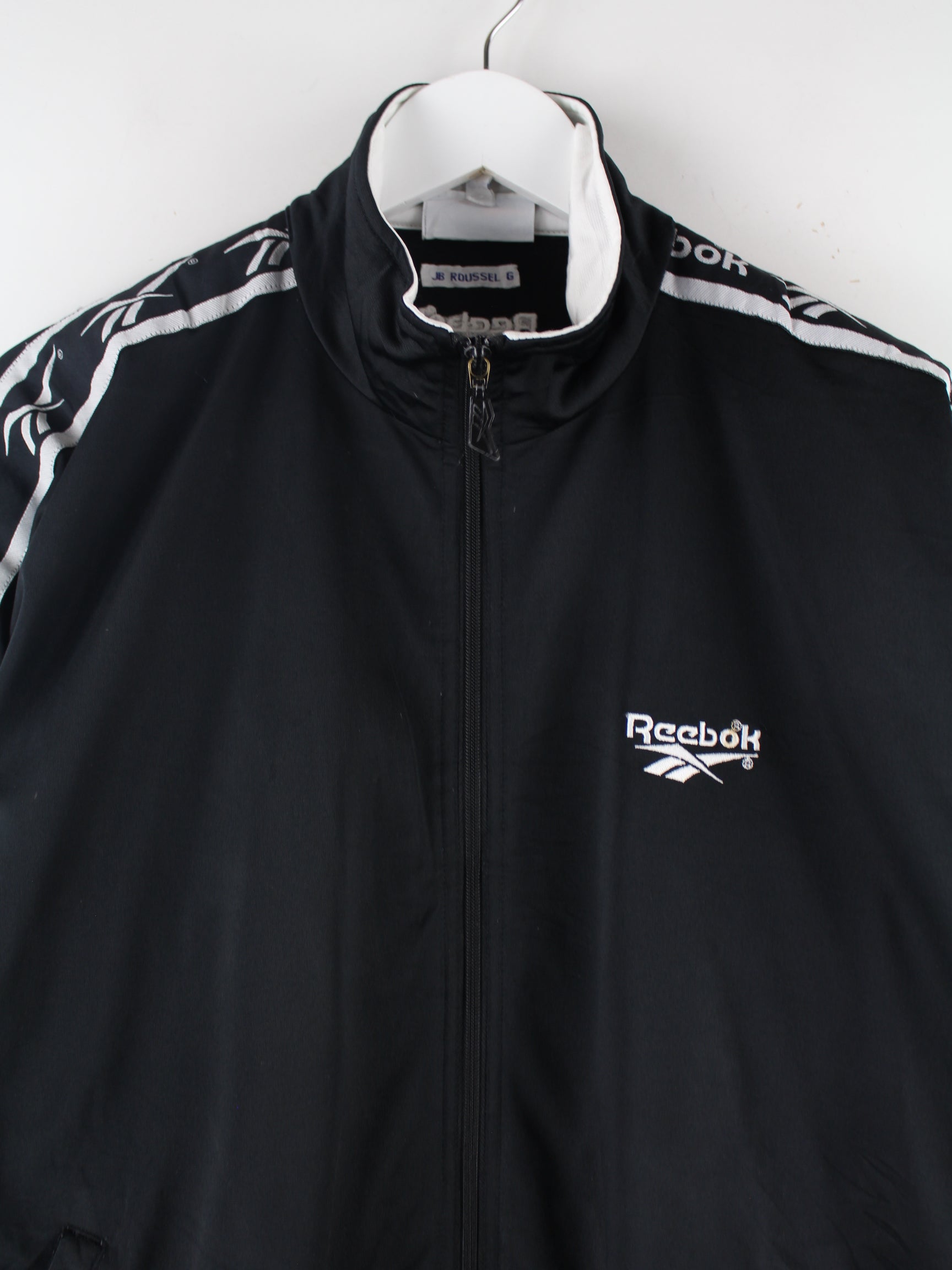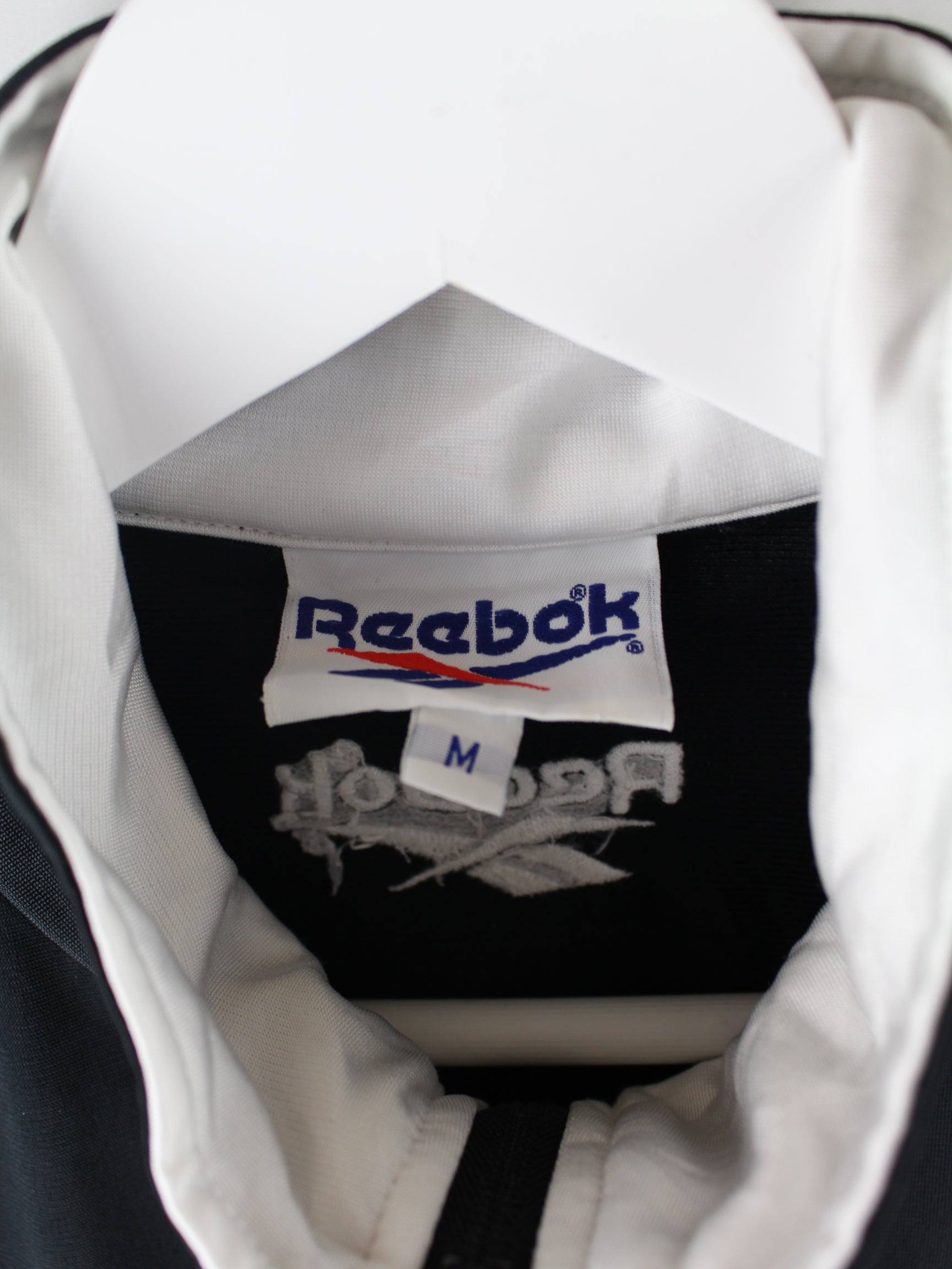 Schwarze Trainingsjacke des Labels Reebok aus den 90'ern in Größe M. Sie ist aus Synthetik angefertigt und in gutem Zustand vorrätig.