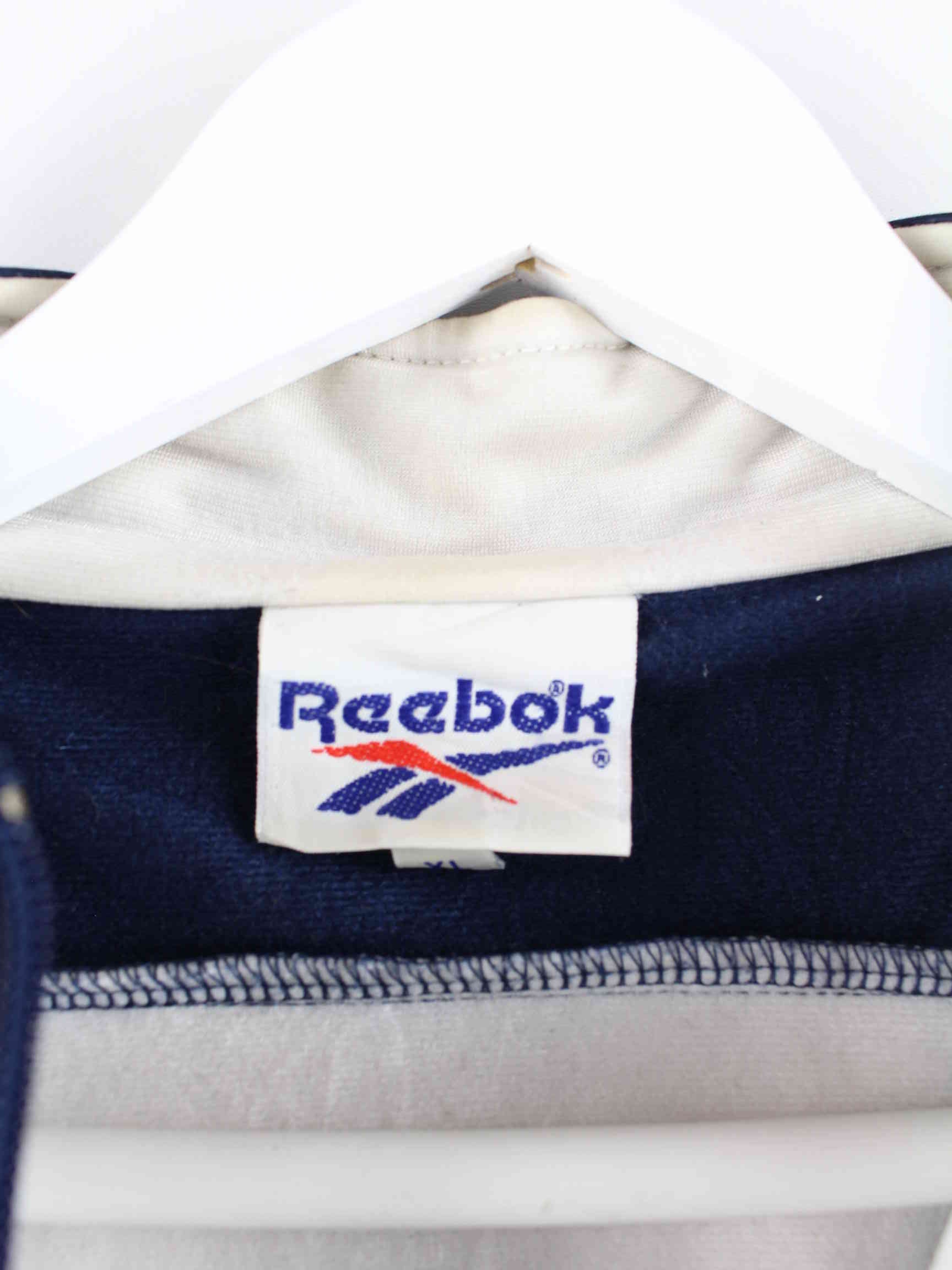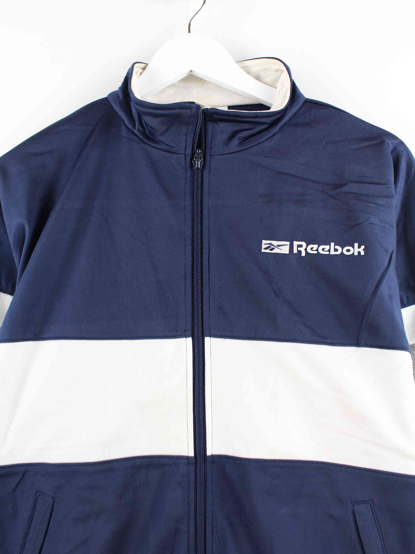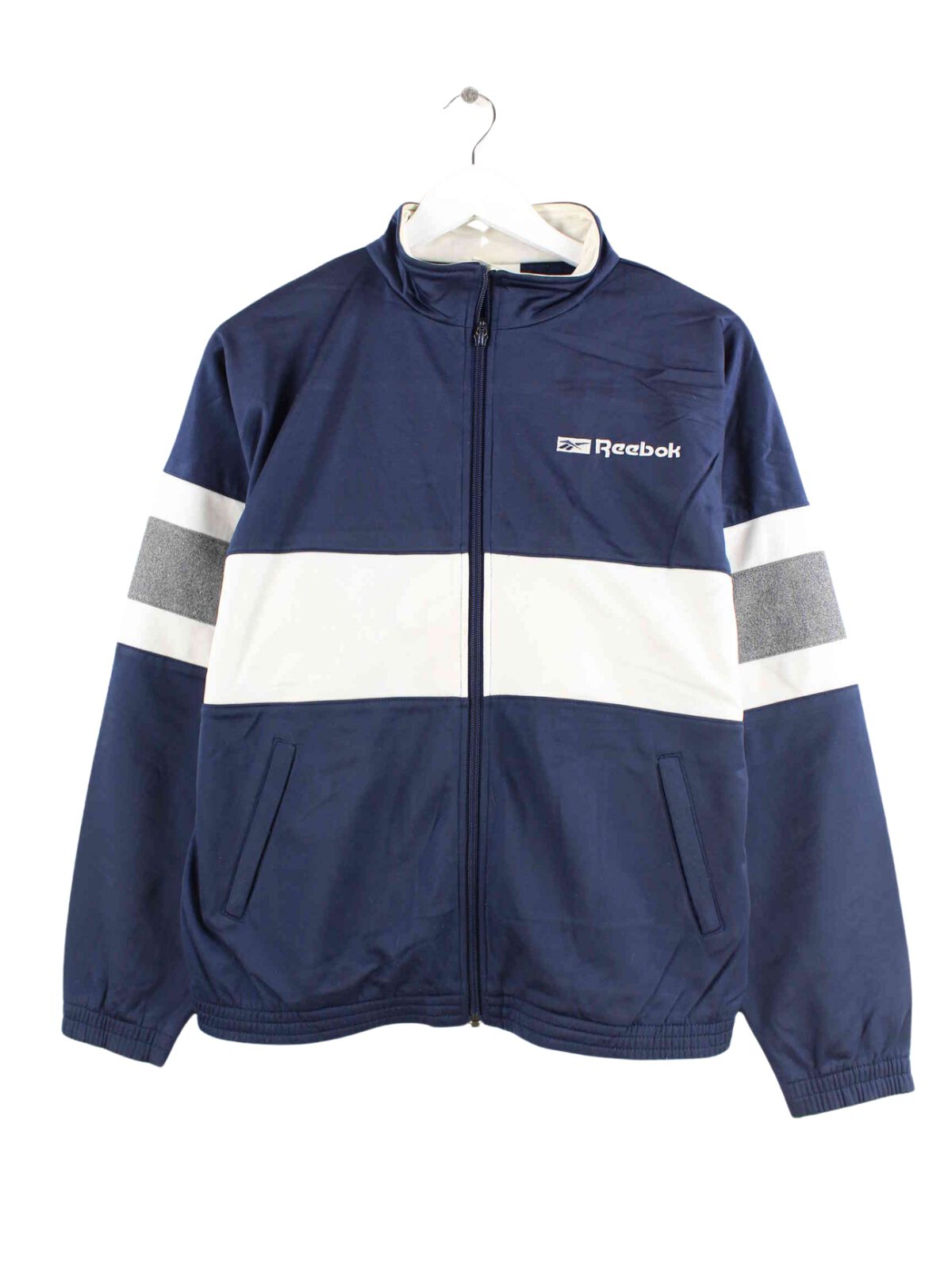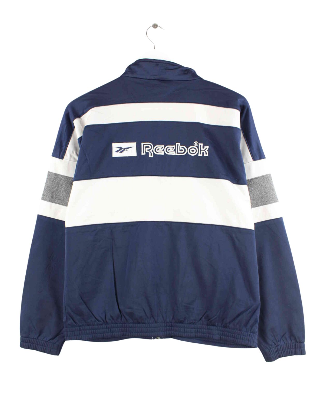 Blaue Trainingsjacke vom Brand Reebok aus den 90'ern in Größe L. Sie ist aus Synthetik gefertigt und in sehr gutem Zustand lieferbar.