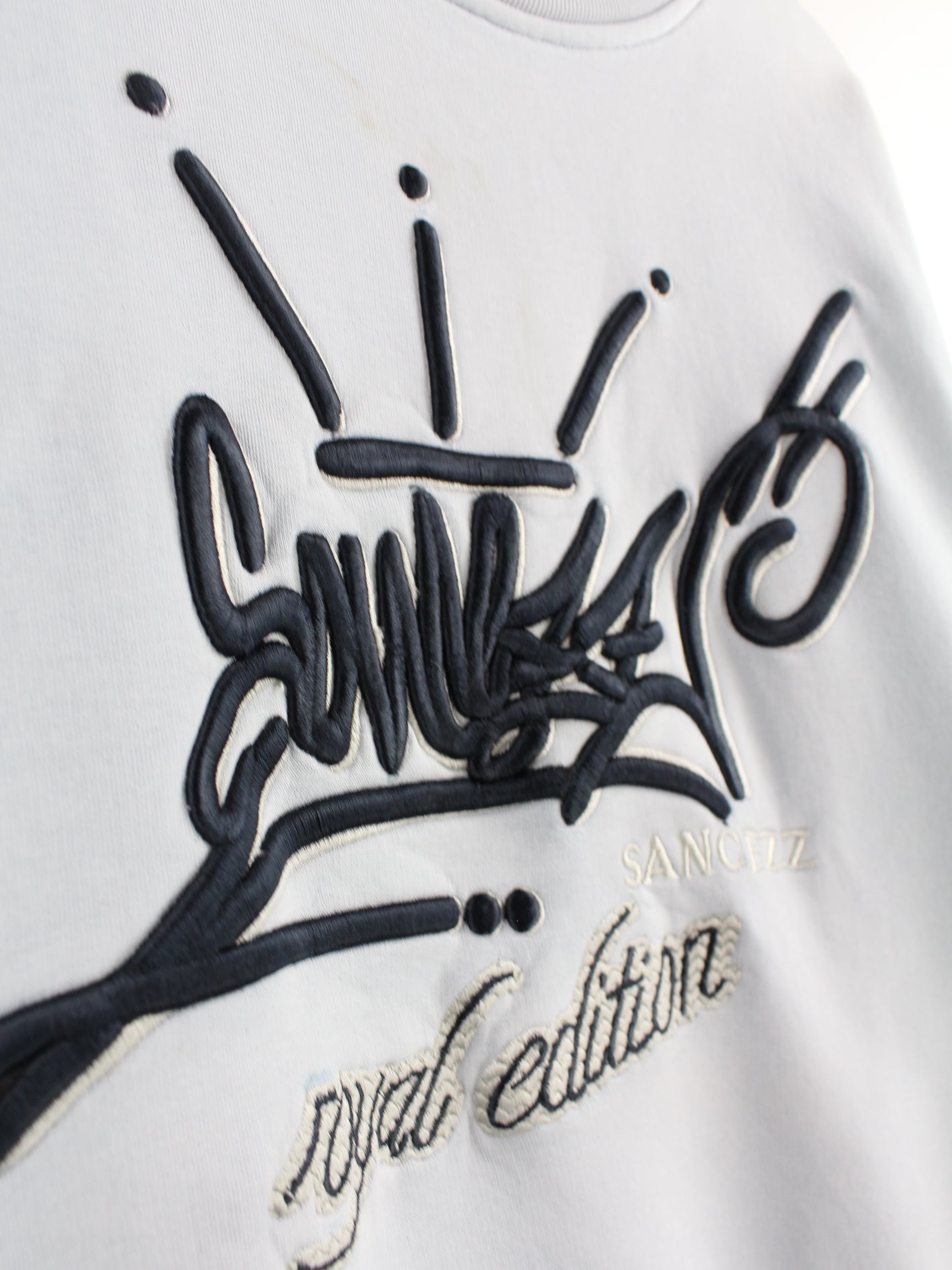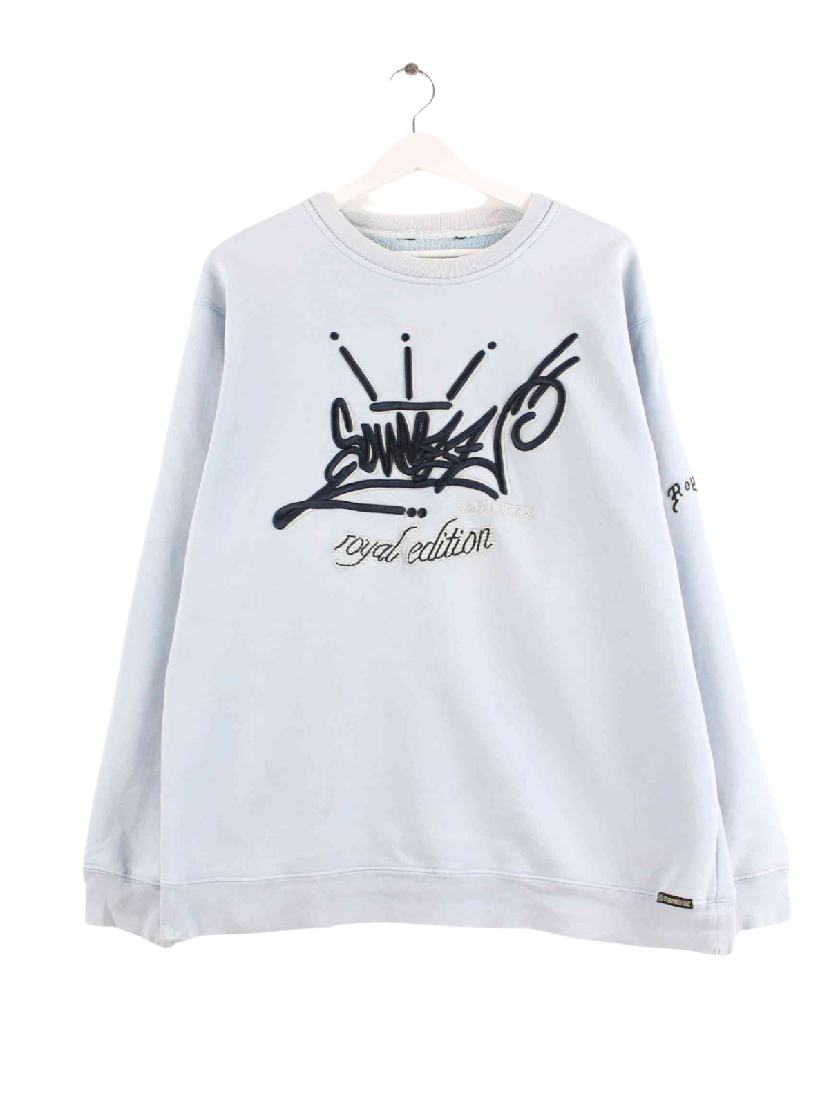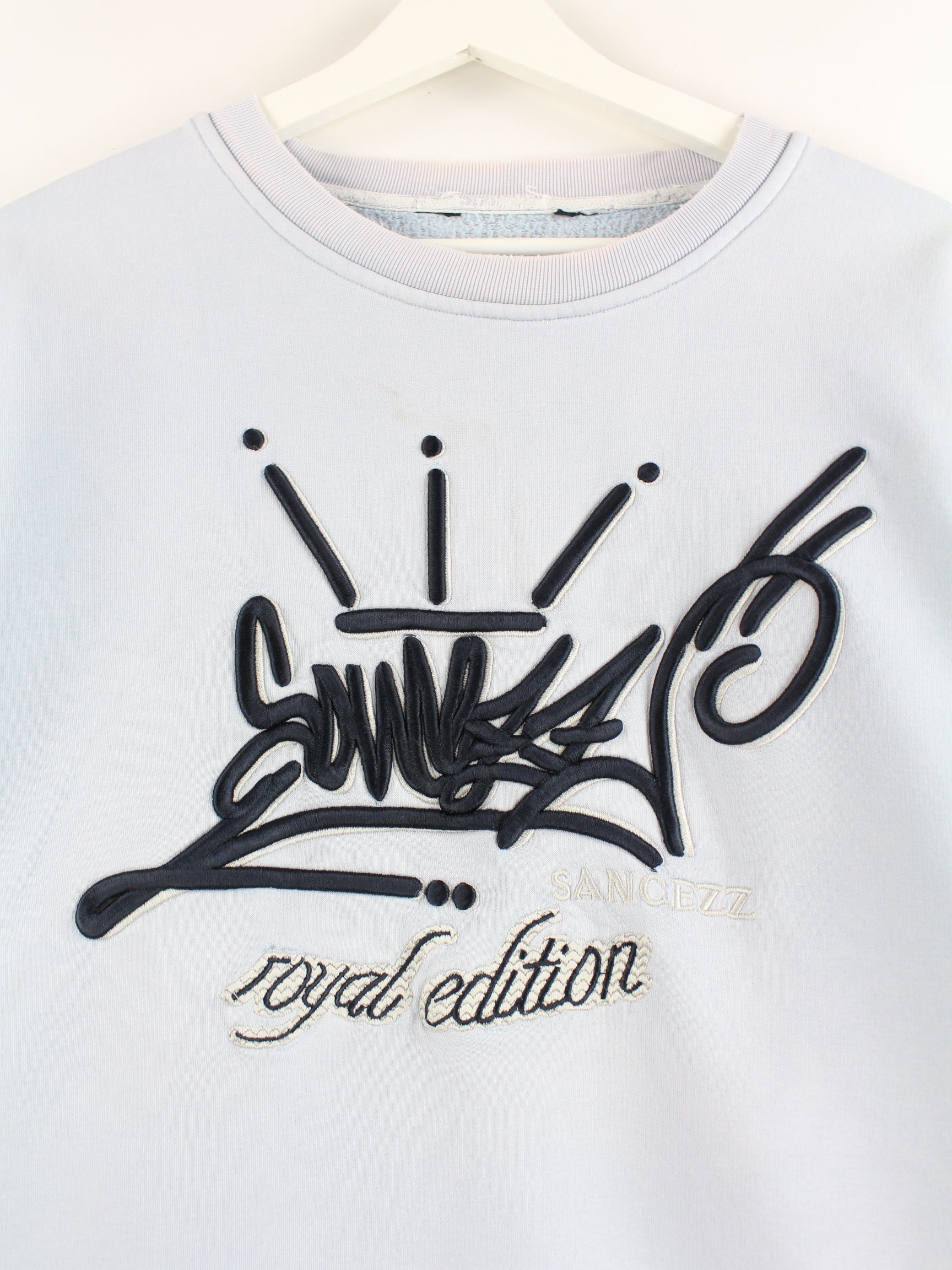 Sweater von Sancezz mit gesticktem Logo in Größe M aus Anfang der 2000'er. Er ist aus einer Baumwollmischung angefertigt und in Blau auf Lager.
