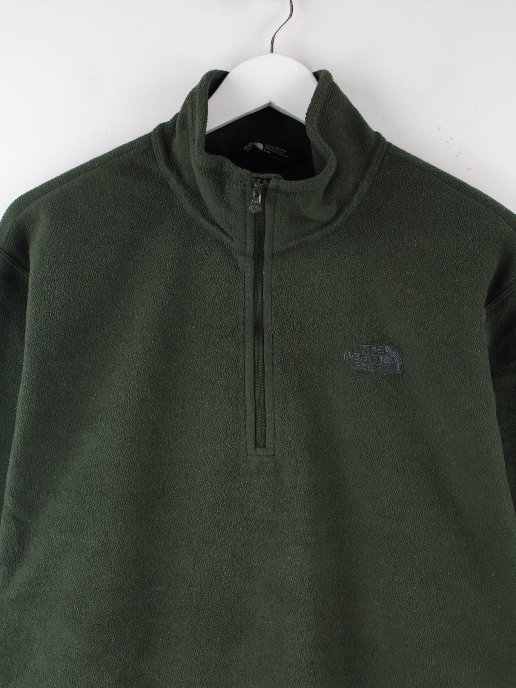 Sweater vom Label The North Face mit kurzem Reißverschluß in Größe L. Er ist aus behaglichem Fleece gemacht und in Grün im Bestand.