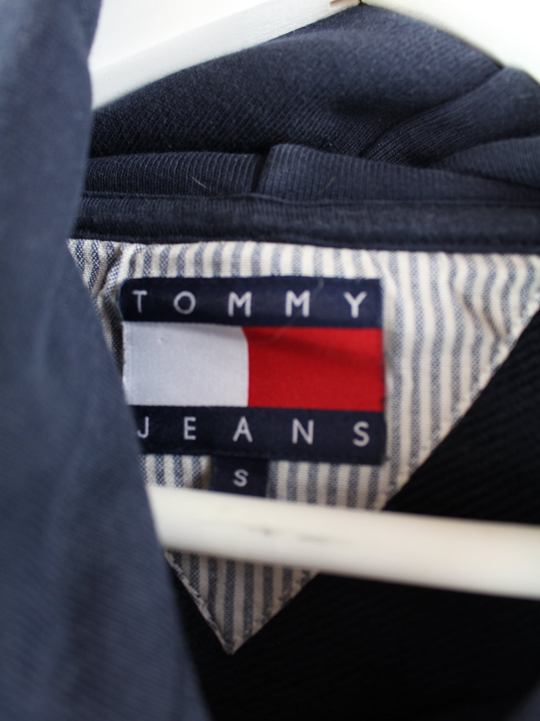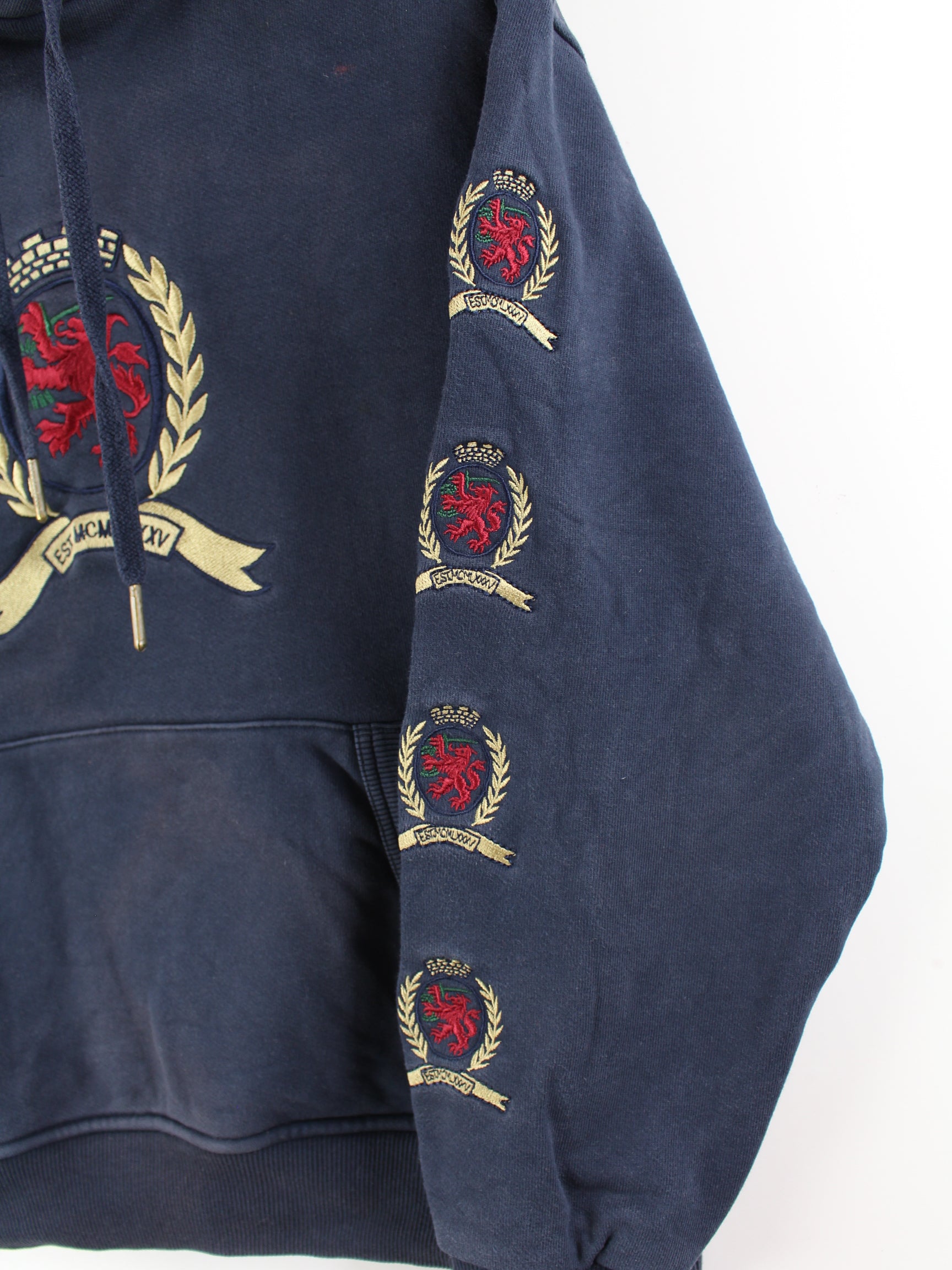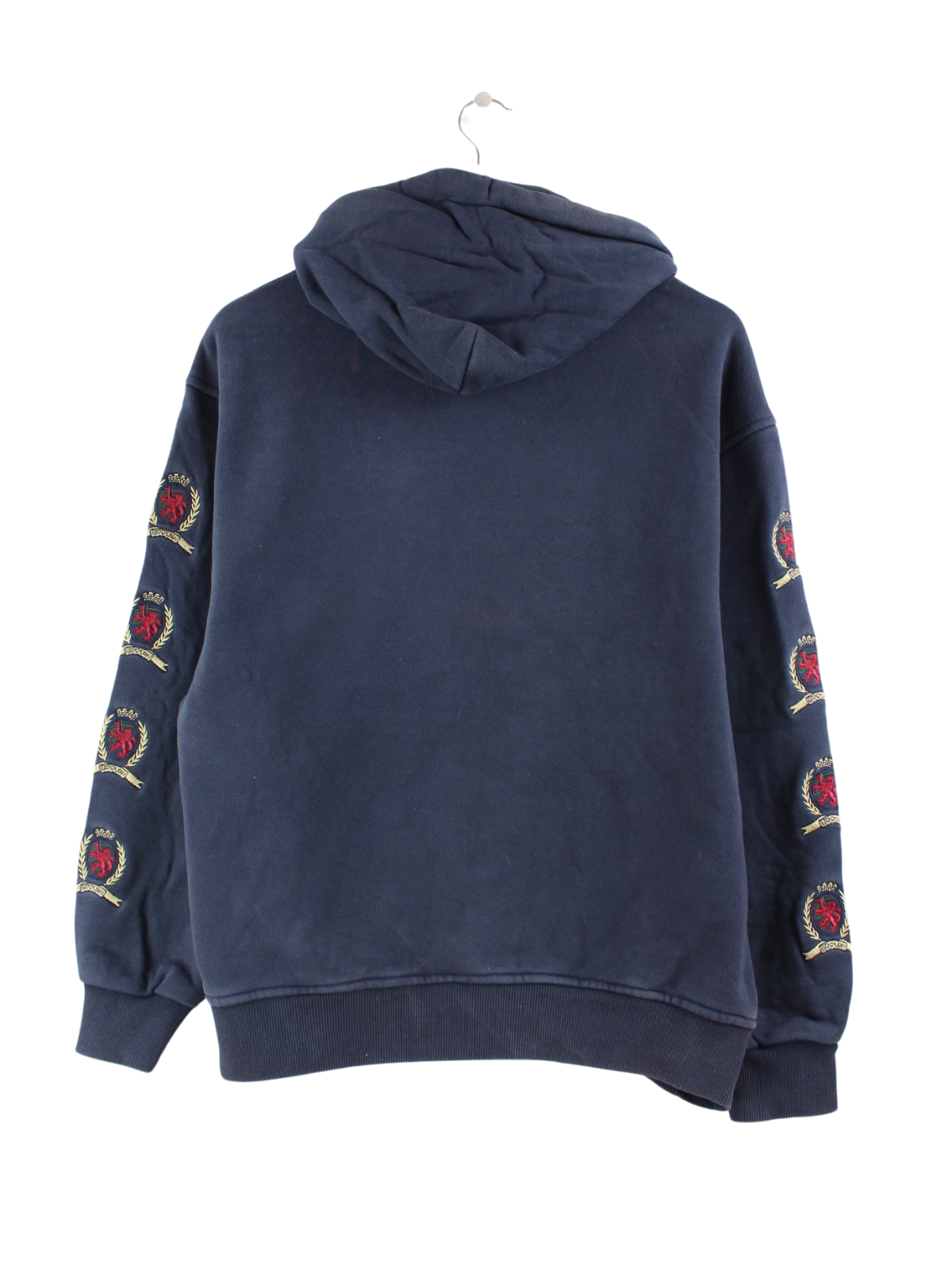 Hoodie vom Brand Tommy Hilfiger mit gestickten Motiven in Größe S aus den 90'ern. Er ist aus einer Baumwollmischung und in Blau im Angebot.