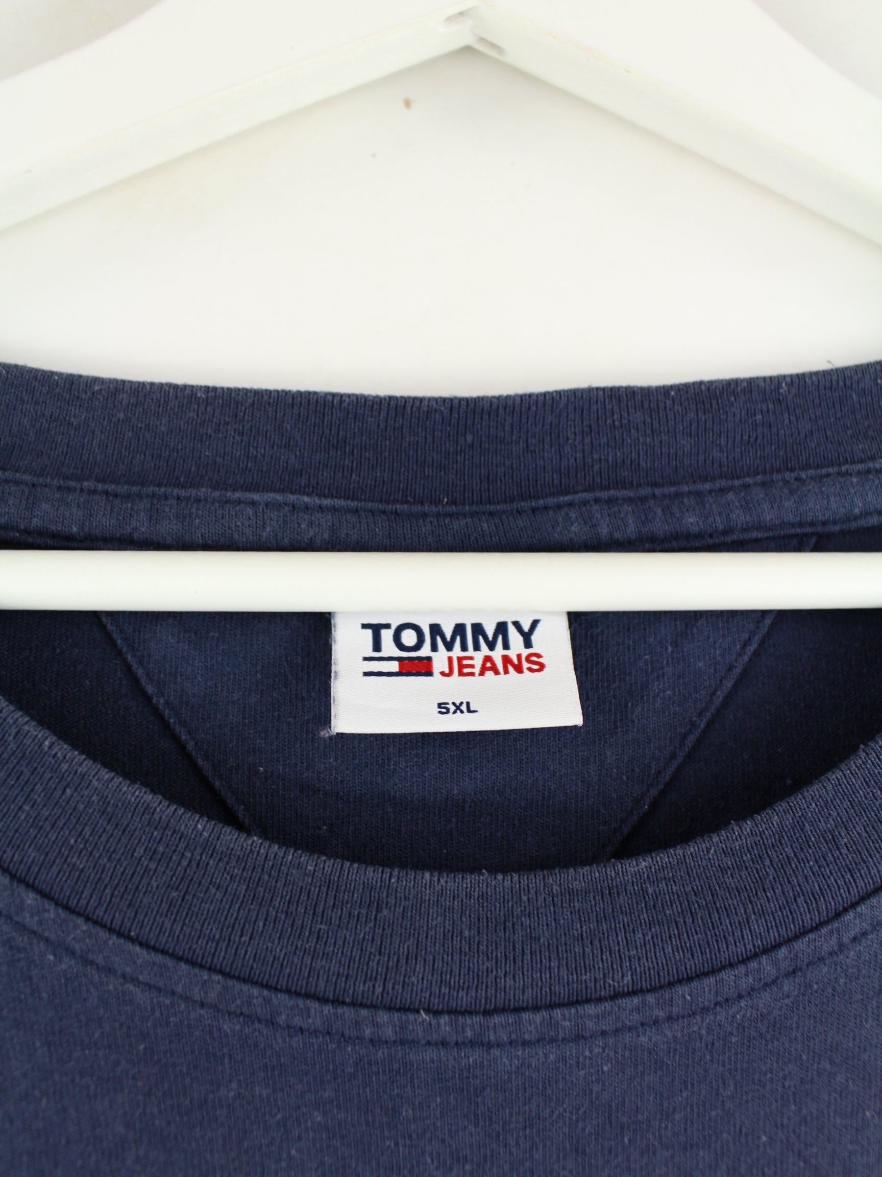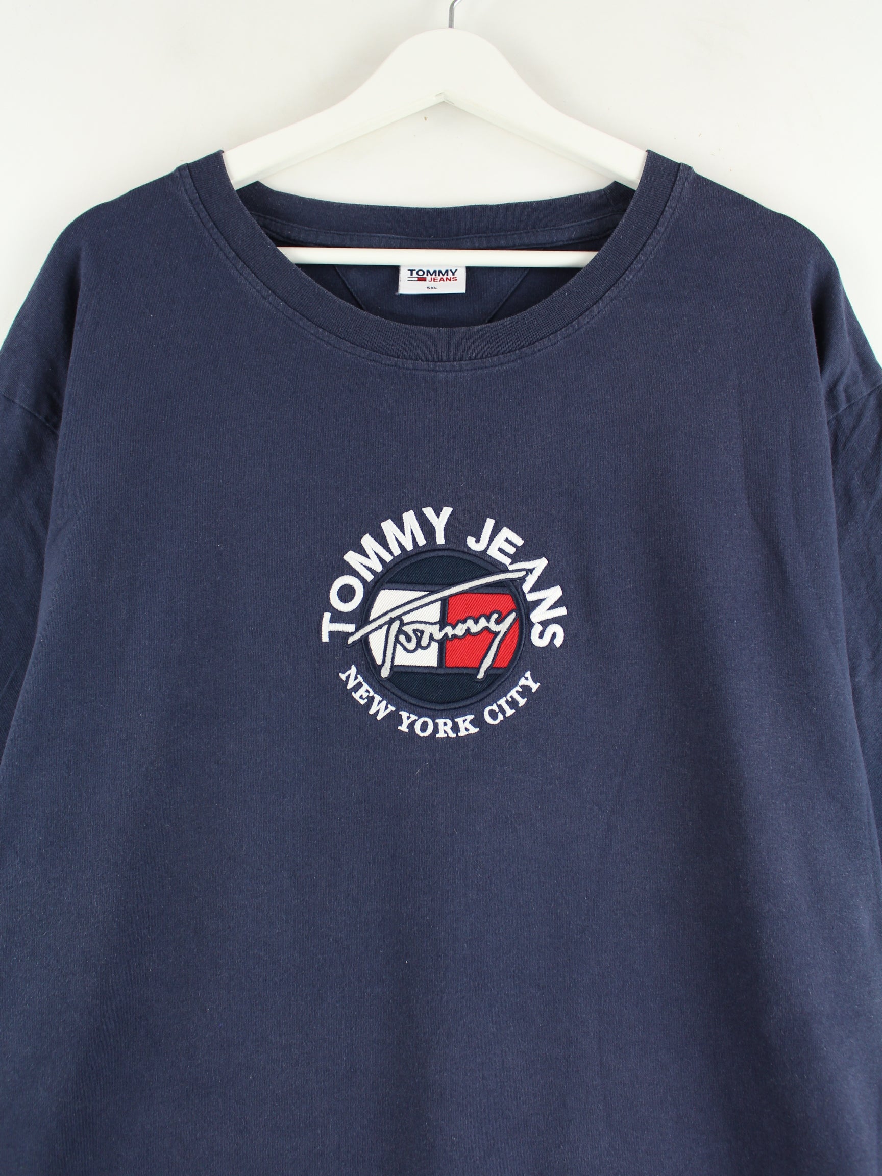 T-Shirt der Marke Tommy Hilfiger mit gesticktem Logo in Größe 5XL. Es ist aus Baumwolle gemacht und in Blau zu bekommen.