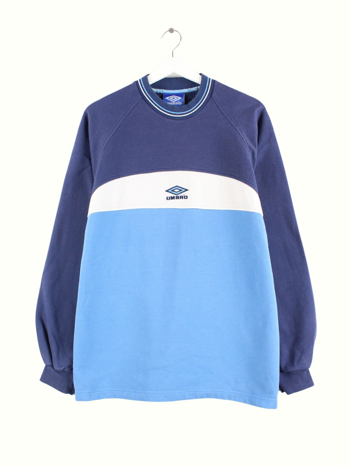 Sweater aus dem Hause Umbro mit gesticktem Logo in Größe M aus den 90'ern. Er ist aus einer Baumwollmischung produziert und in Blau im Angebot.