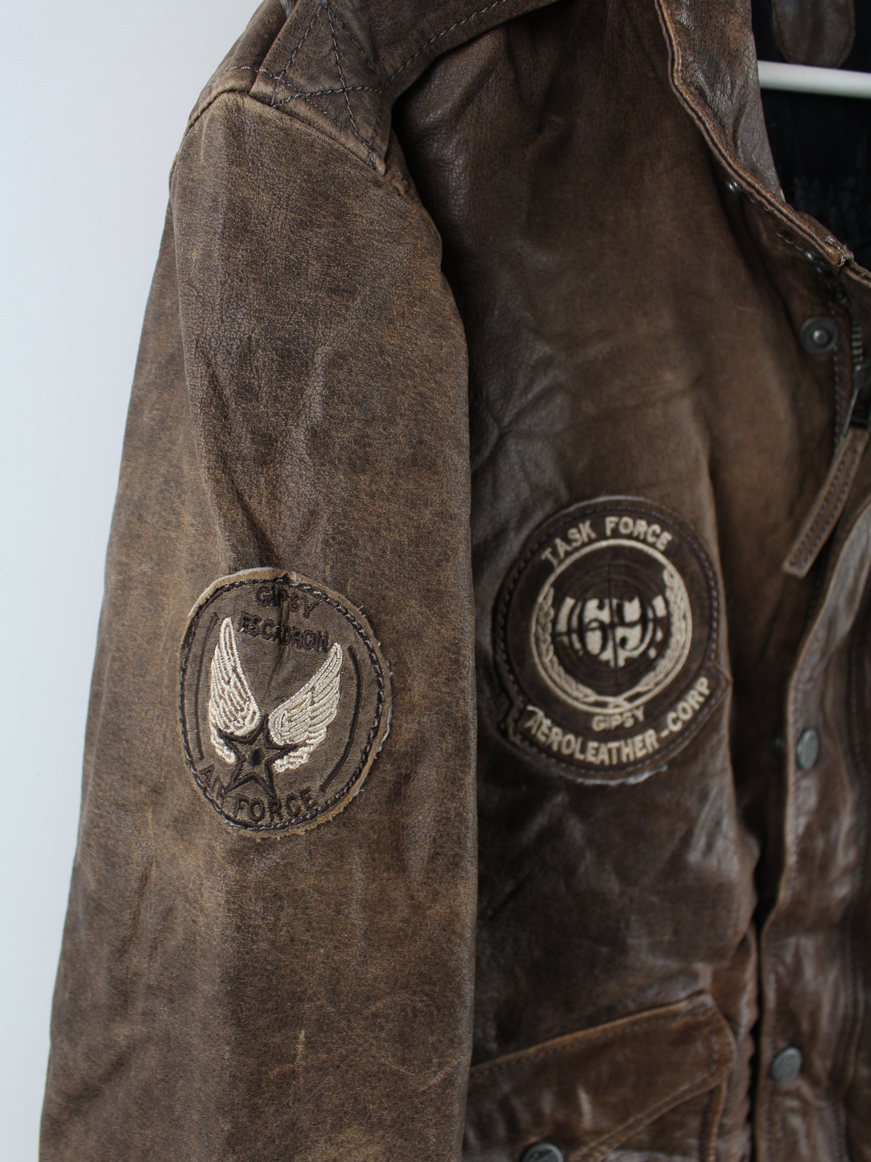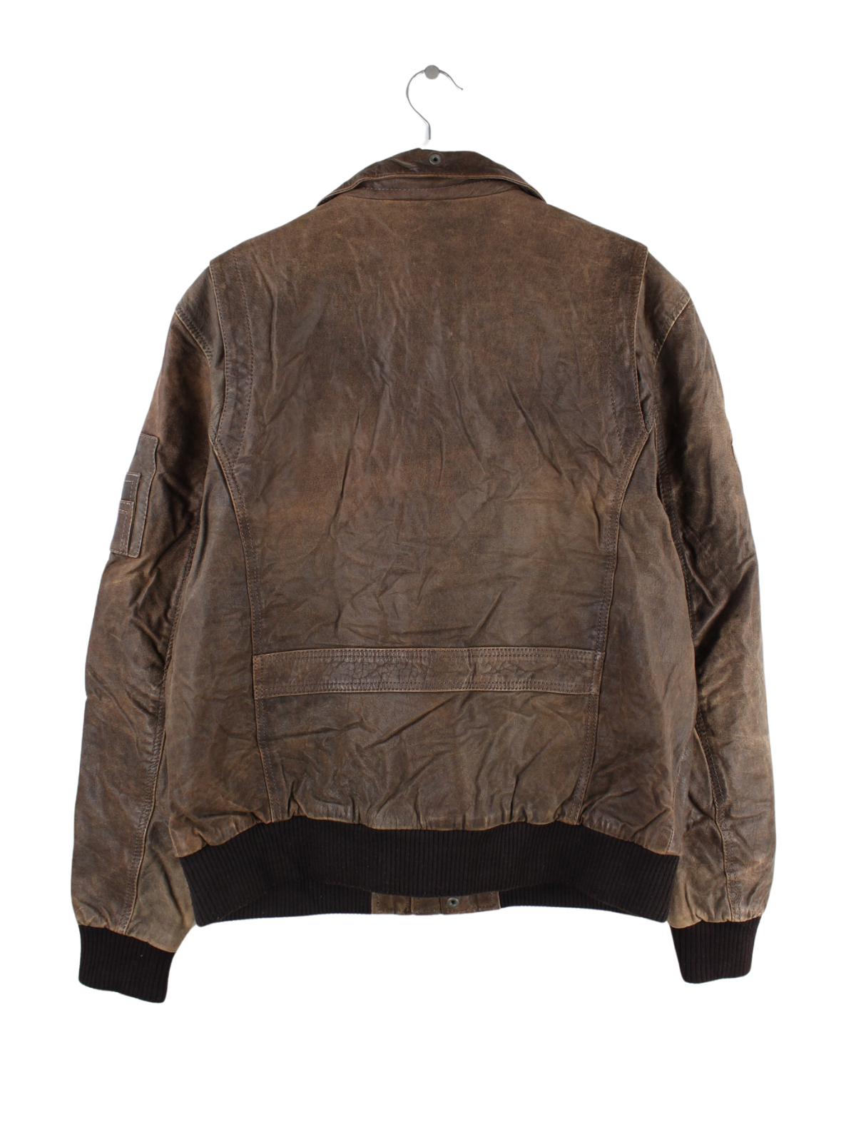 Braune Vintage Jacke aus den 90'ern in Größe XL. Sie ist aus Leder gefertigt und in gutem Zustand bei uns vorrätig.