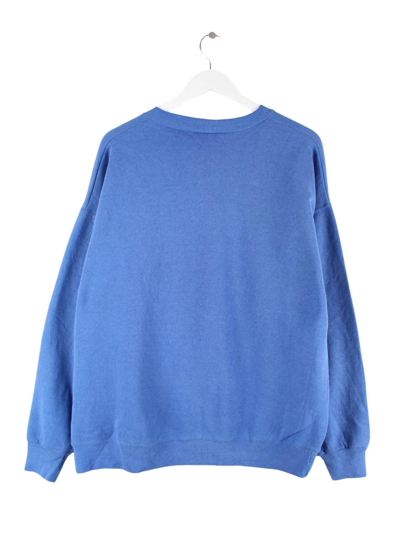 Blauer Vintage Sweater mit gestickten Motiven aus den 90'ern in Größe L. Er ist aus einer Baumwollmischung produziert und in sehr gutem Zustand in Stock.