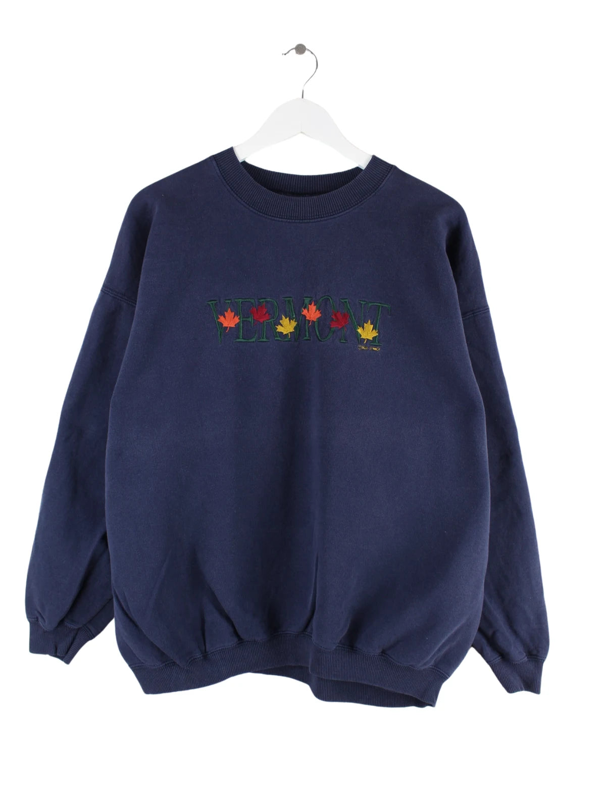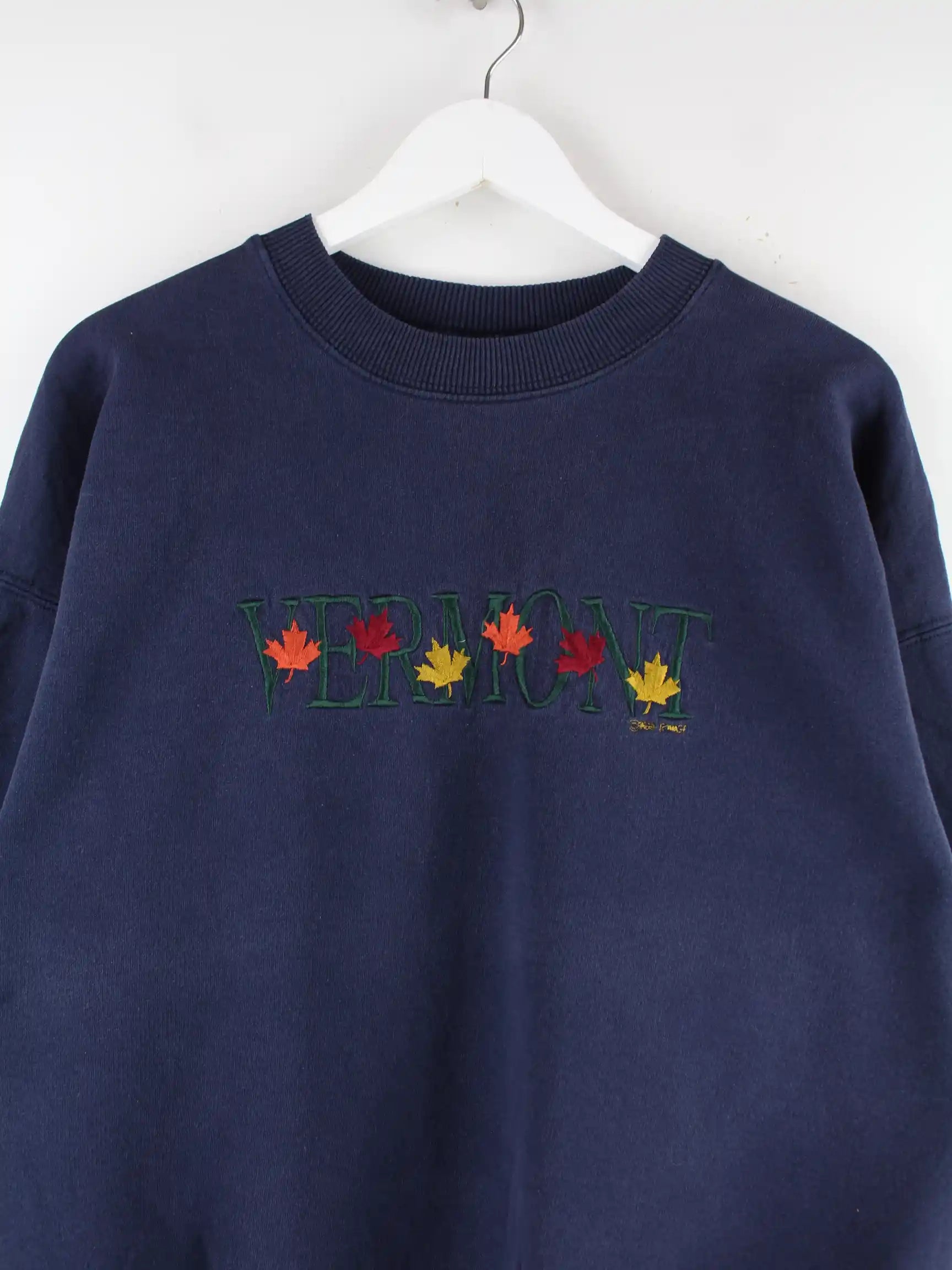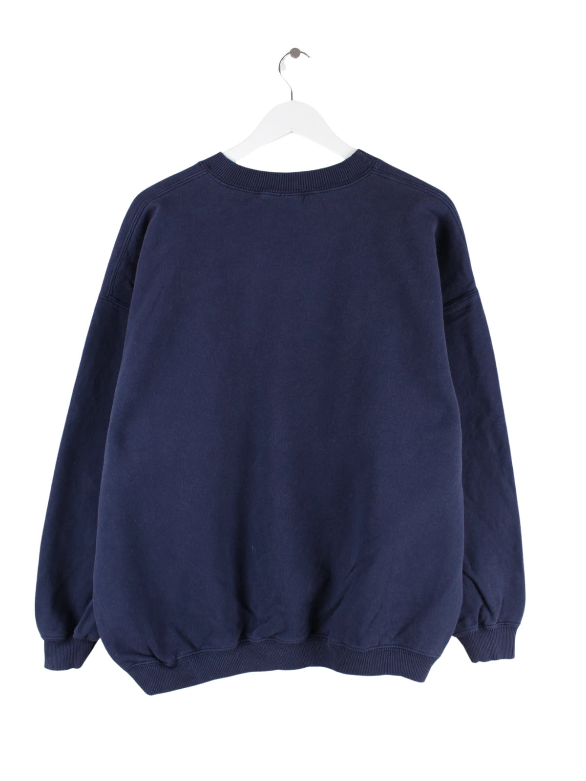 Vintage Sweater mit gesticktem Logo in Größe XL aus den 90'ern. Er ist aus einer Baumwollmischung und in Blau im Bestand.