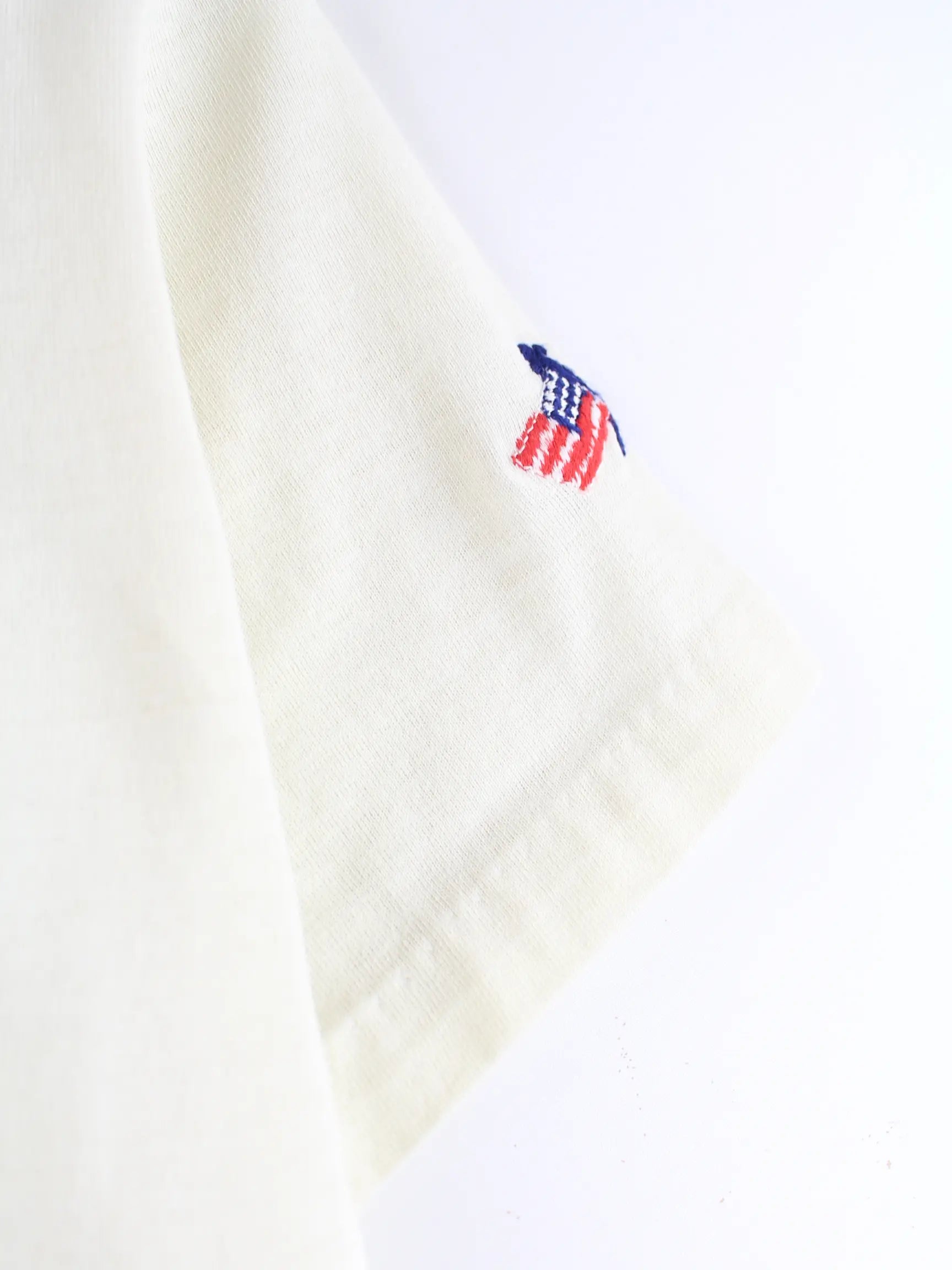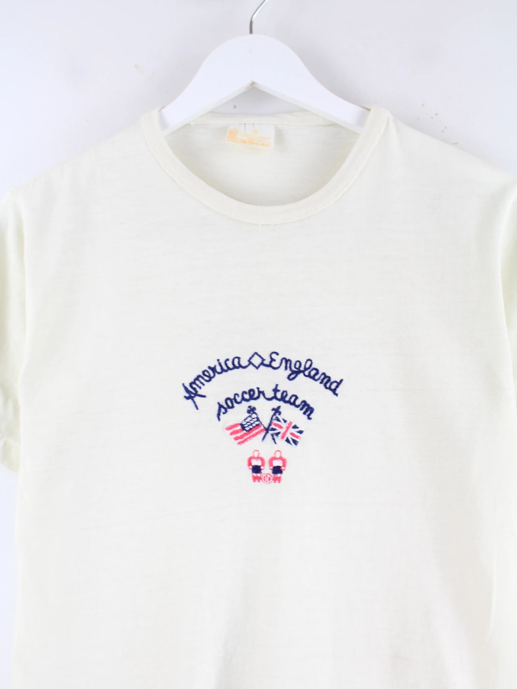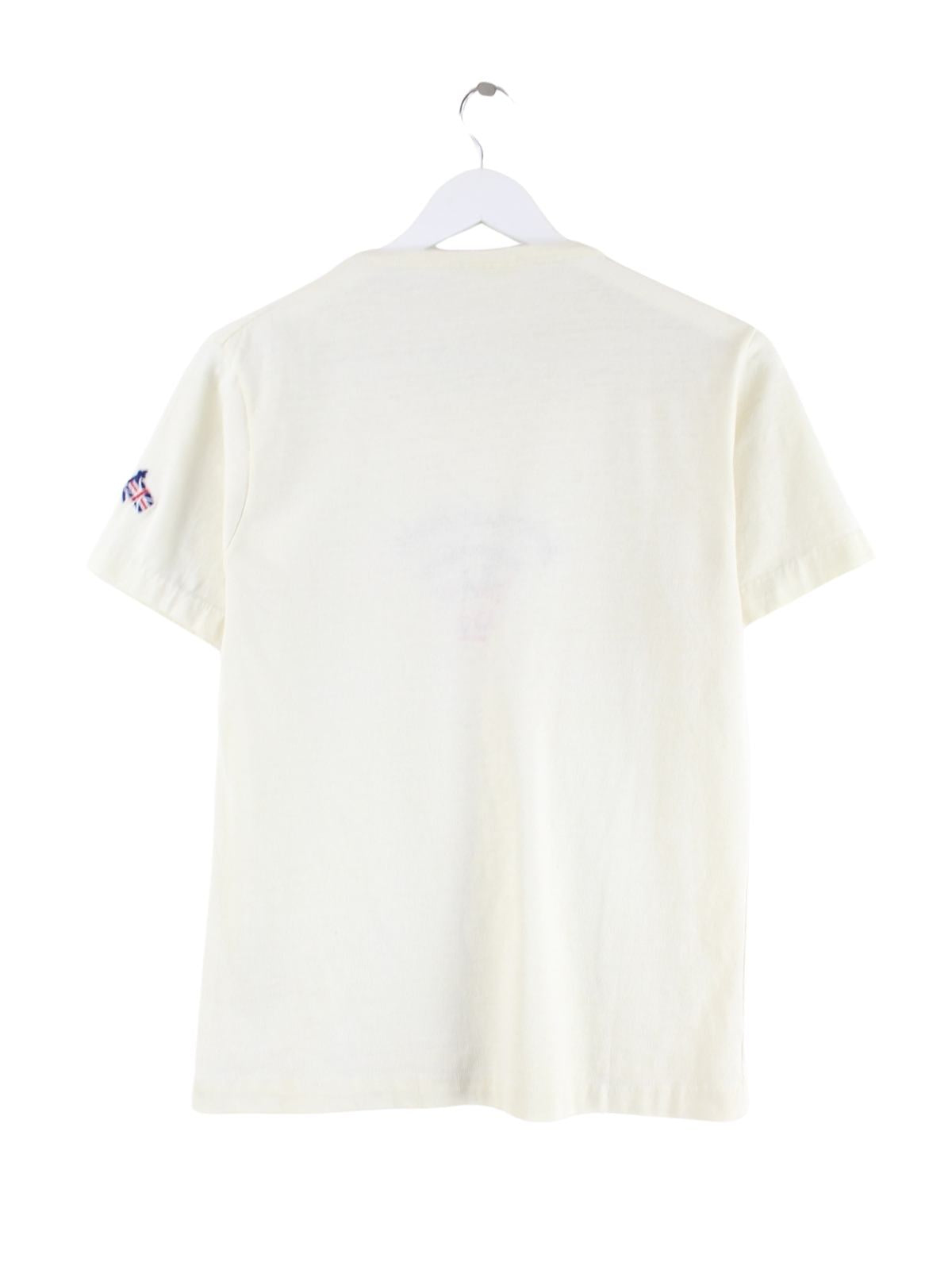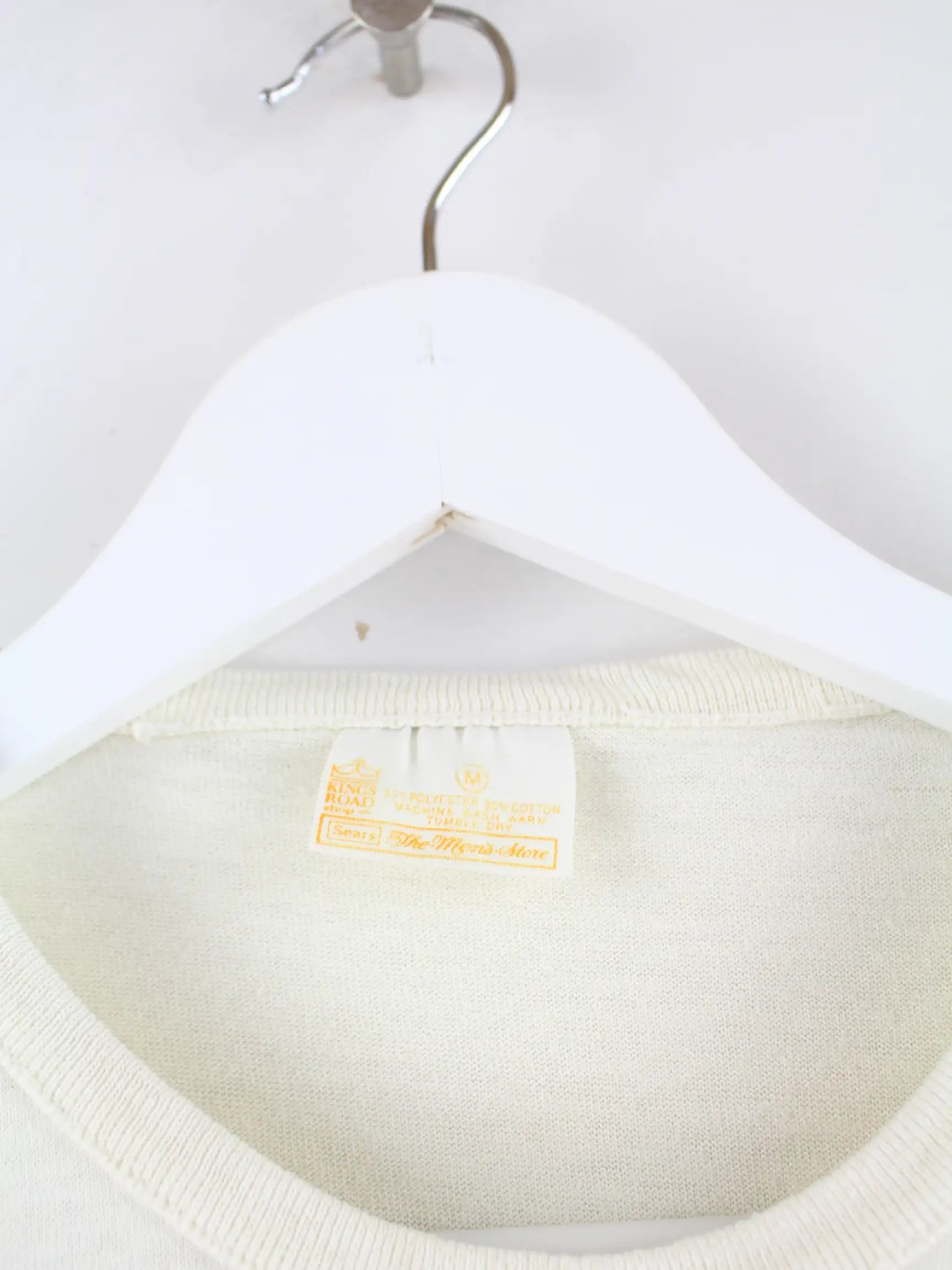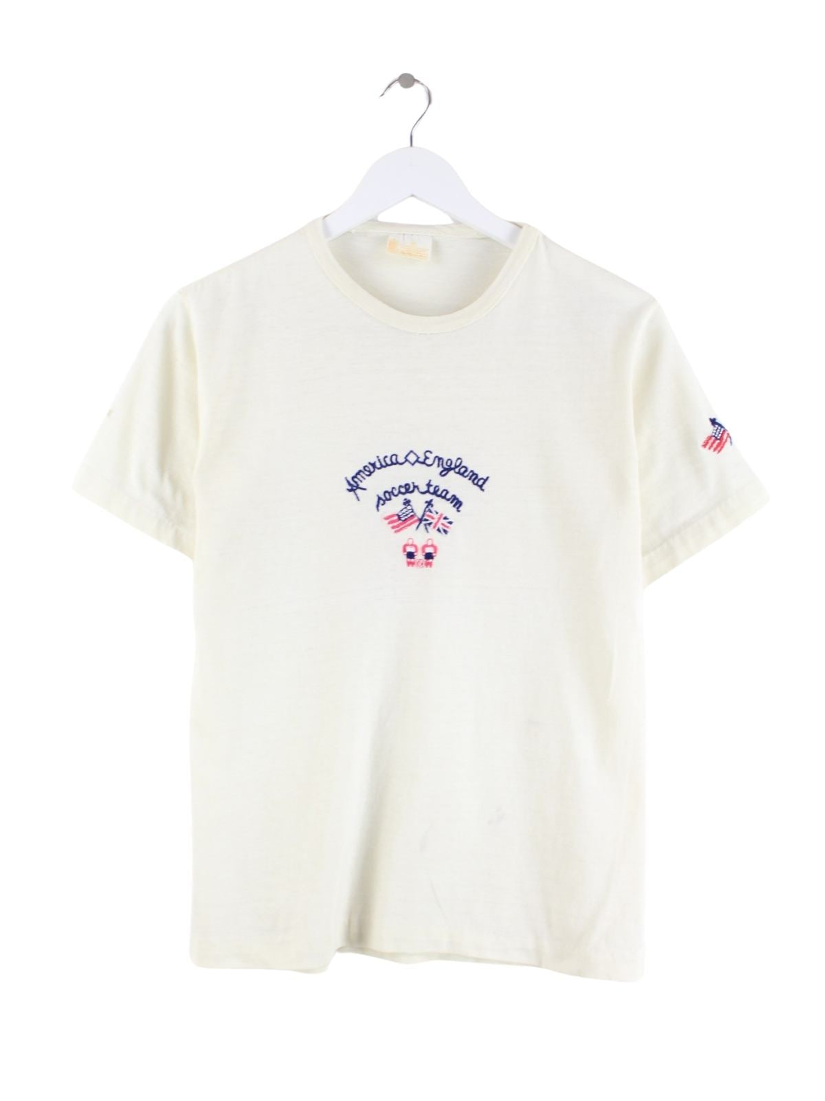 Vintage T-Shirt mit gesticktem Logo in Größe M aus den 80'ern. Es ist aus Baumwolle gemacht und in Weiß vorrätig.