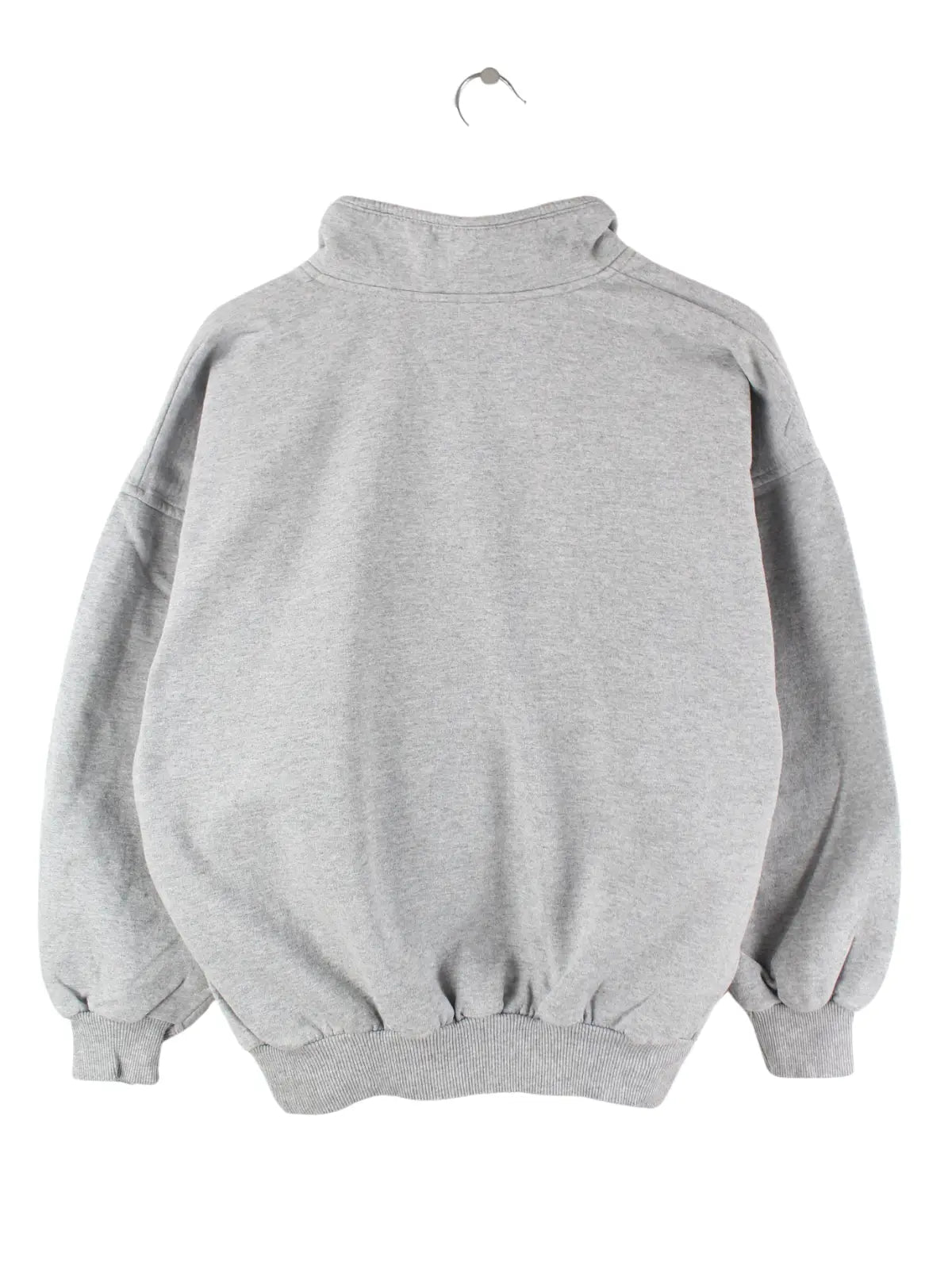 Vintage Sweater mit gesticktem Logo und halbem Reißverschluß in Größe M aus den 90'ern. Er ist aus einer Baumwollmischung hergestellt und in Grau im Bestand.