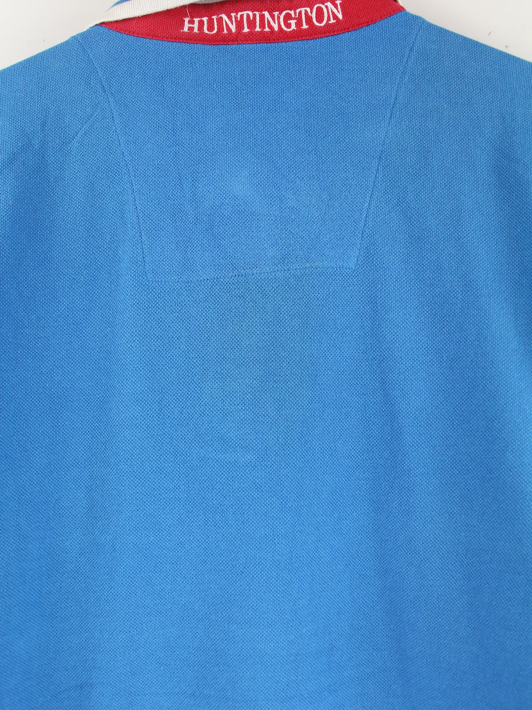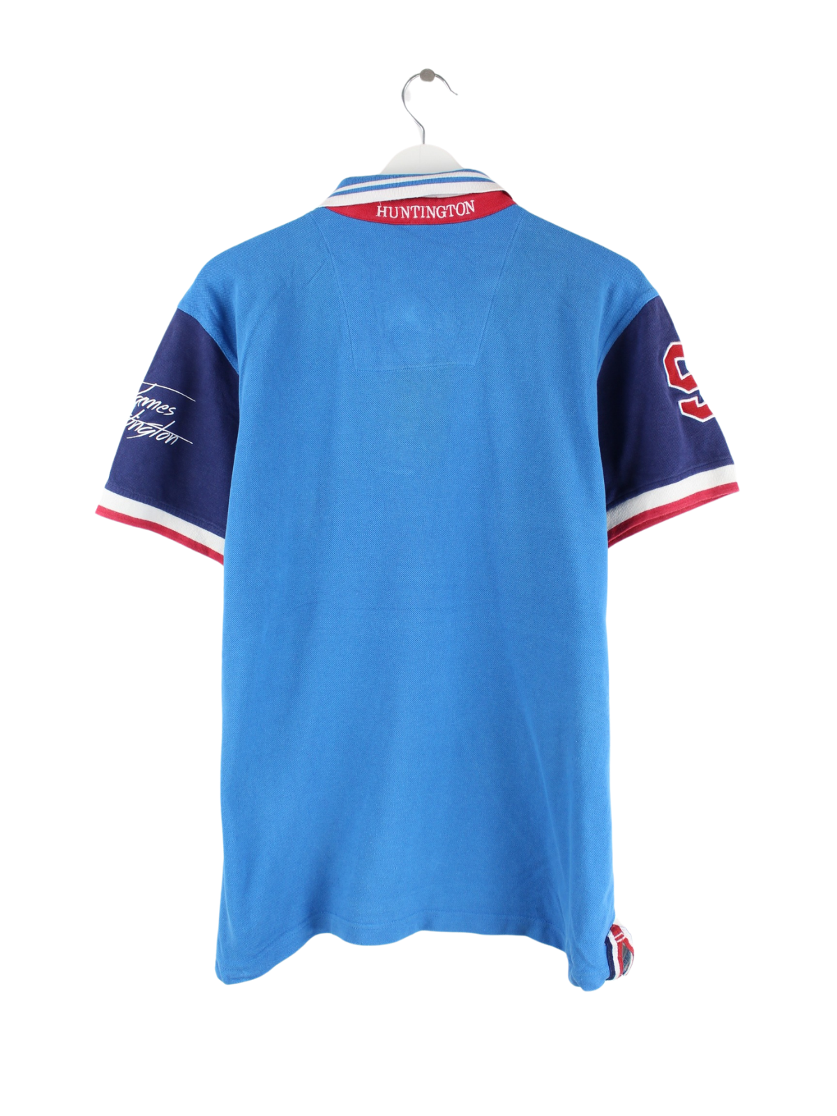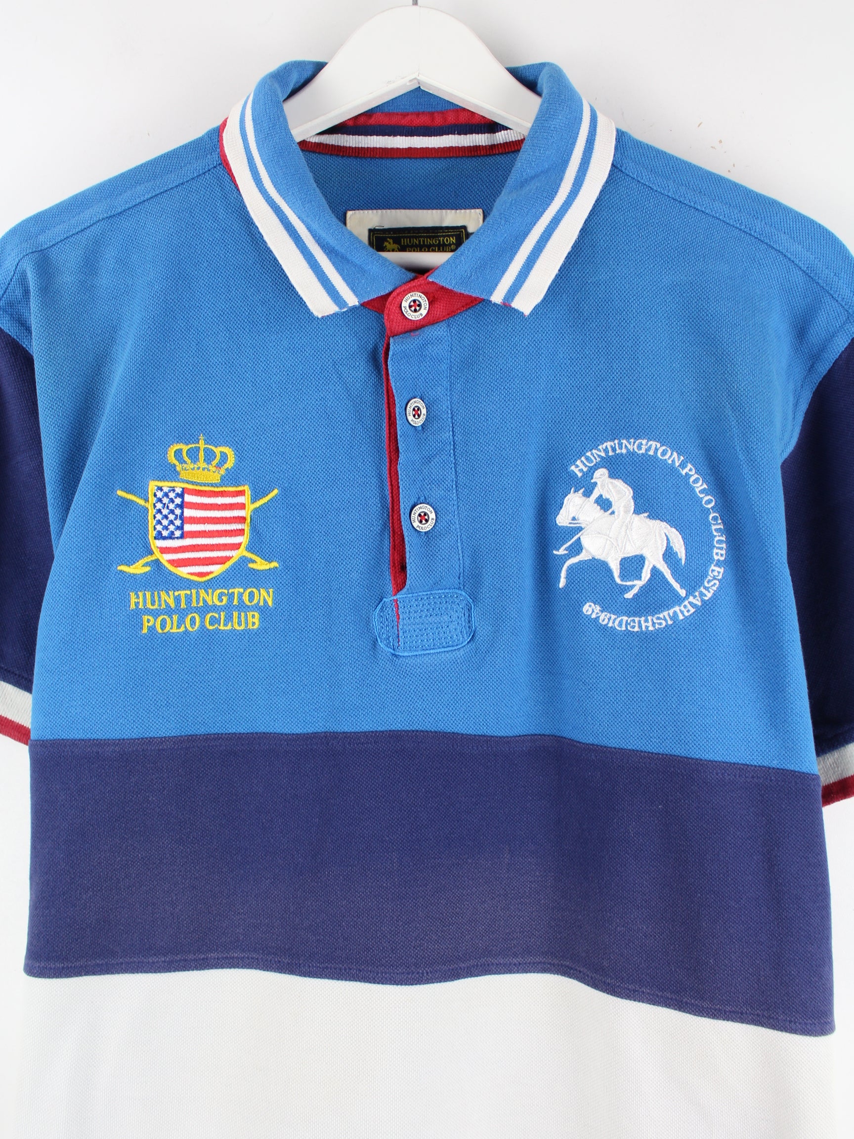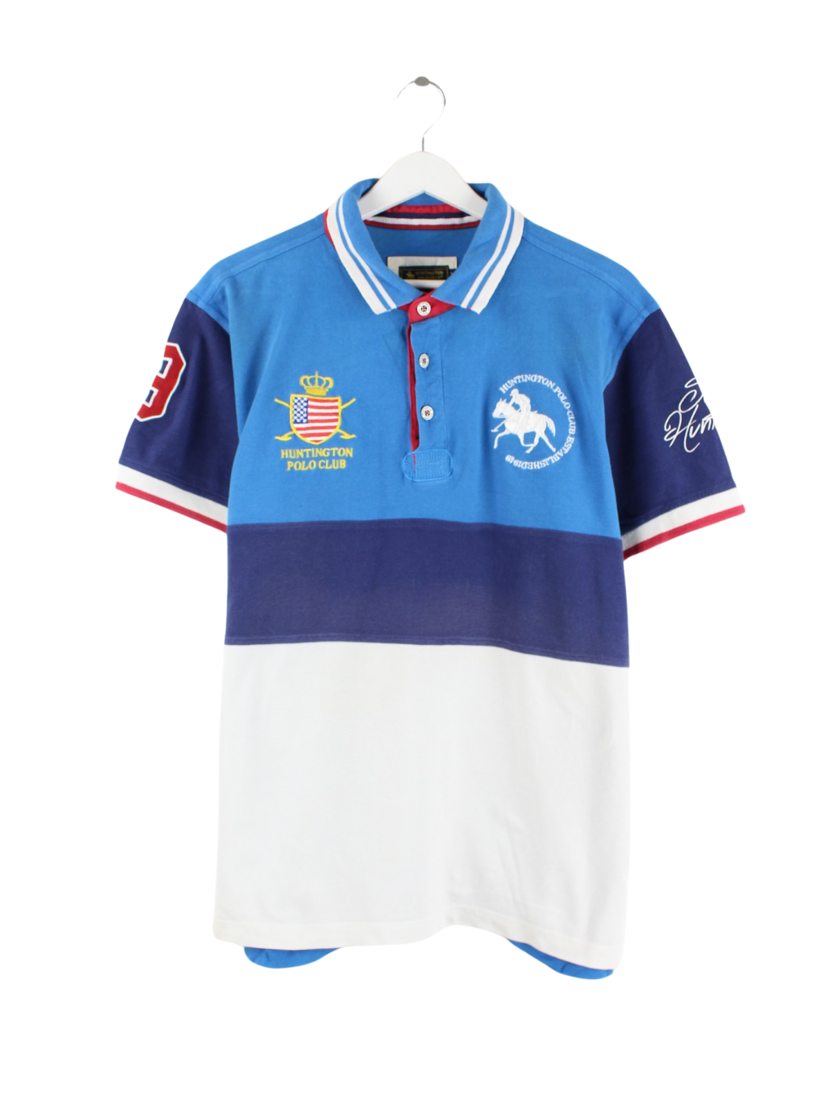 Vintage Poloshirt mit gestickten Motiven in Größe XL. Es ist aus Baumwolle hergestellt und in Blau auf Lager.