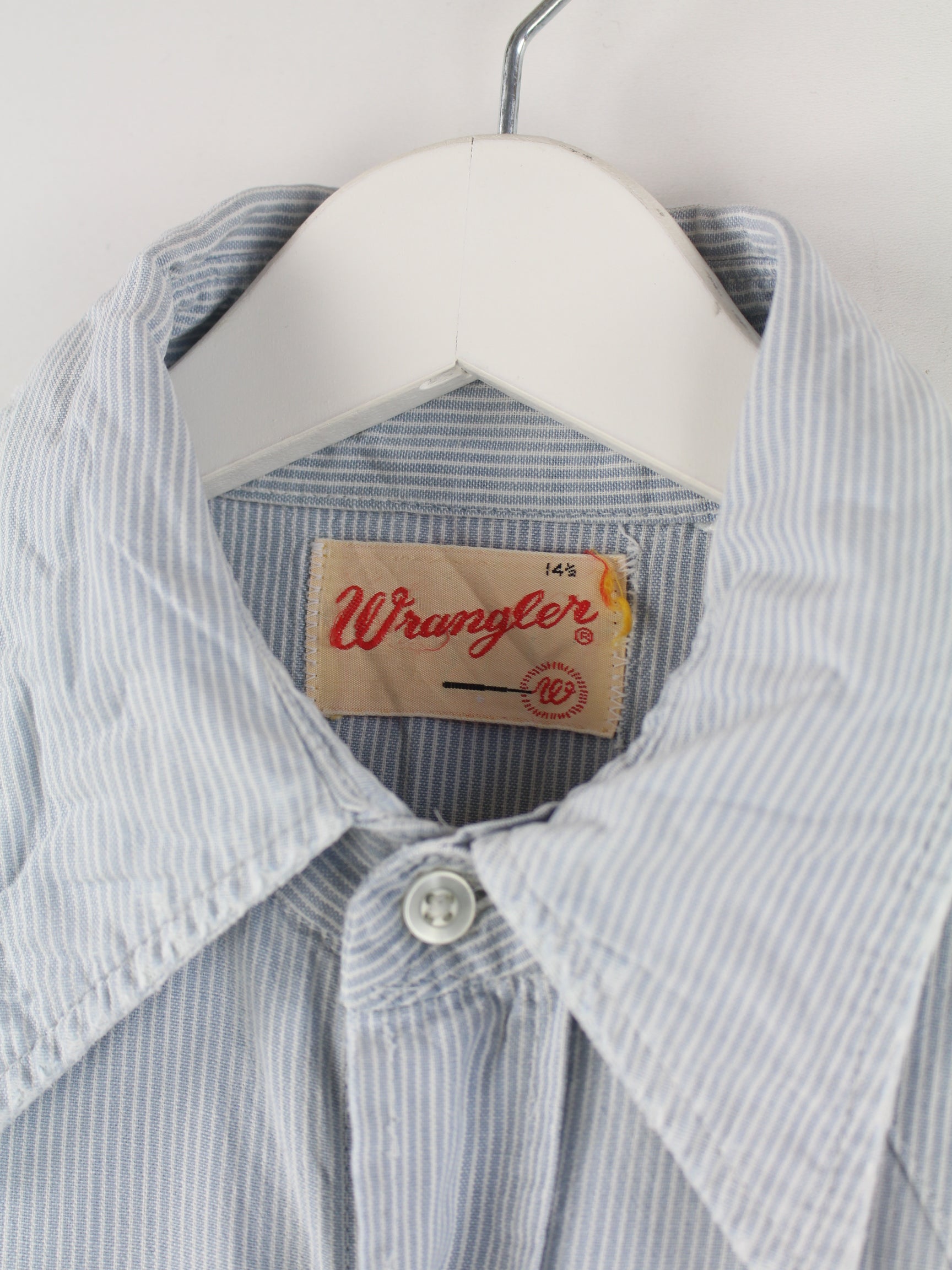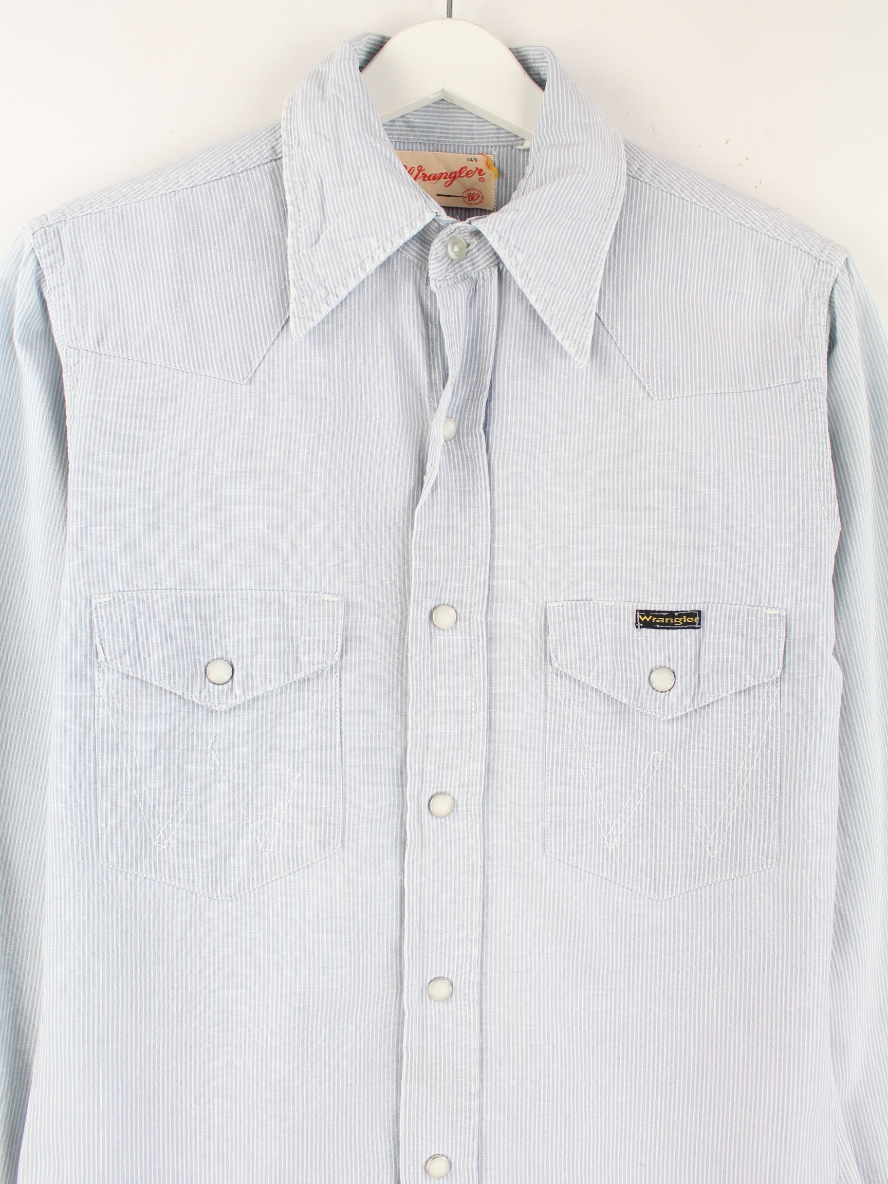Blaues Hemd des Labels Wrangler aus den 80'ern in Größe S. Es ist aus Baumwolle angefertigt und in sehr gutem Zustand in Stock.