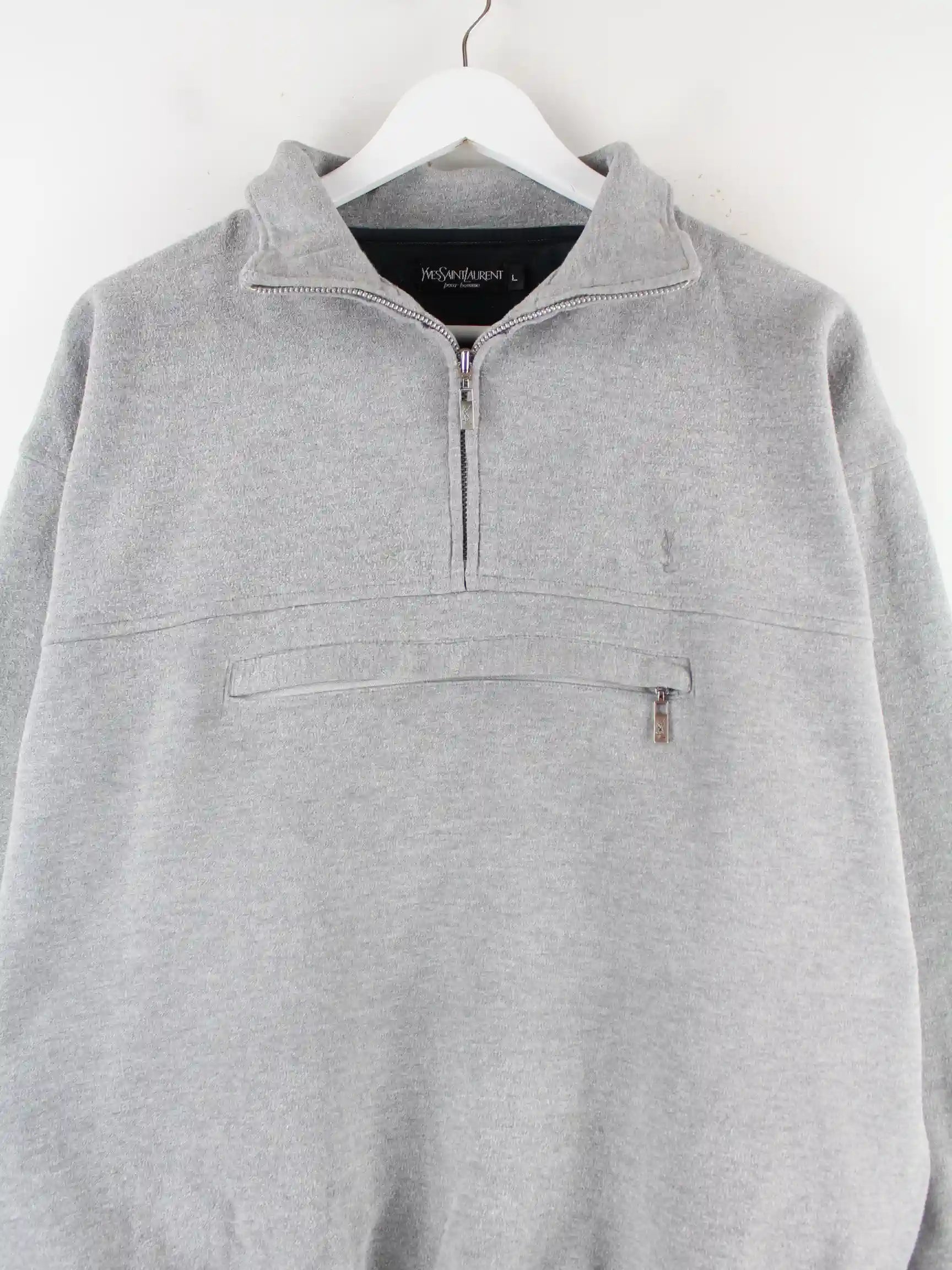 Sweater vom Brand Yves Saint Laurent mit half Zip in Größe L aus den 90'ern. Er ist aus einer Baumwollmischung angefertigt und in Grau lieferbar.