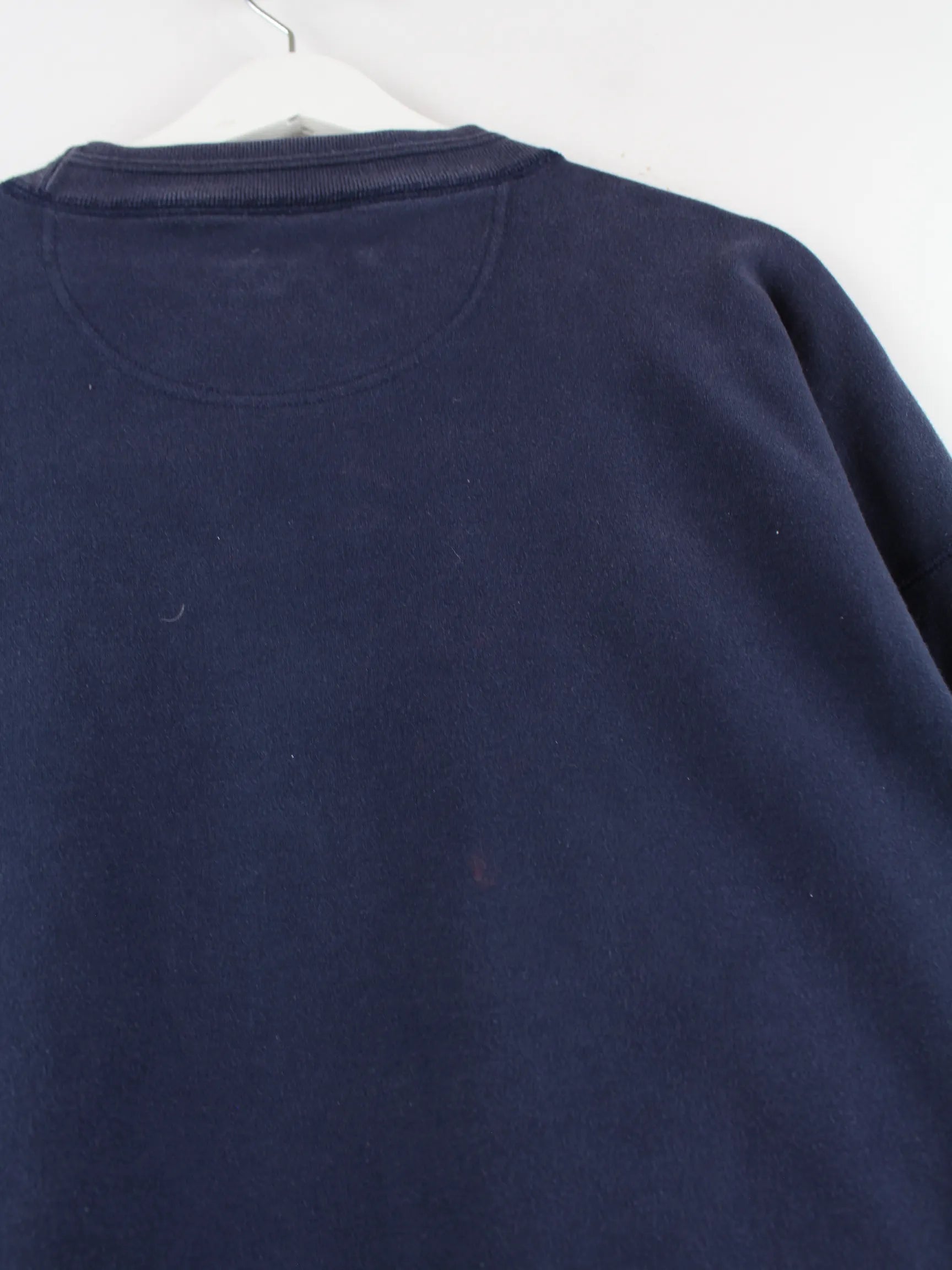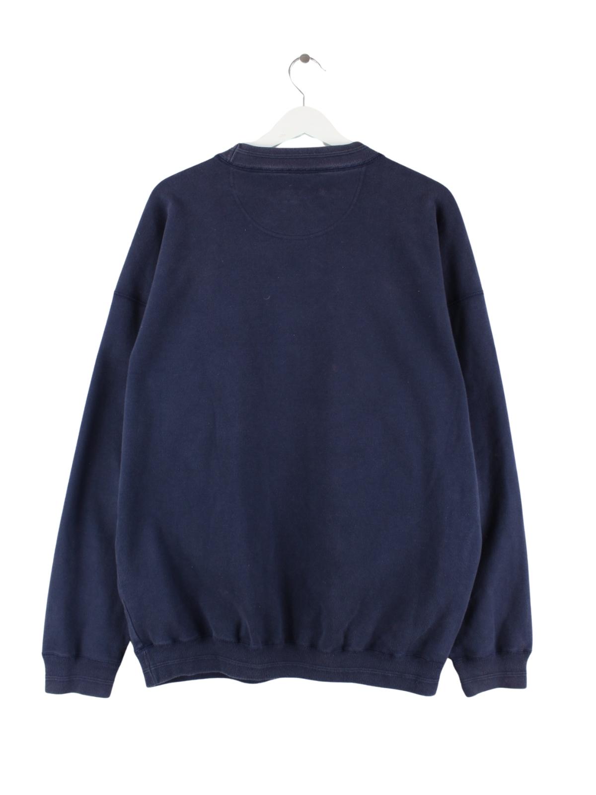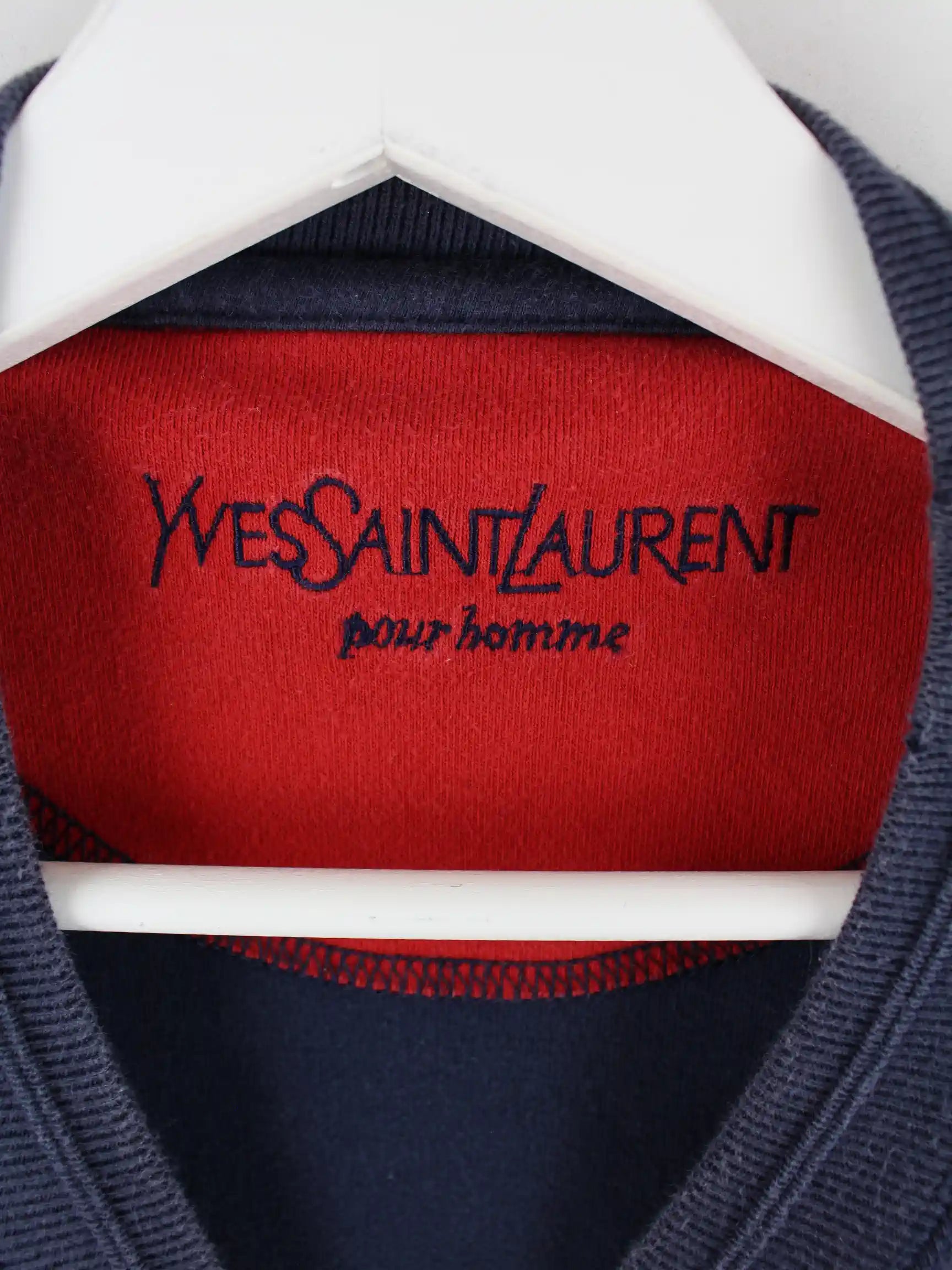 Sweater des Labels Yves Saint Laurent mit gestickten Motiven in Größe XL aus den 90'ern. Er ist aus einer Baumwollmischung angefertigt und in Blau in Stock.