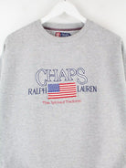 Grauer Sweater mit Stick der Marke Chaps by Ralph Lauren aus den 90'ern in Größe L. Er ist aus einer Baumwollmischung angefertigt und in gutem Zustand zu bekommen.