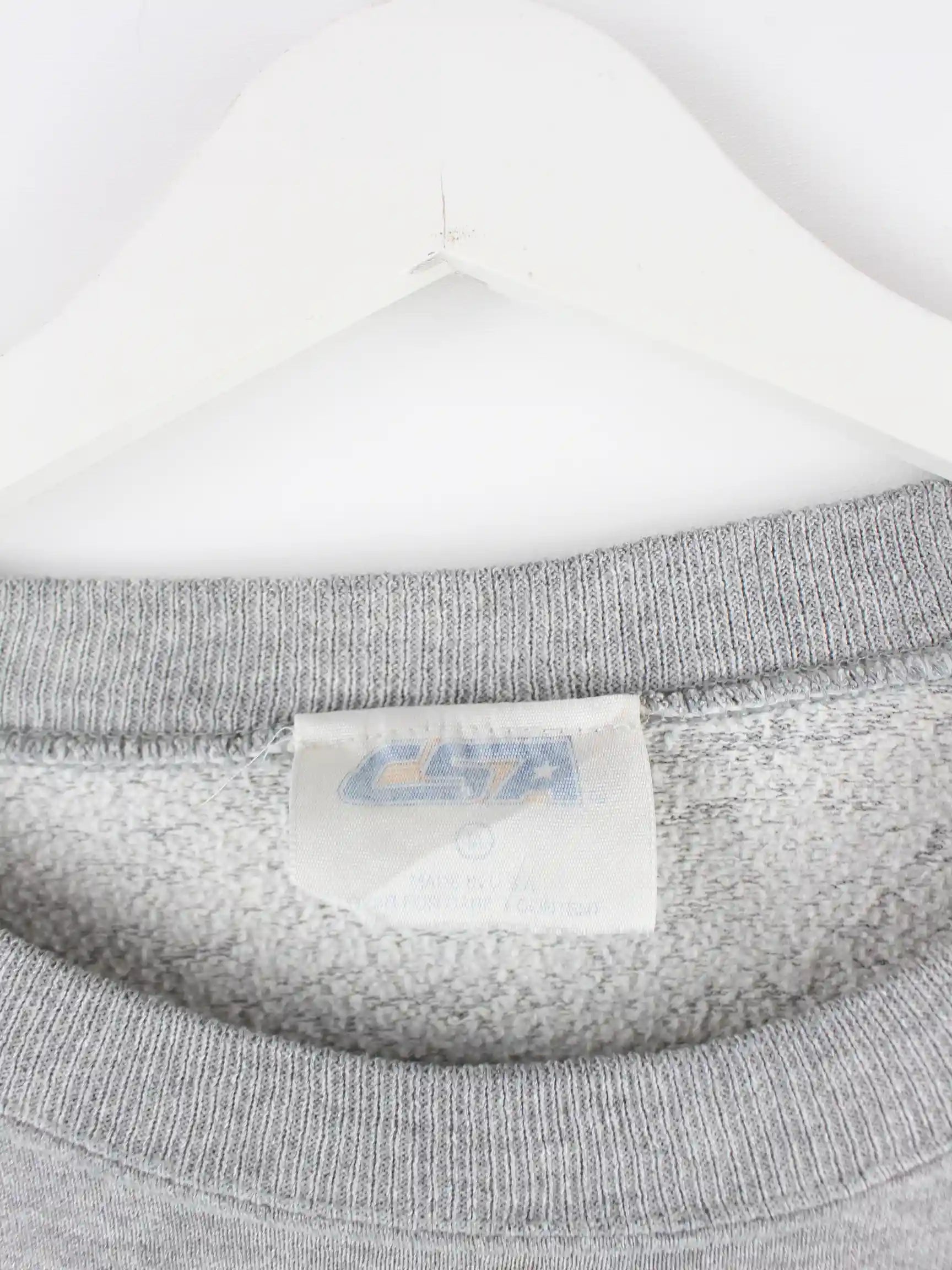Grauer Sweater aus dem Hause CSA aus den 90'ern in Größe M. Er ist aus einer Baumwollmischung gefertigt. Den Zustand würden wir als 'In Ordnung' bezeichnen (vergl. Bilder).Mit schönem Cowboys Print.
