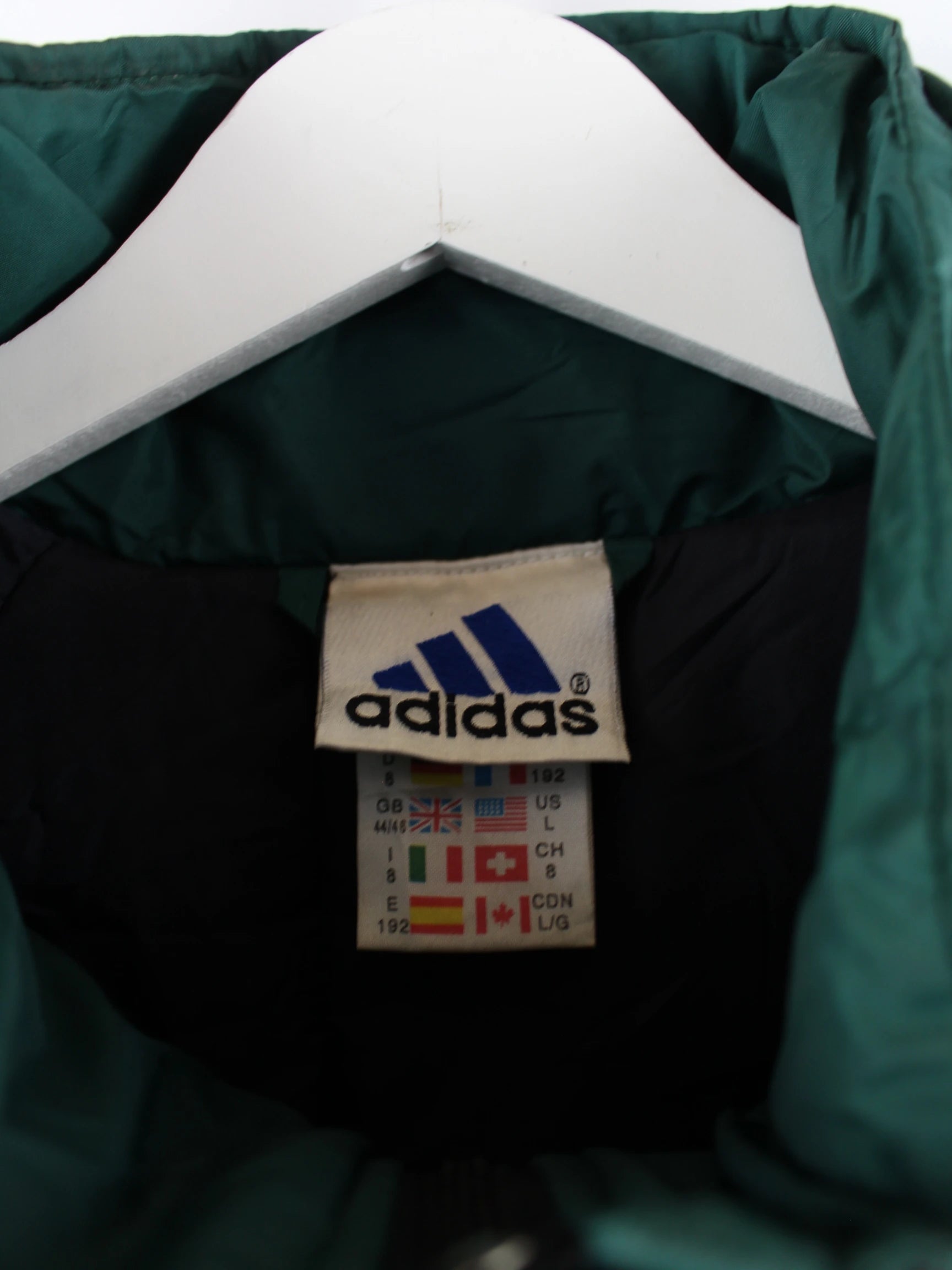 Jacke vom Brand Adidas in Größe 3XL aus den 90'ern. Sie ist aus Synthetik angefertigt und in Schwarz im Bestand.