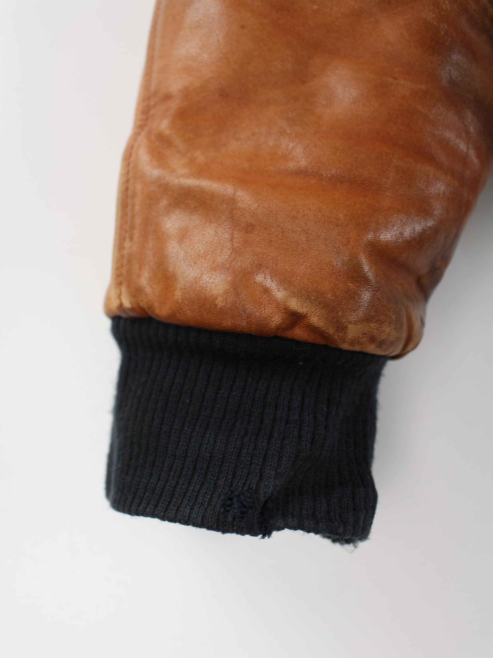 Vintage 1998 Ford F-Series Collegejacke mit braunen Lederärmeln.