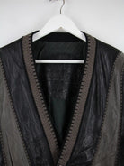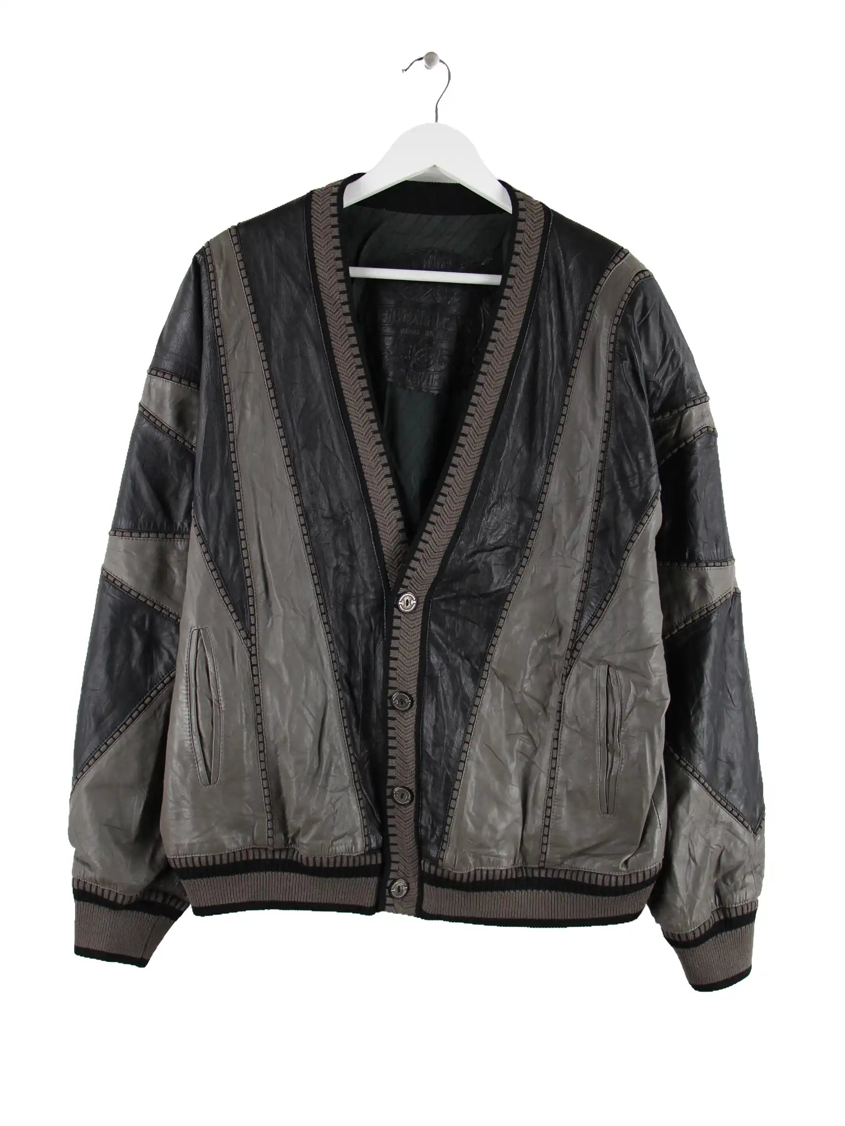 Vintage Jacke in Größe XL aus den 90'ern. Sie ist aus Leder angefertigt und in Grau lieferbar.