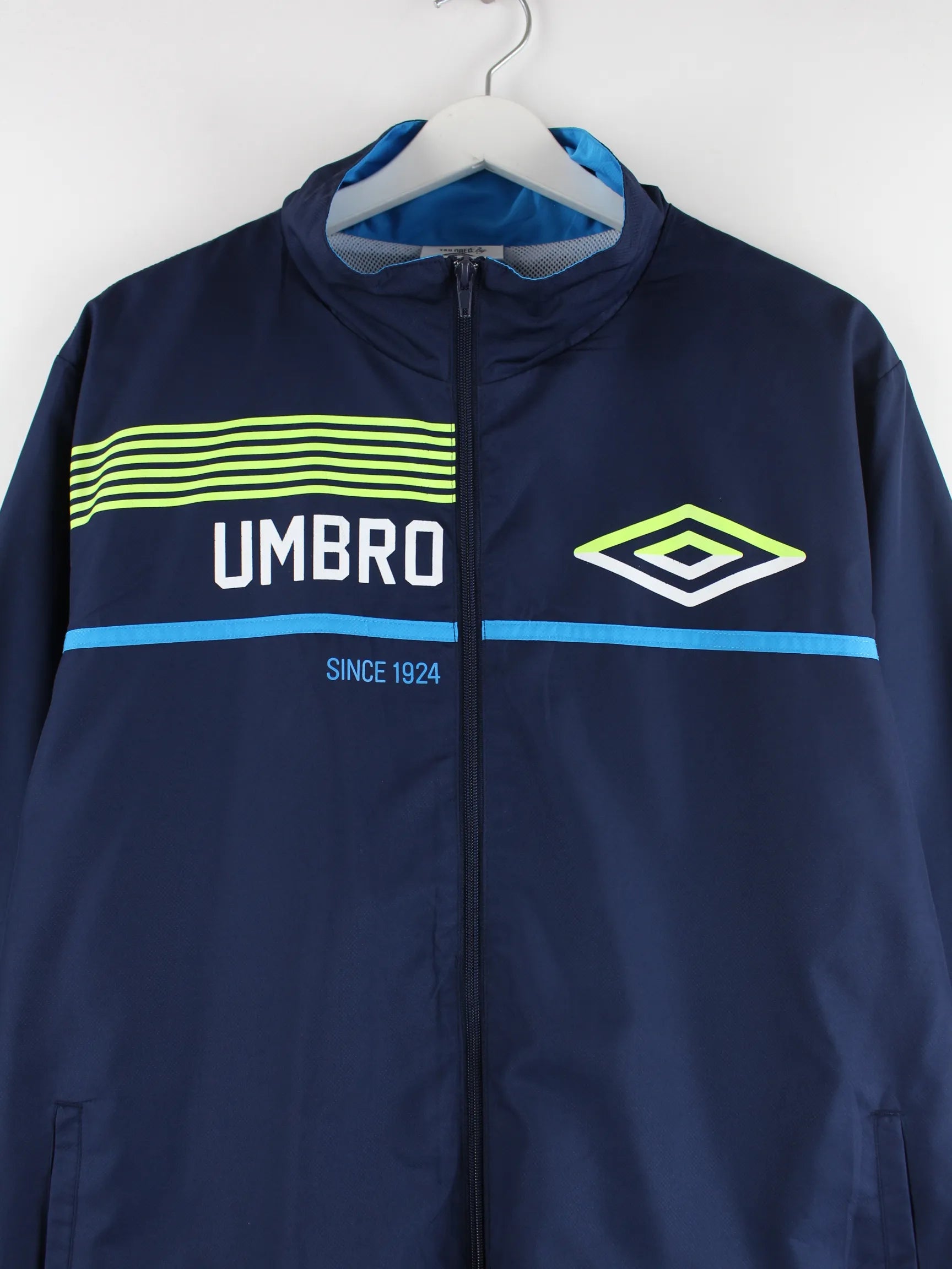 Blaue Trainingsjacke vom Label Umbro in Größe XL. Sie ist aus Synthetik und in sehr gutem Zustand lieferbar. Mit schönem Print.