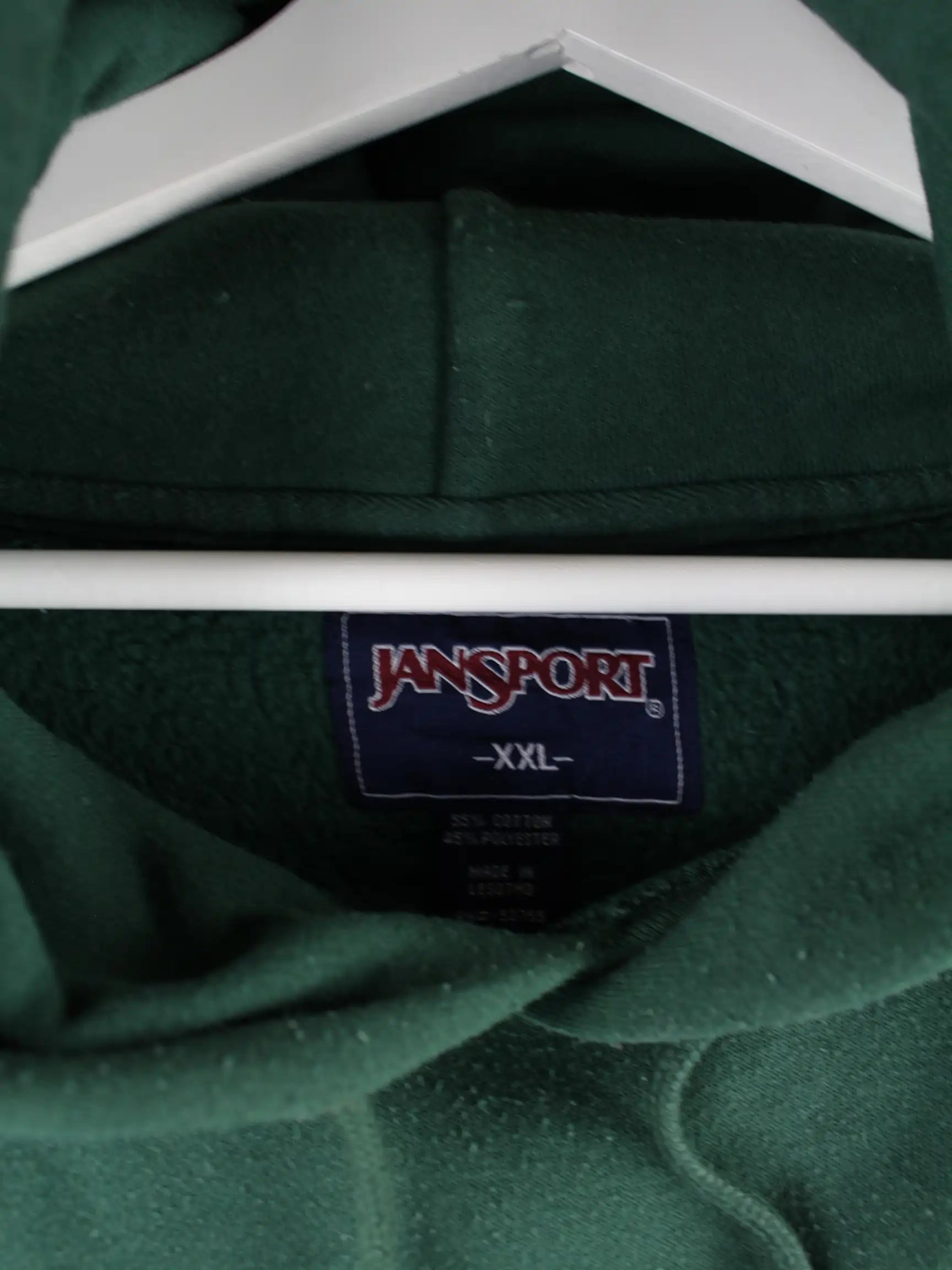 Grüner Hoodie mit gestickten Motiven der Brand Jansport in Größe XXL. Er ist aus einer Baumwollmischung produziert und in sehr gutem Zustand im Angebot.