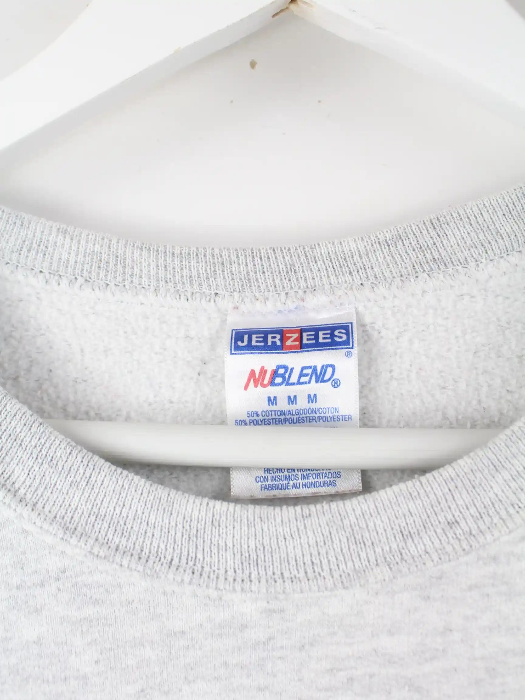 Sweater aus dem Hause Jerzees in Größe M. Er ist aus einer Baumwollmischung gefertigt und in Grau auf Lager. Mit schickem University Print.