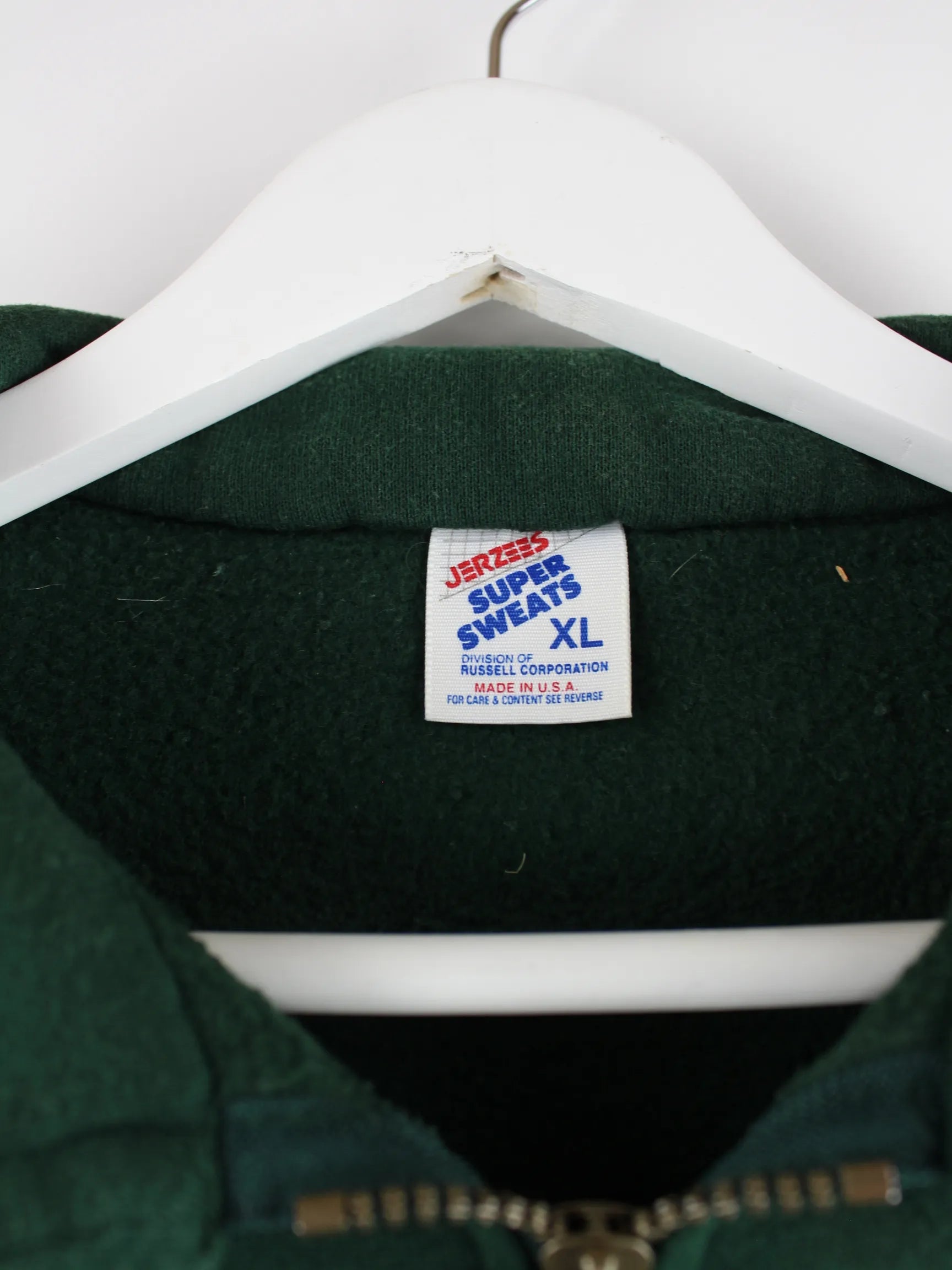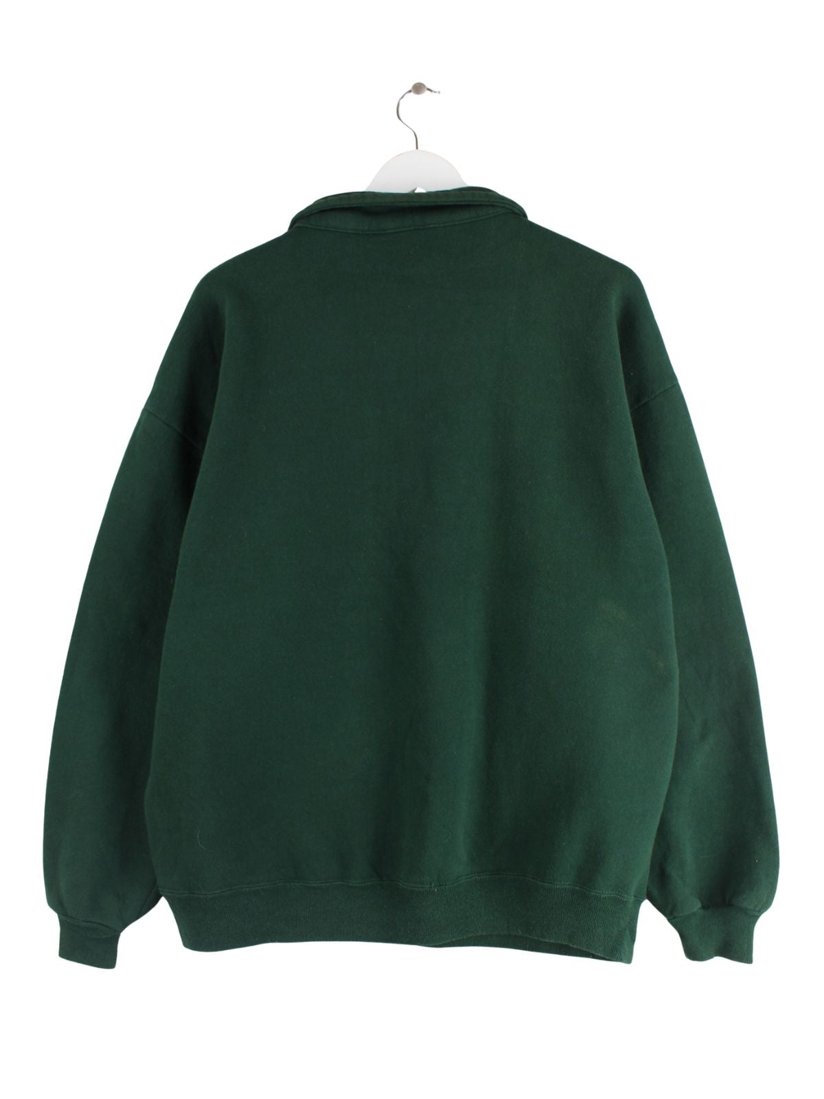 Sweater der Marke Jerzees mit halbem Reißverschluß in Größe XL. Er ist aus einer Baumwollmischung und in Grün in Stock.