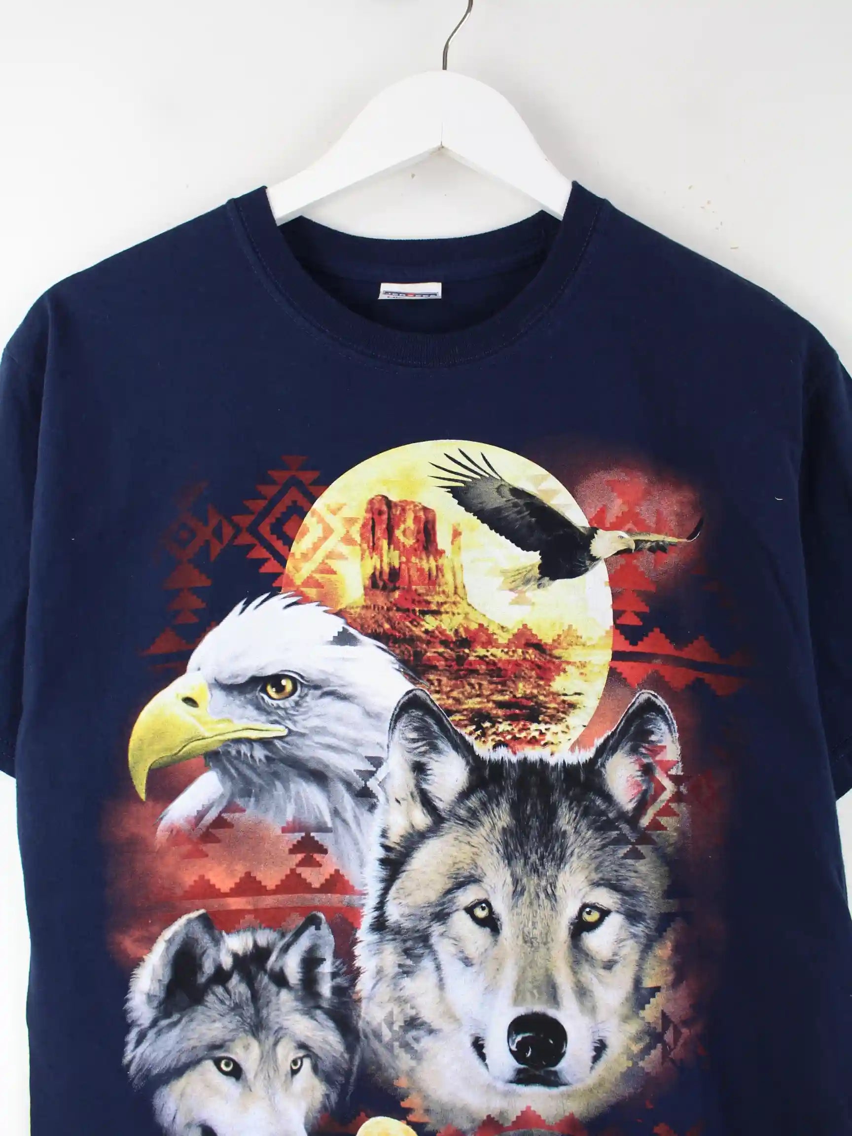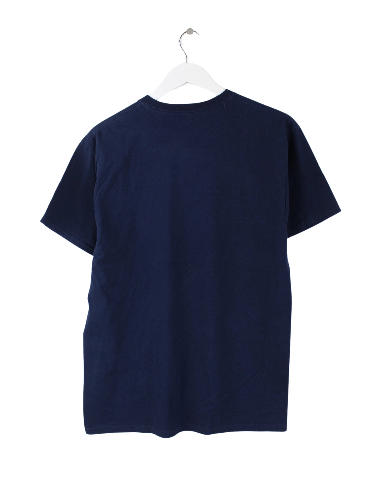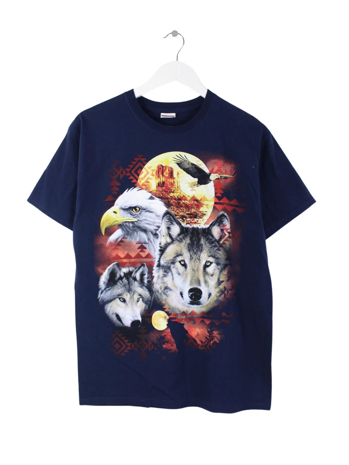 Blaues T-Shirt der Brand Jerzees in Größe L. Es ist aus Baumwolle und in sehr gutem Zustand bei uns zu bekommen. Mit tollem Animal Print.