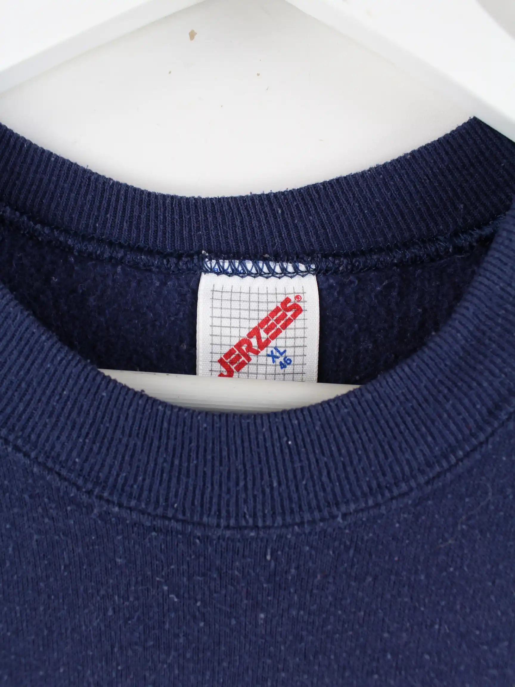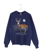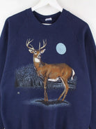 Sweater vom Brand Jerzees in Größe XL aus den 90'ern. Er ist aus einer Baumwollmischung angefertigt und in Blau bei uns zu bekommen. Mit schönem Deer Print.