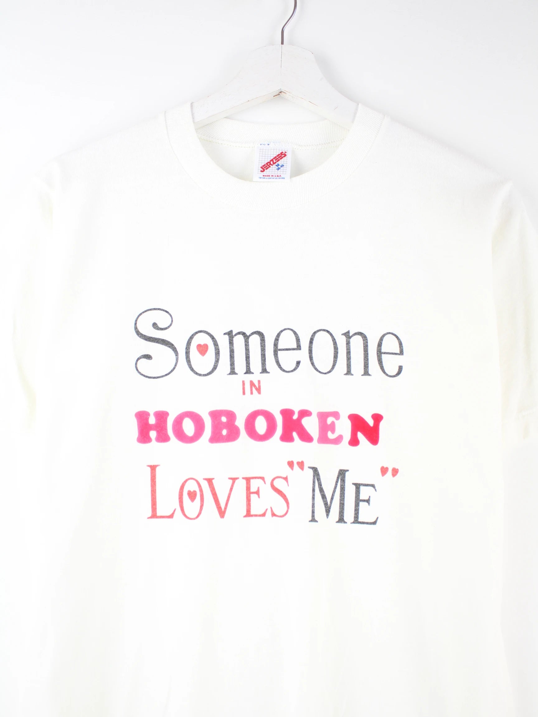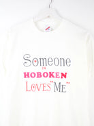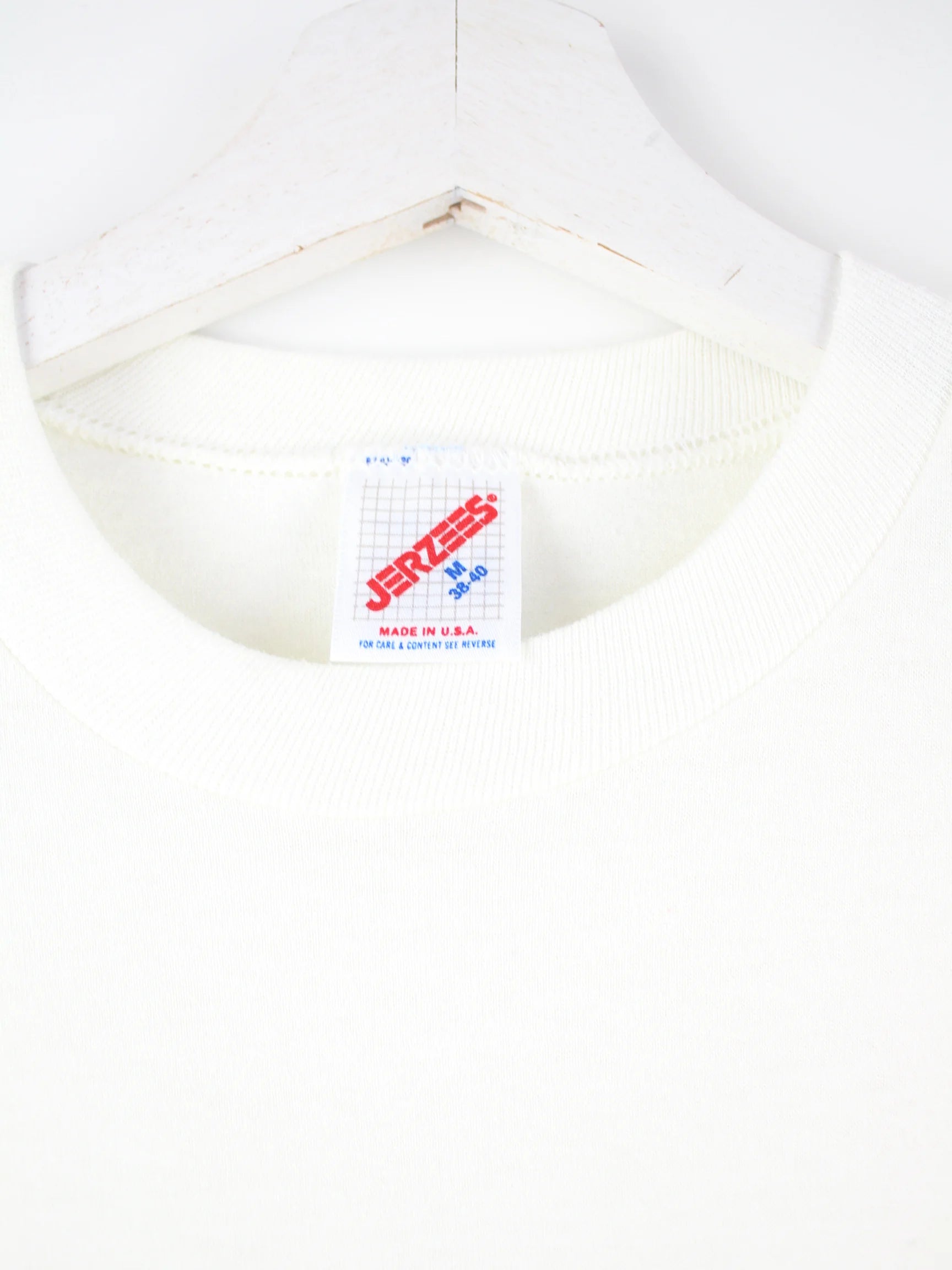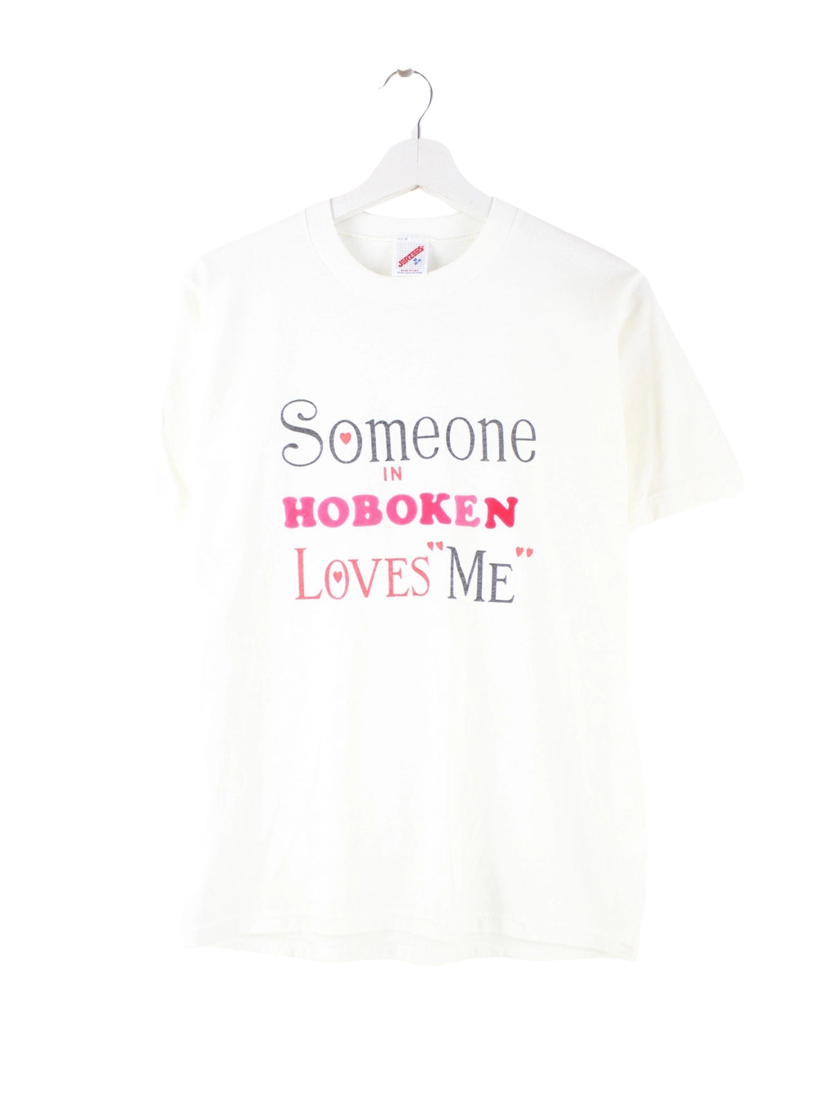 Weißes T-Shirt der Brand Jerzees aus den 90'ern in Größe M. Es ist aus Baumwolle angefertigt und in gutem Zustand vorrätig. Mit schönem Love Print.