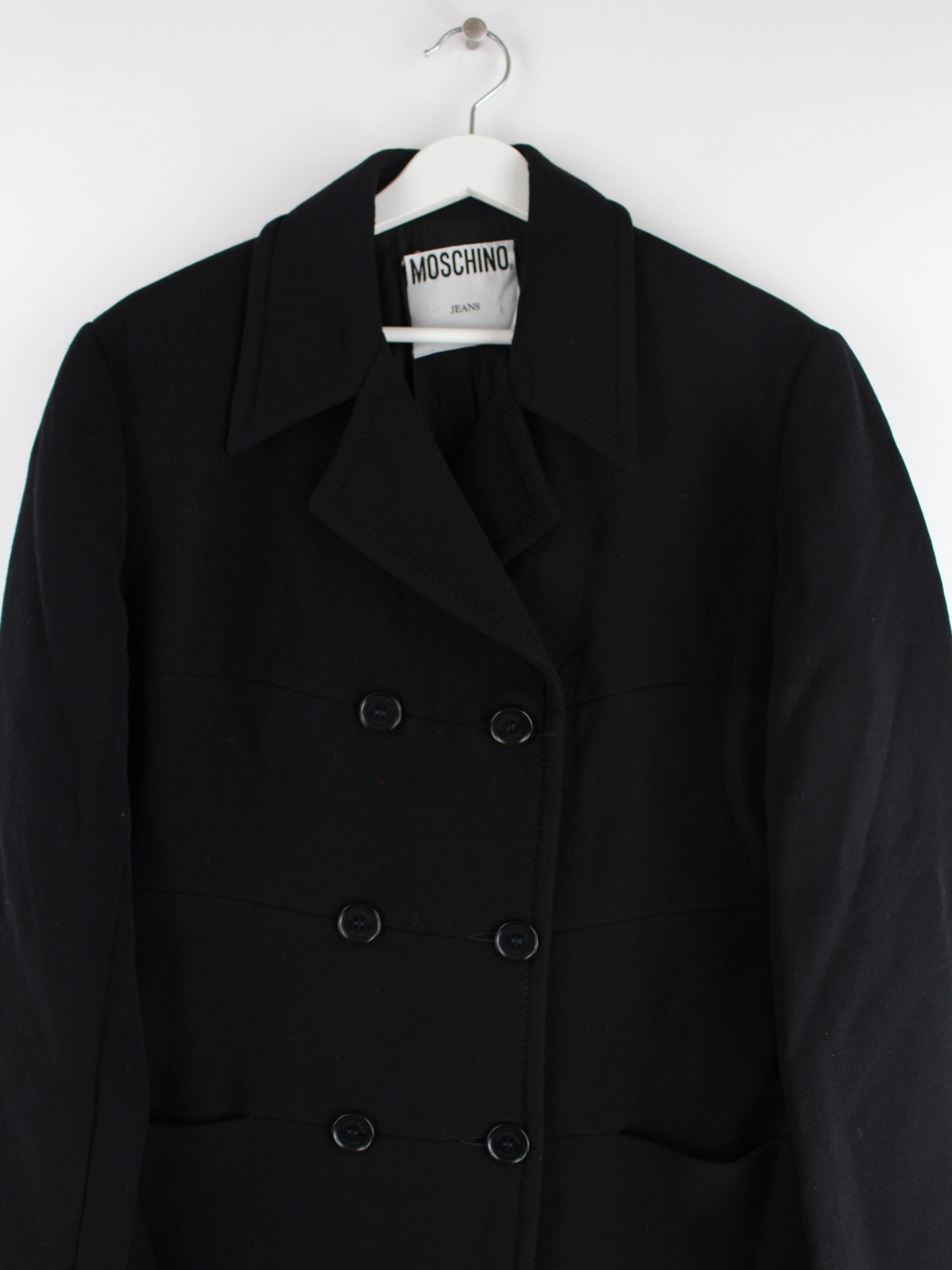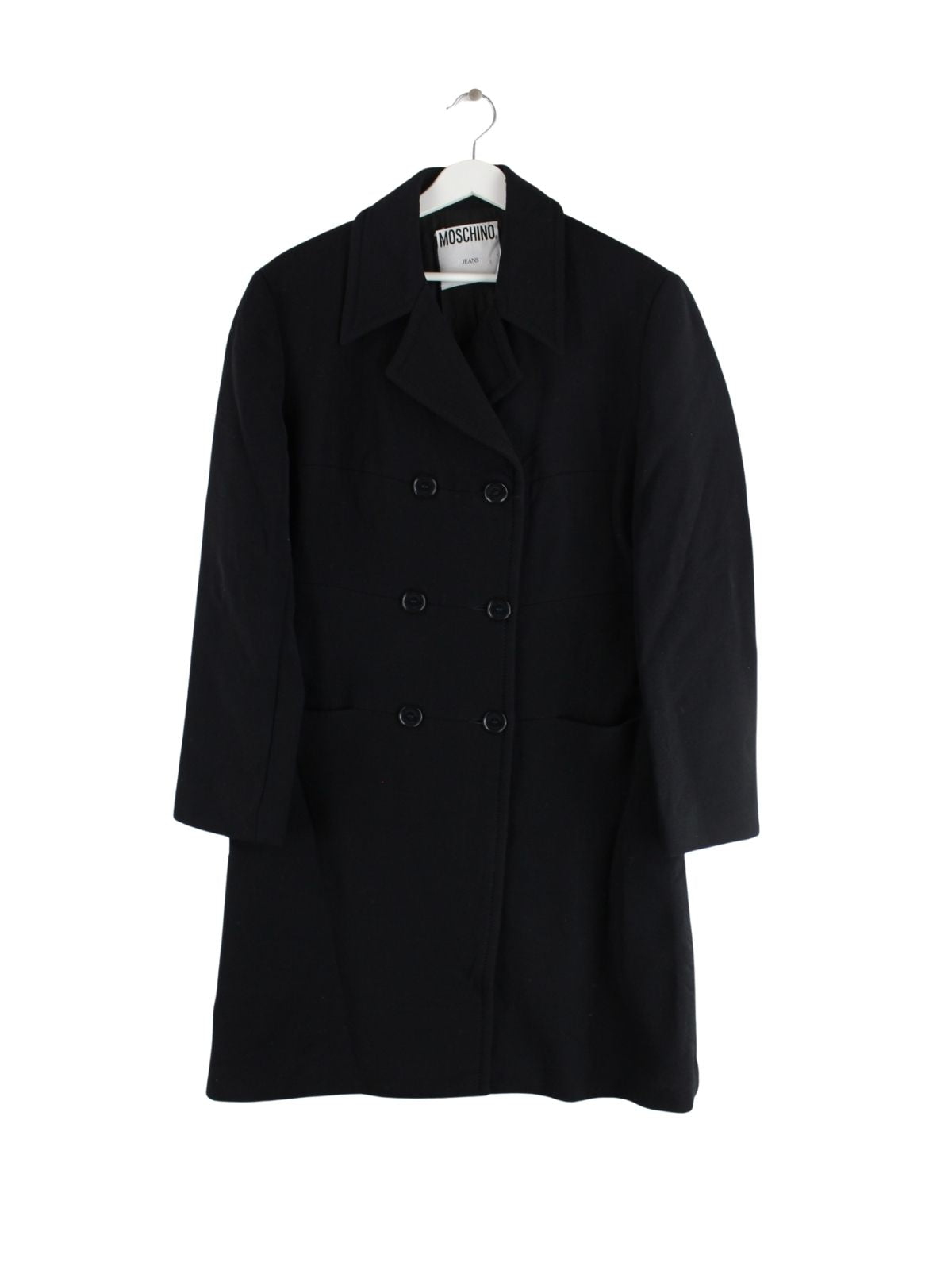 Schwarzer Mantel vom Brand Moschino in Größe M. Er ist aus einer Baumwollmischung produziert und in sehr gutem Zustand auf Lager.