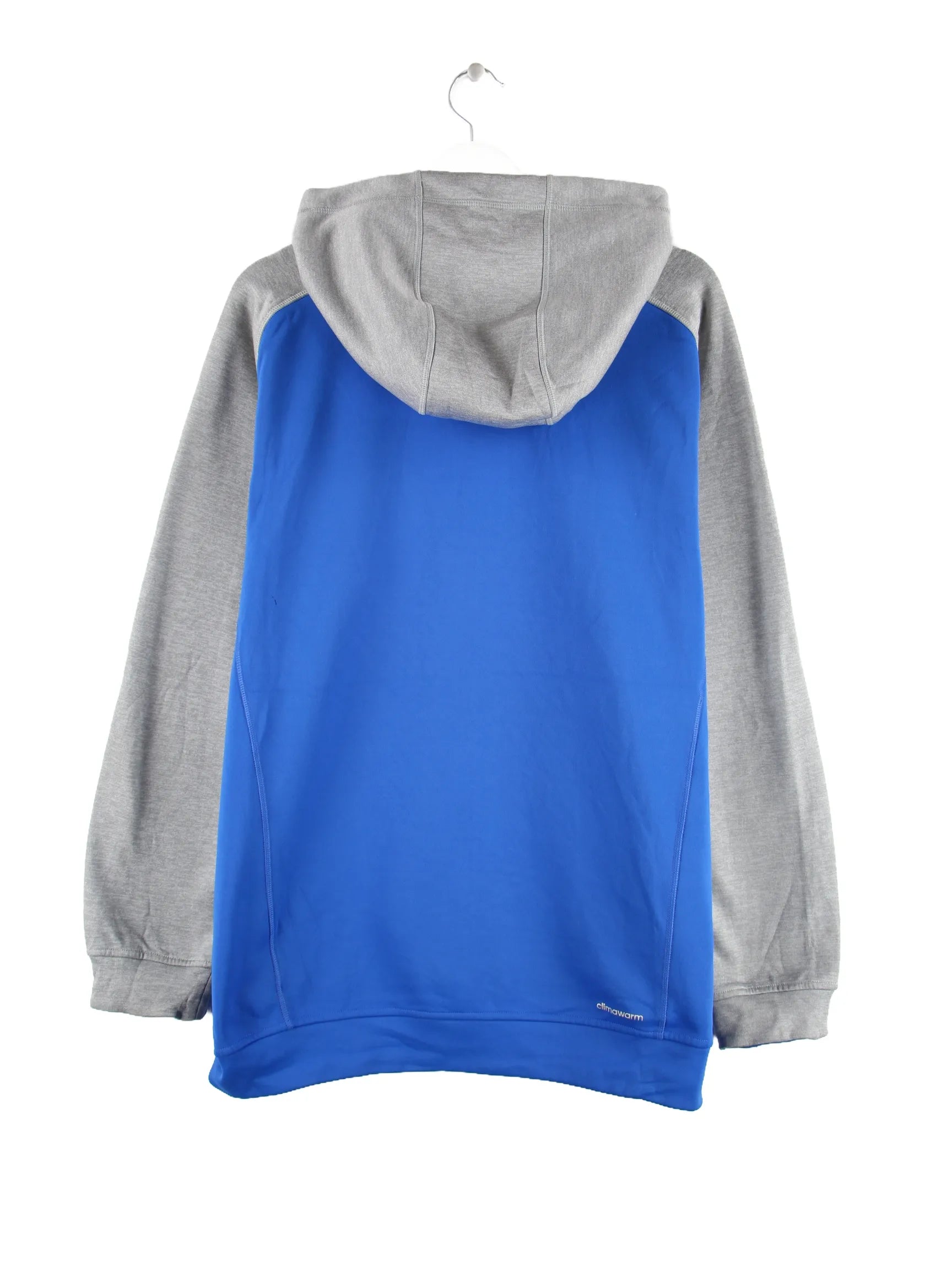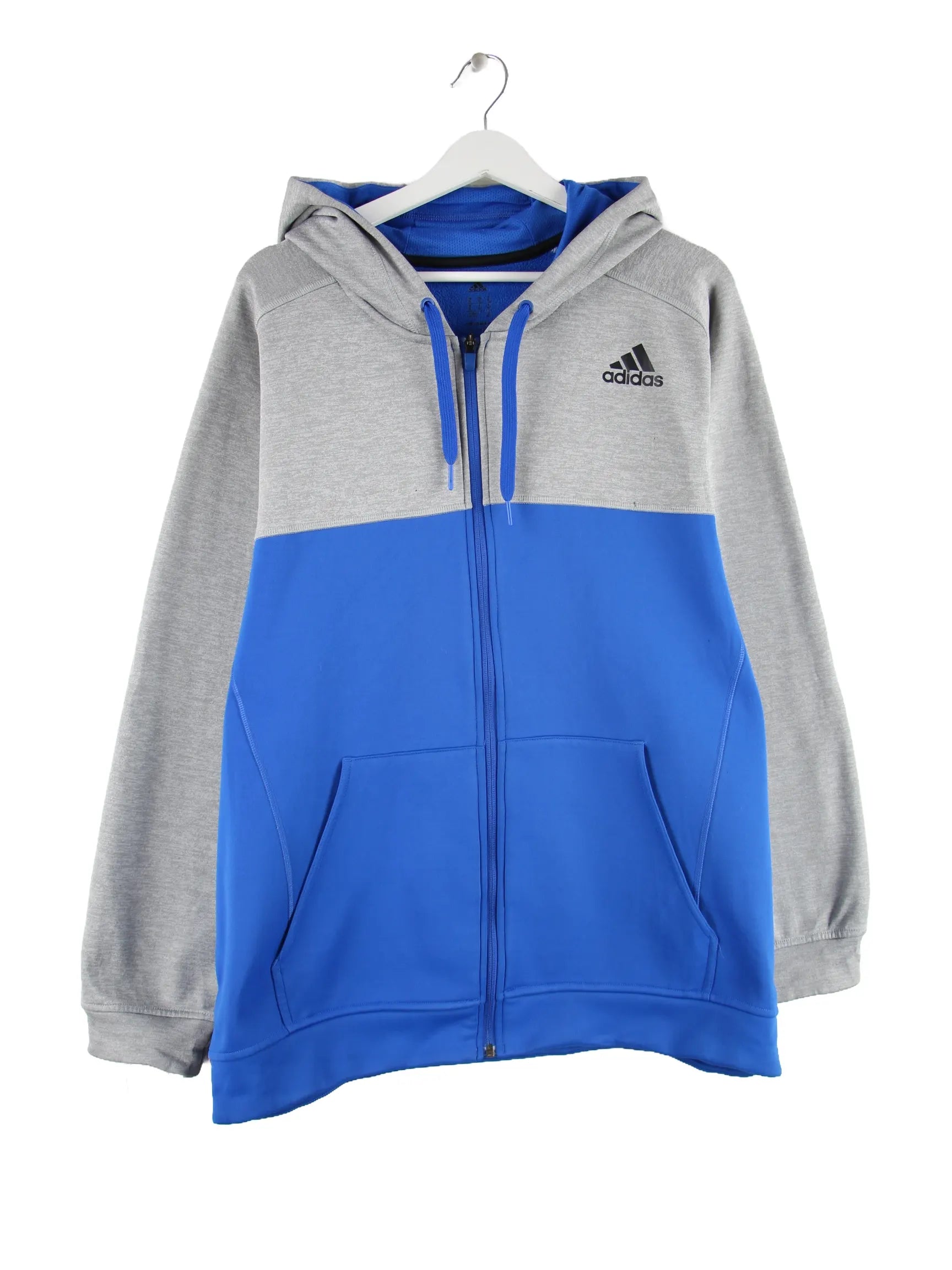 Blauer Hoodie mit durchgehendem Reißverschluß der Marke Adidas in Größe XL. Er ist aus einer Baumwollmischung hergestellt und in gutem Zustand auf Lager.