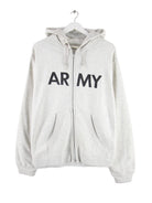 Vintage Hoodie mit durchgehendem Reißverschluß in Größe L. Er ist aus einer Baumwollmischung gemacht und in Grau im Bestand. Mit chiquem Army Print.