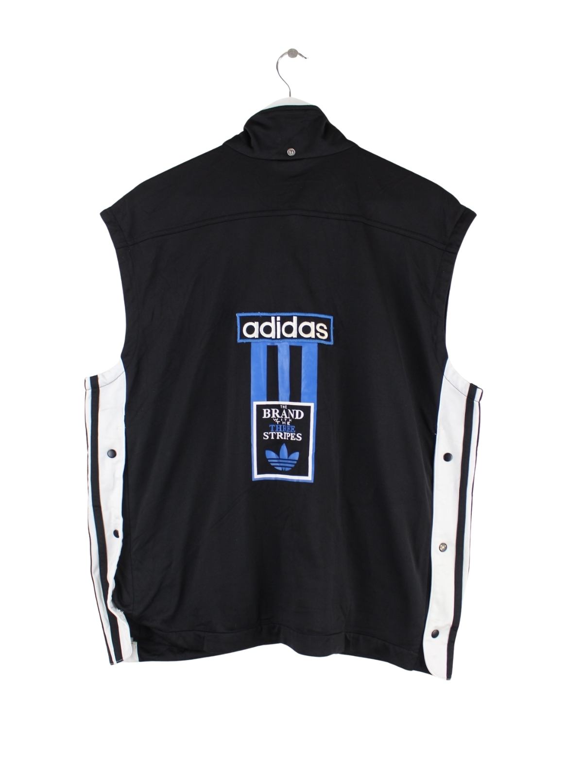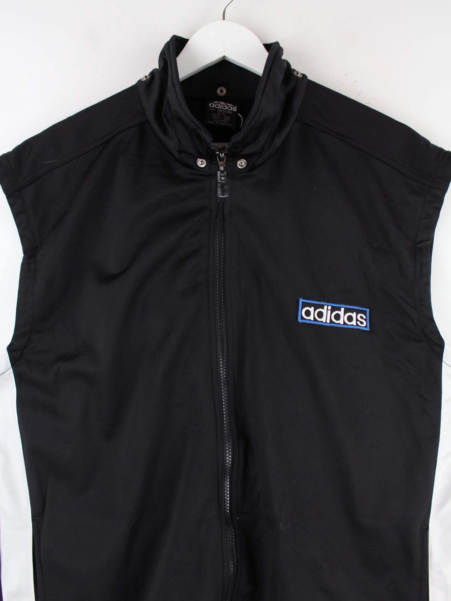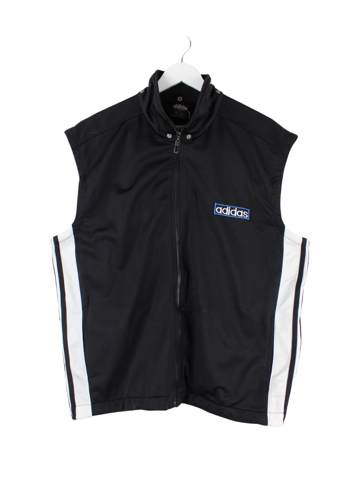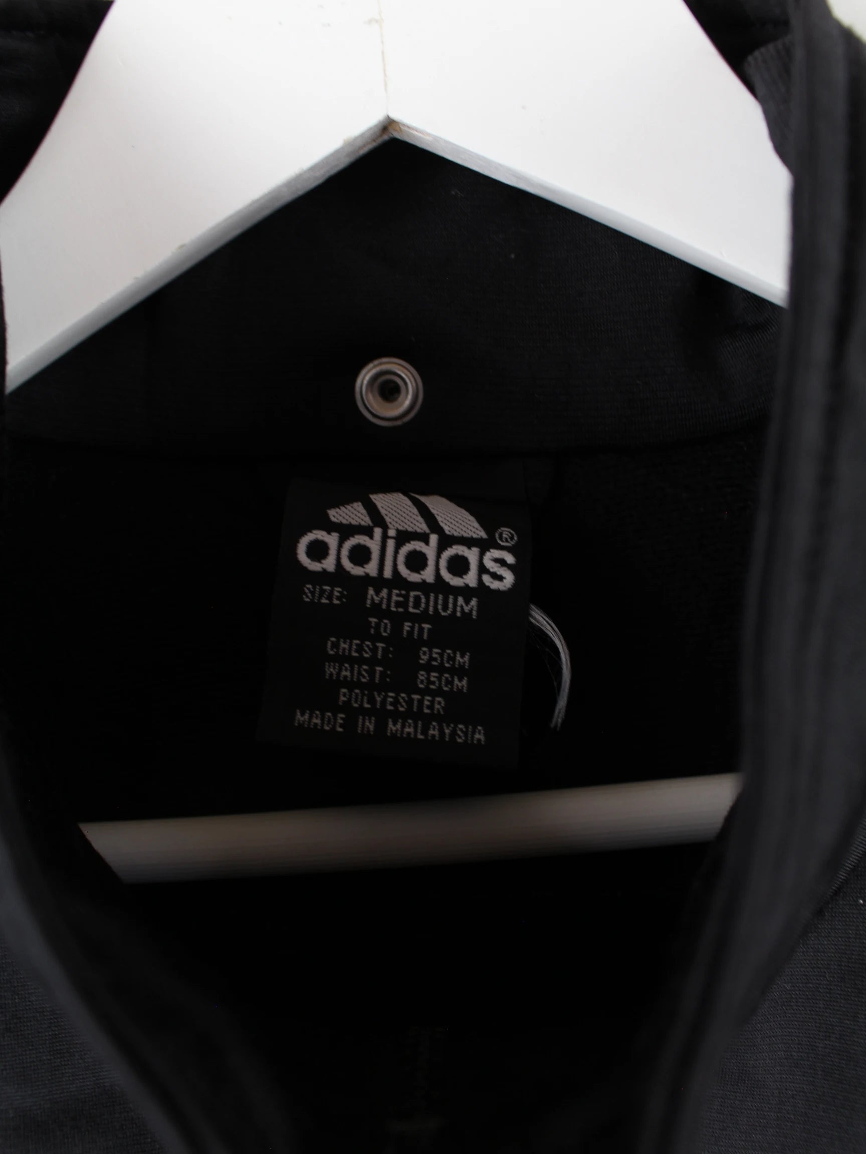 Trainingsjacke vom Label Adidas mit gestickten Motiven in Größe M aus den 90'ern. Sie ist aus Synthetik gefertigt und in Schwarz vorrätig.