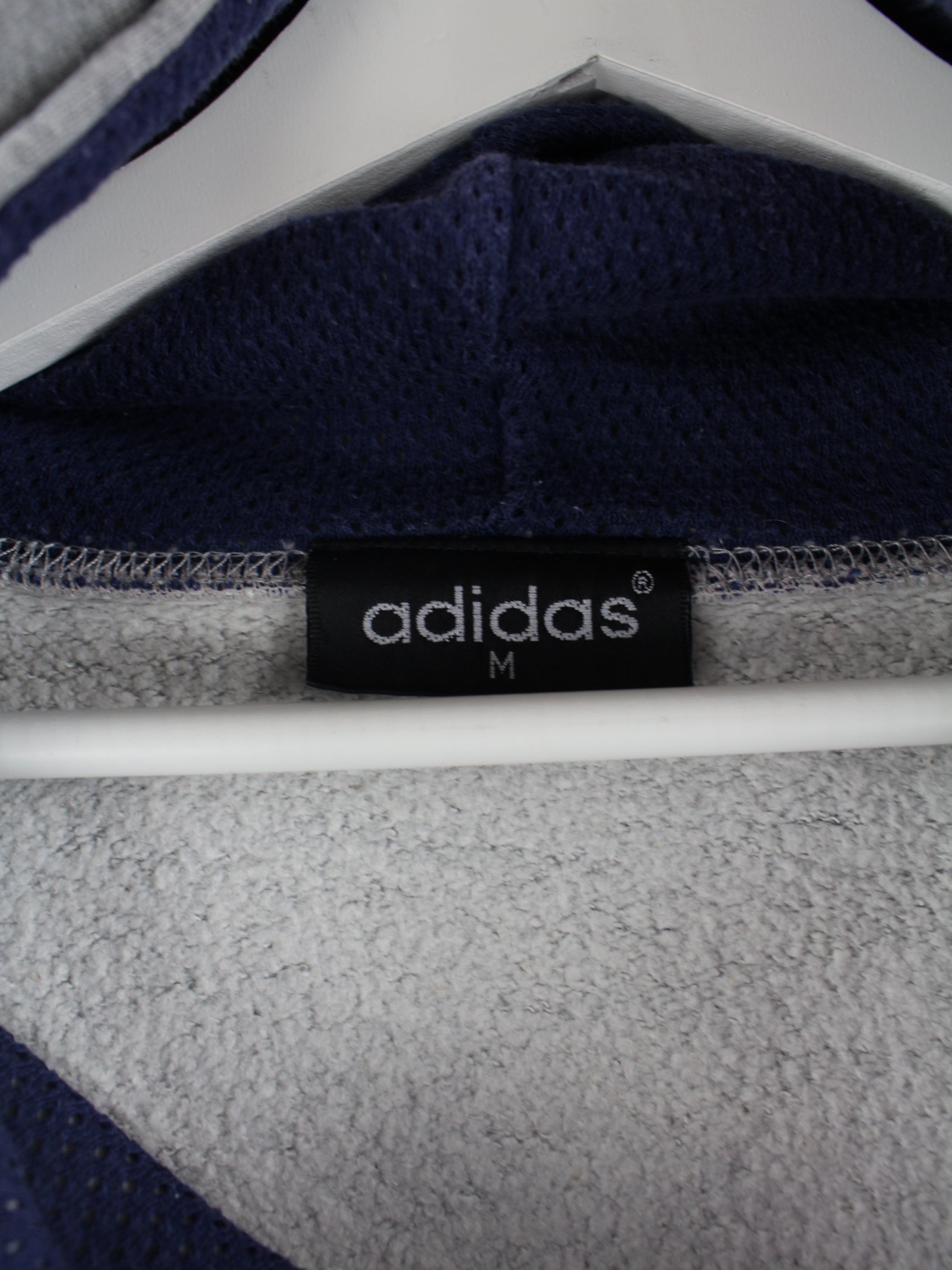 Grauer Hoodie mit Stick des Labels Adidas aus den 90'ern in Größe M. Er ist aus einer Baumwollmischung und in gutem Zustand in Stock.