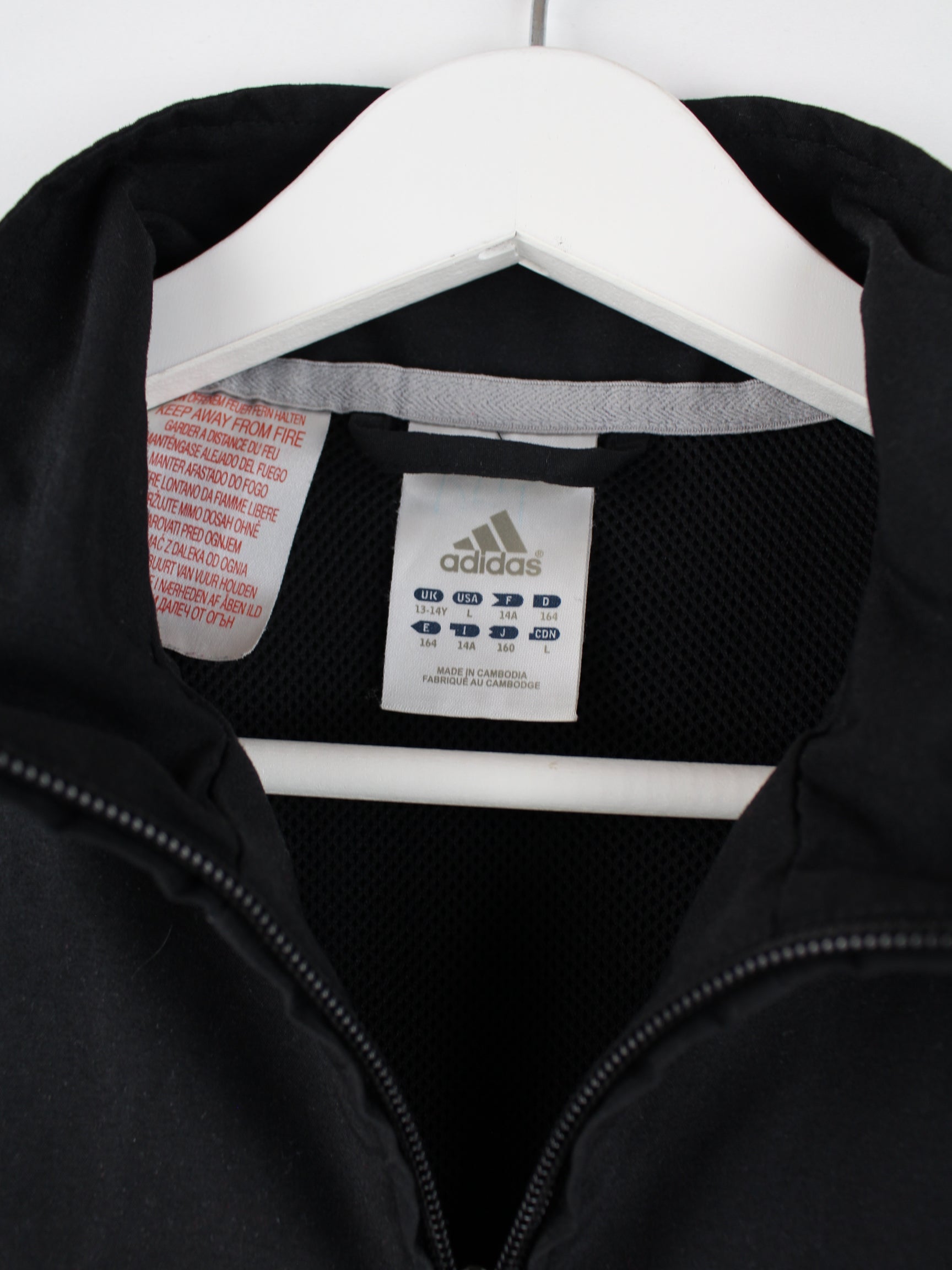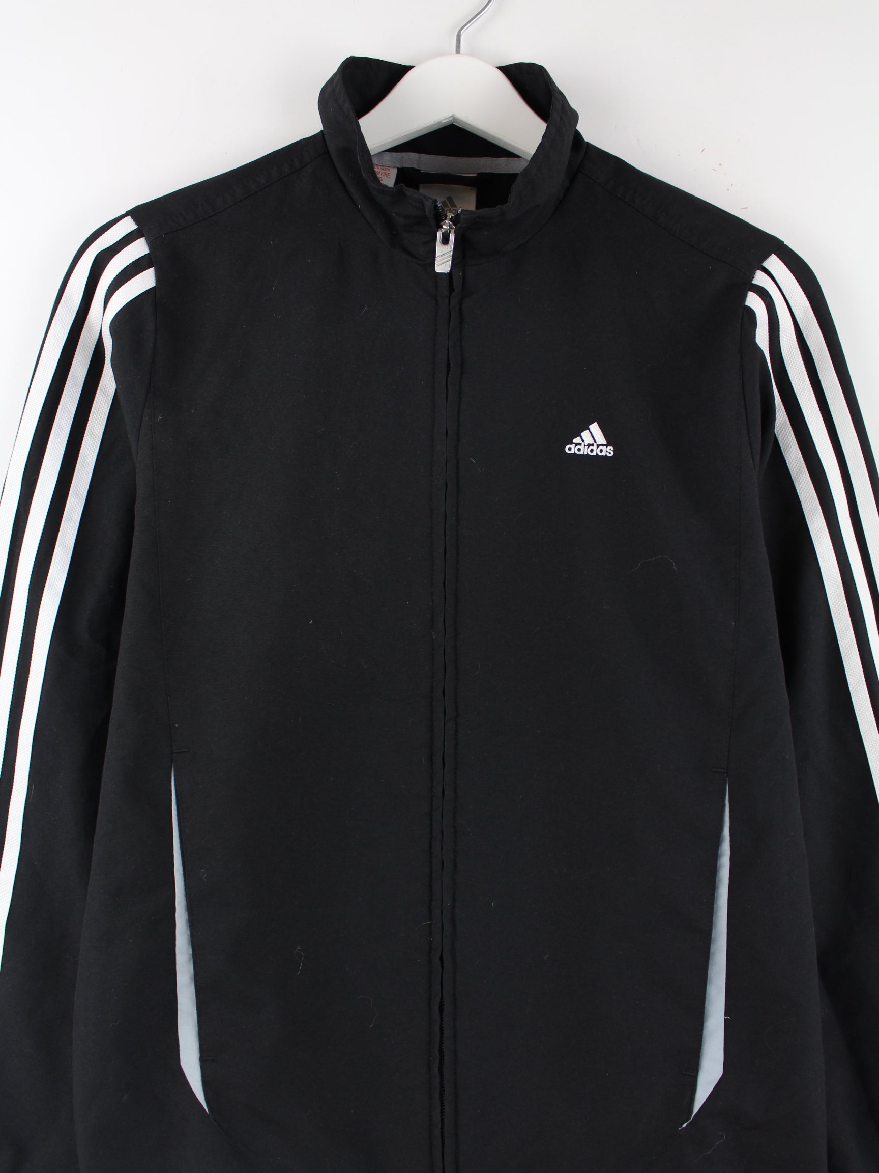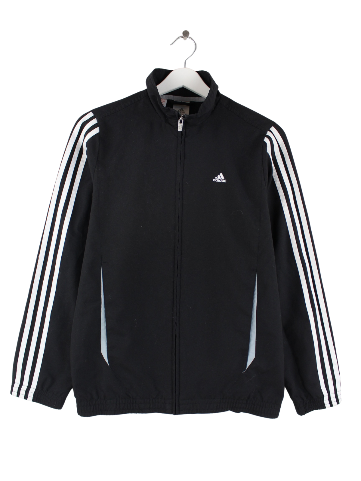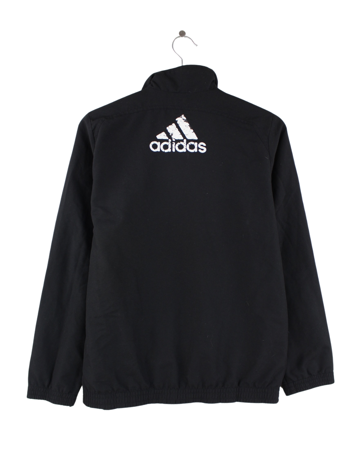 Schwarze Trainingsjacke aus dem Hause Adidas in Größe S. Sie ist aus Synthetik gemacht und in gutem Zustand zu haben.