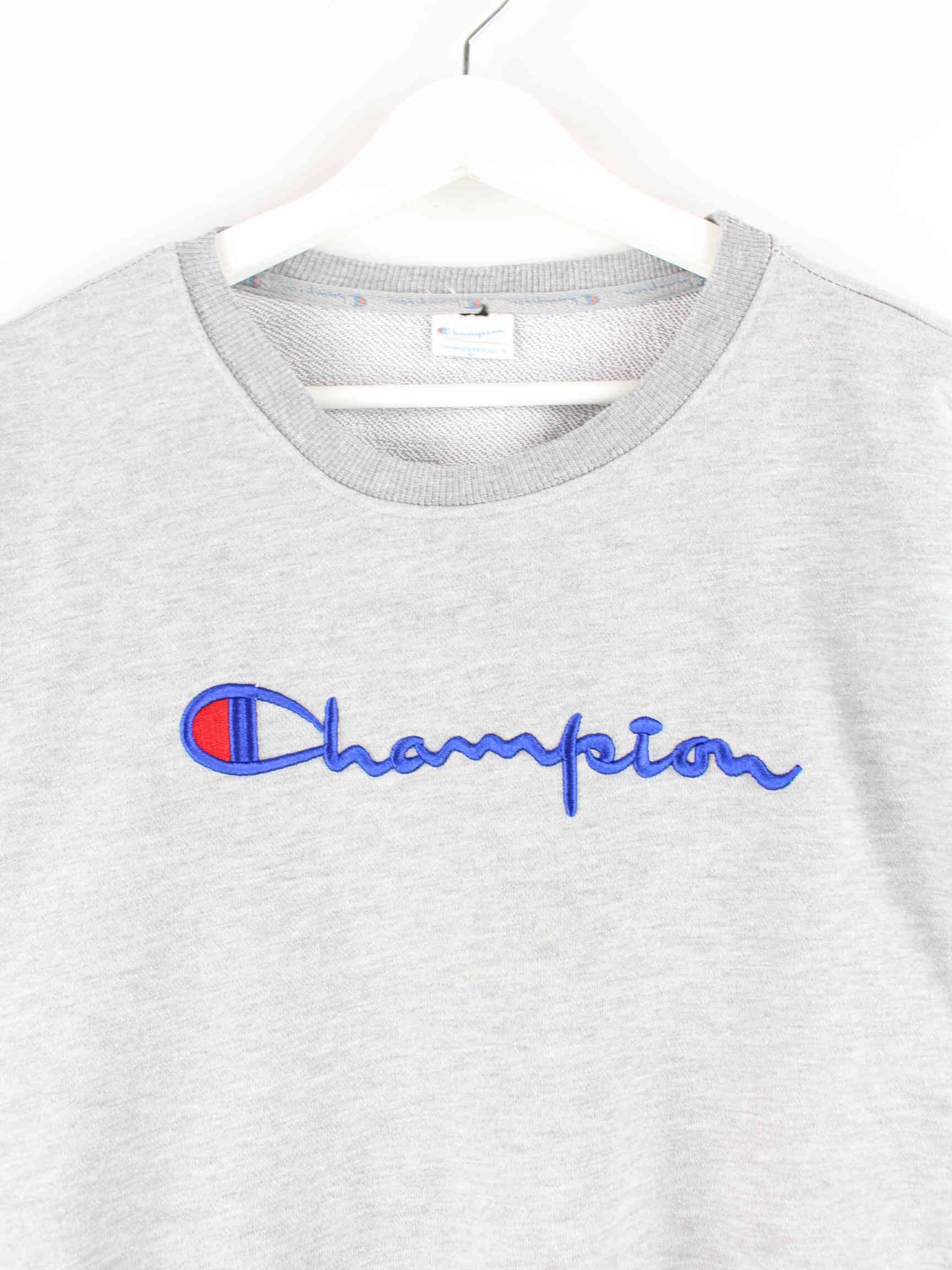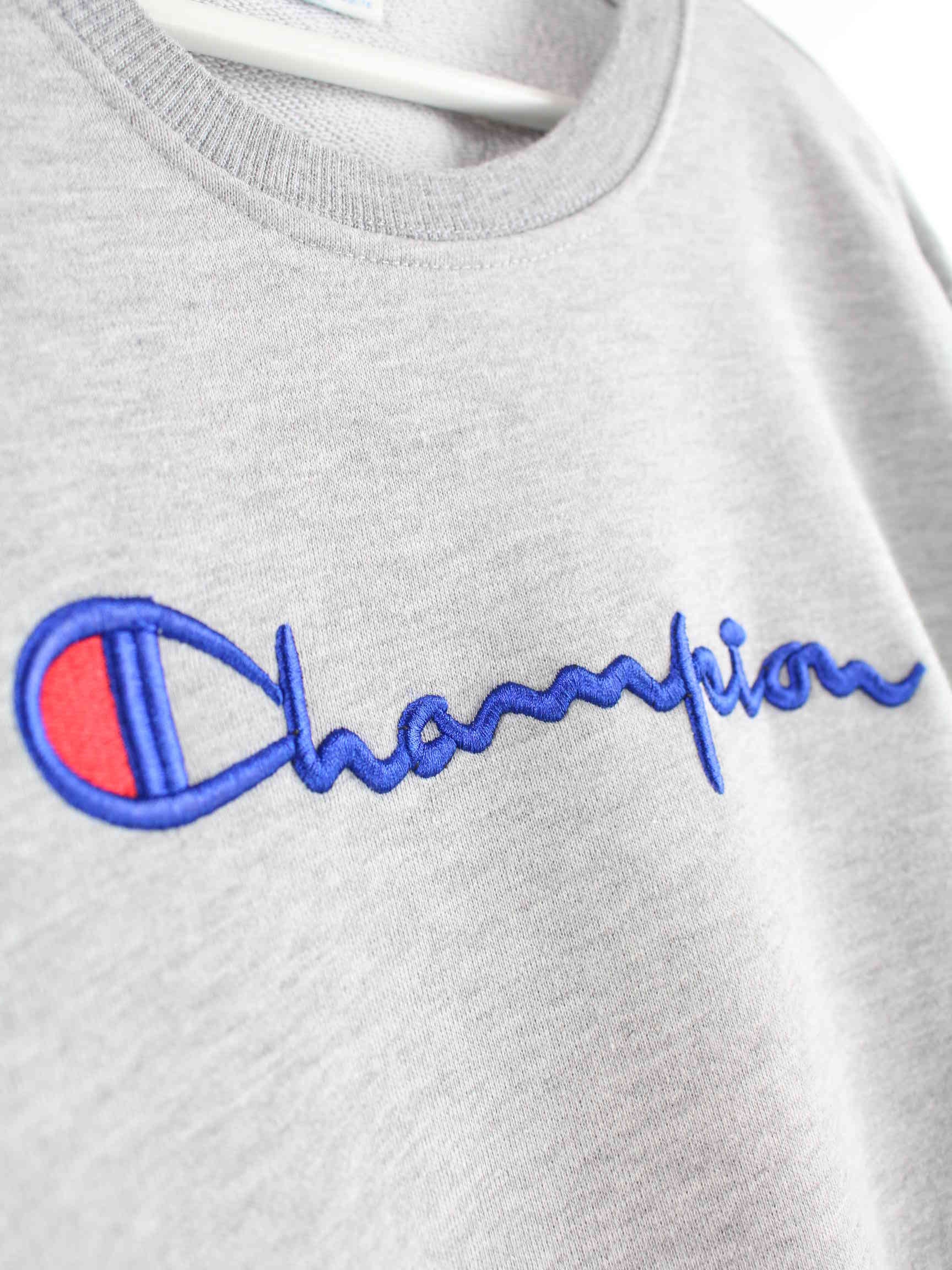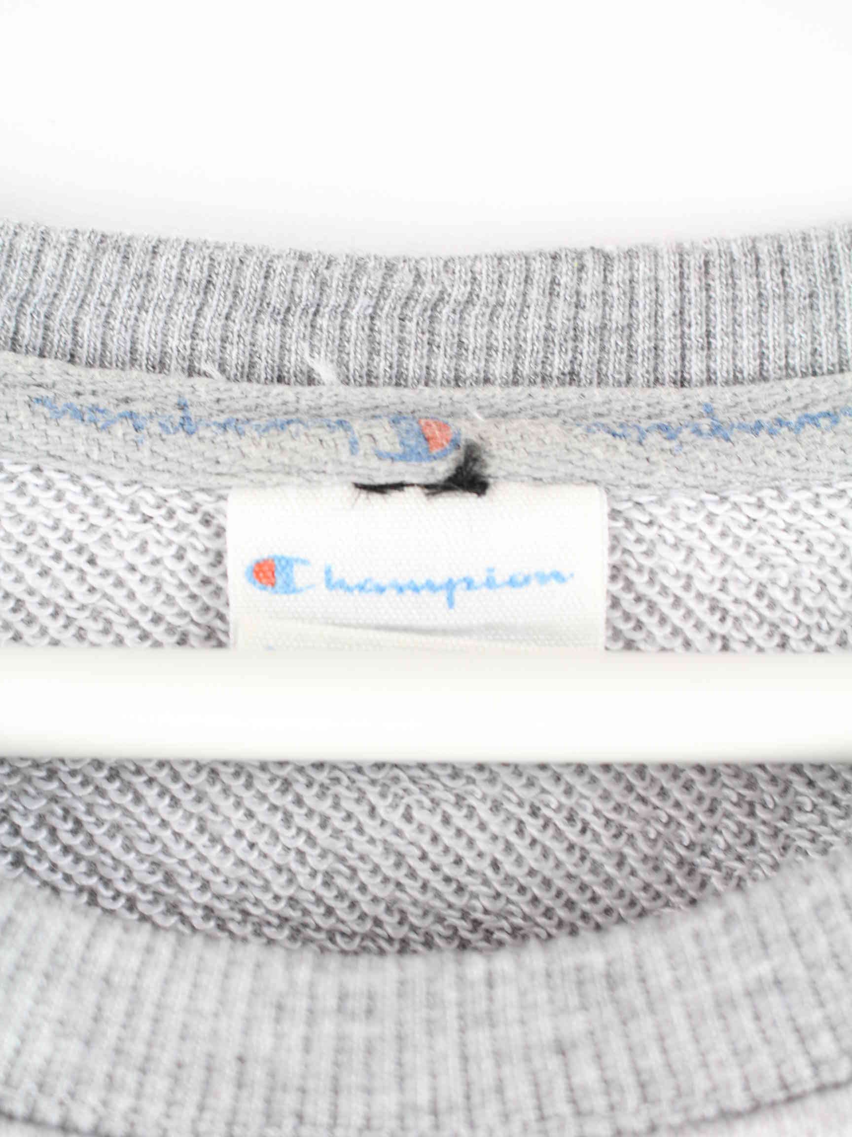 Grauer Sweater mit gestickten Motiven des Labels Champion aus den 90'ern in Größe S. Er ist aus einer Baumwollmischung gemacht und in gutem Zustand bei uns vorrätig.