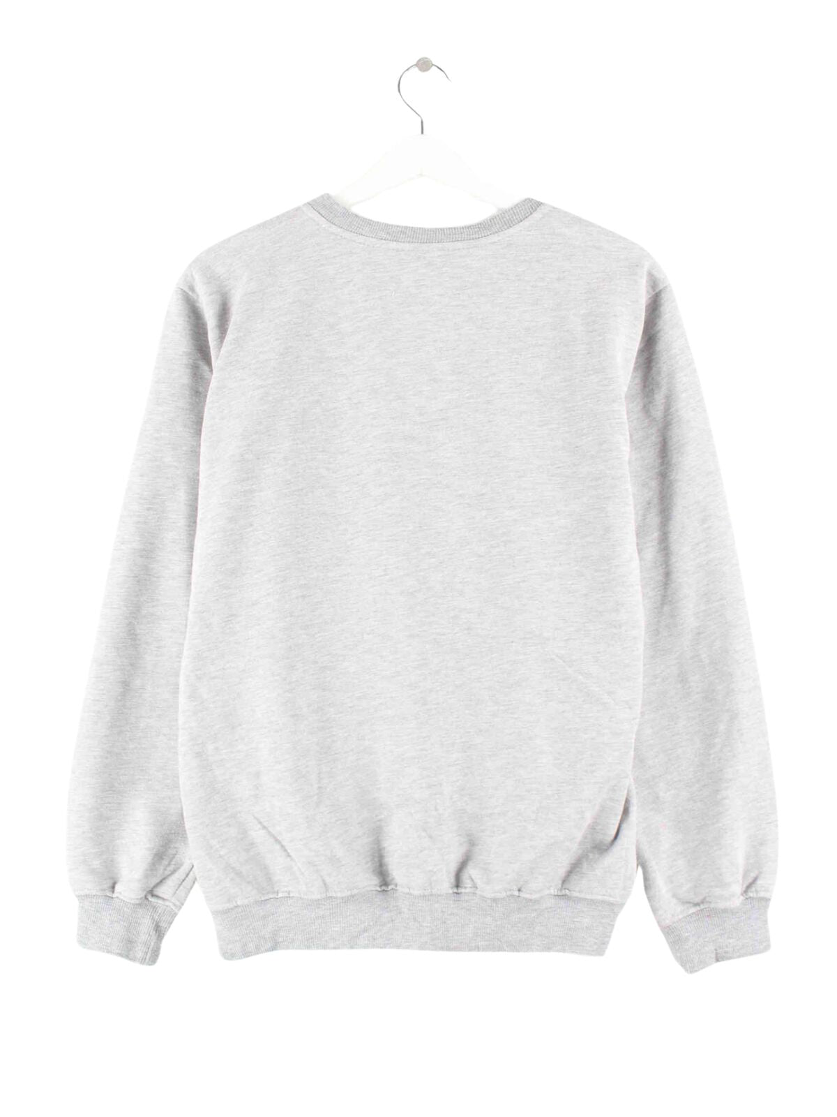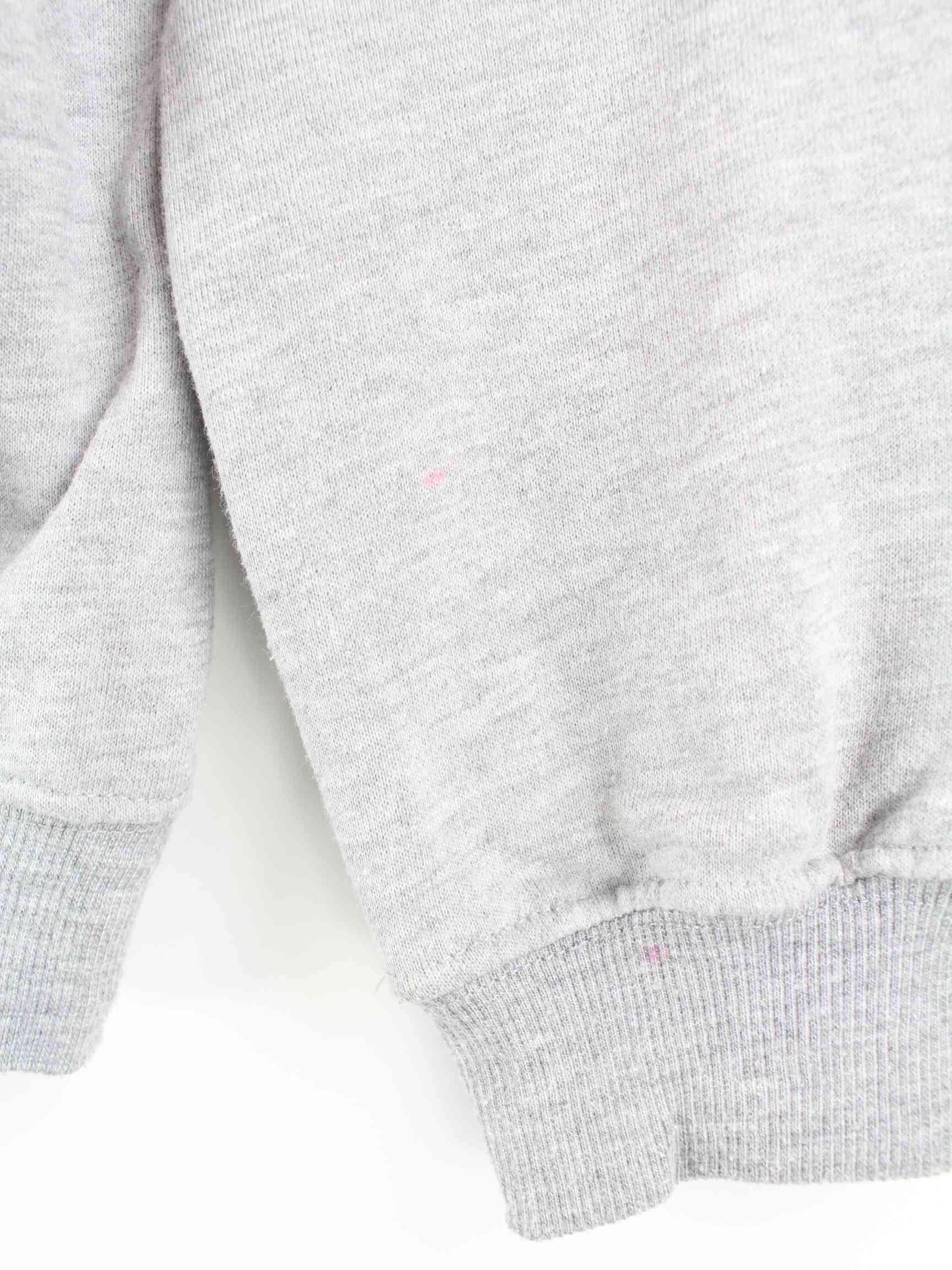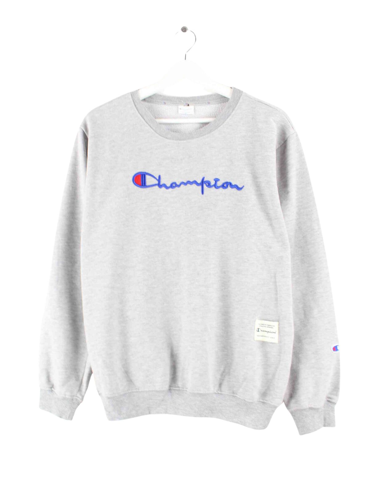 Grauer Sweater mit gestickten Motiven des Labels Champion aus den 90'ern in Größe S. Er ist aus einer Baumwollmischung gemacht und in gutem Zustand bei uns vorrätig.