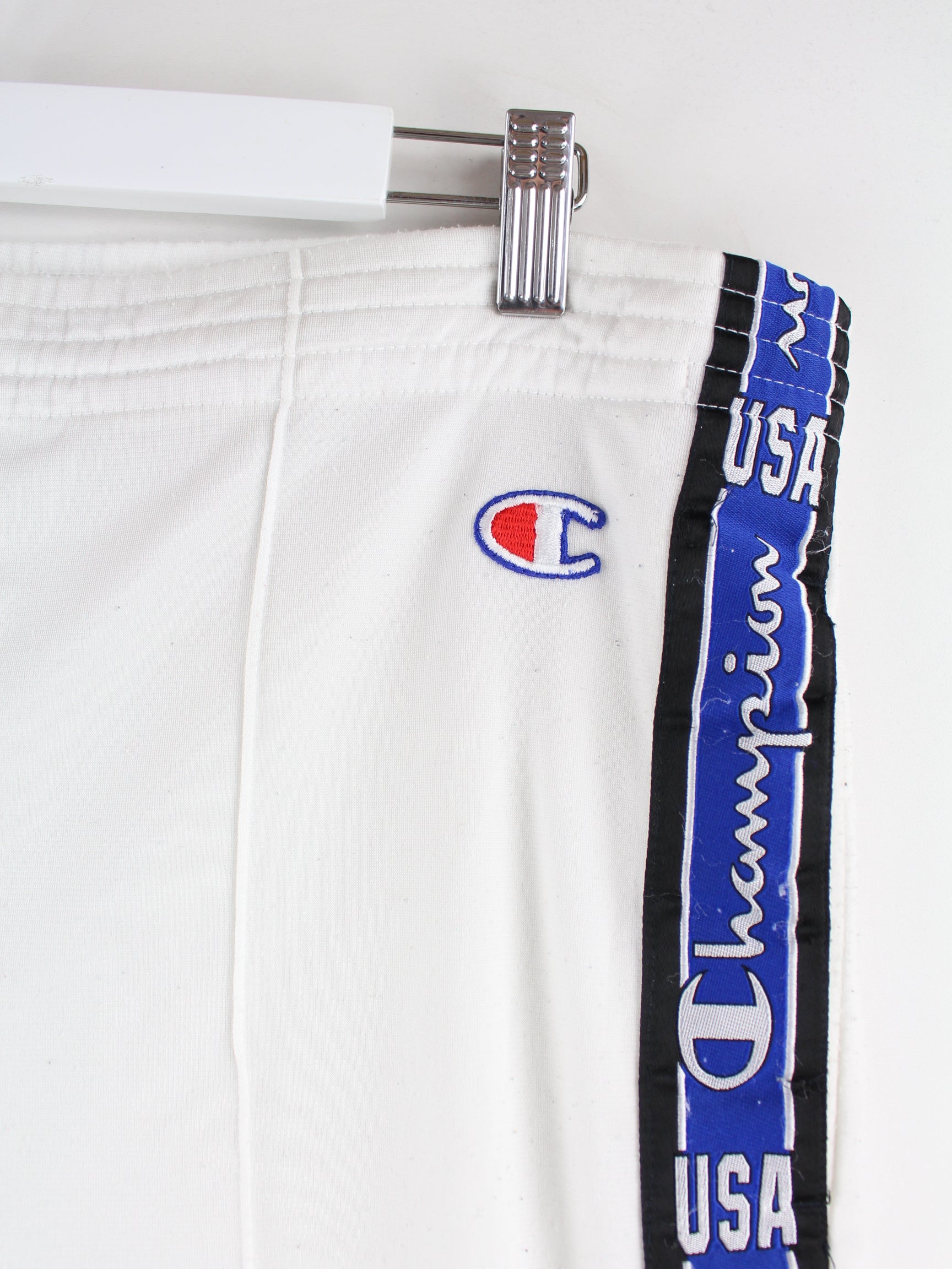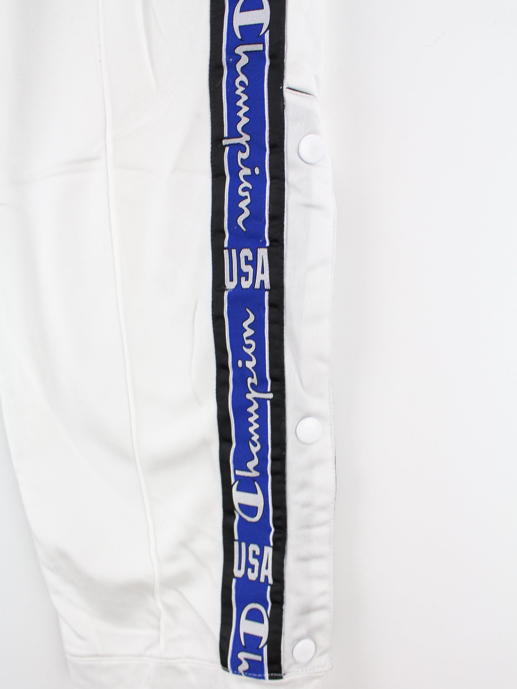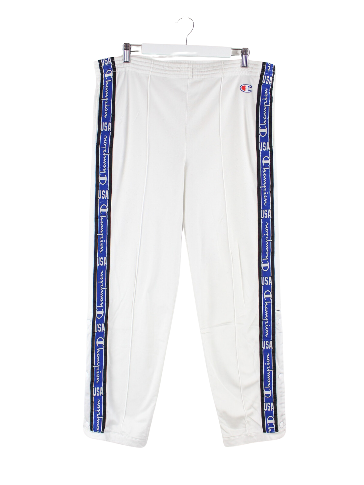 Weiße Track Pants aus dem Hause Champion aus den 90'ern in Größe M. Sie sind aus Synthetik produziert und in gutem Zustand im Angebot.