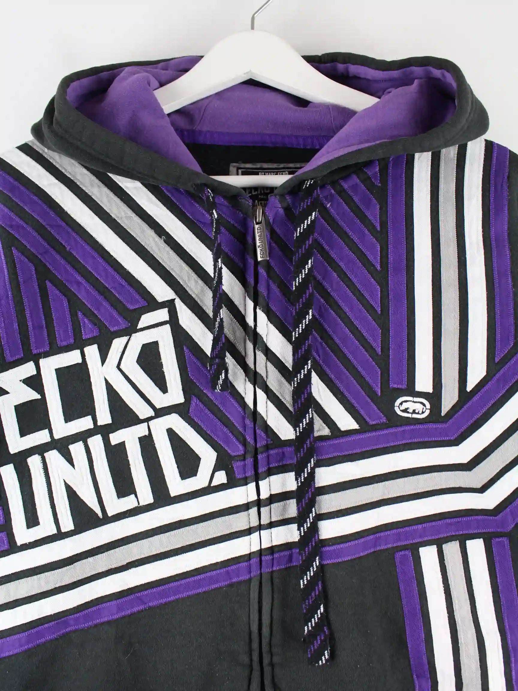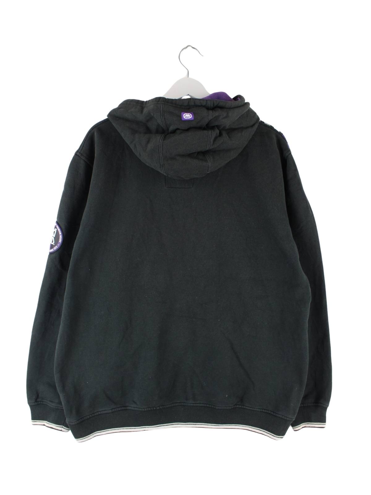 Schwarzer Hoodie mit Stickereien und Reißverschluß aus dem Hause Ecko aus Anfang der 2000'er in Größe L. Er ist aus einer Baumwollmischung und in sehr gutem Zustand auf Lager.