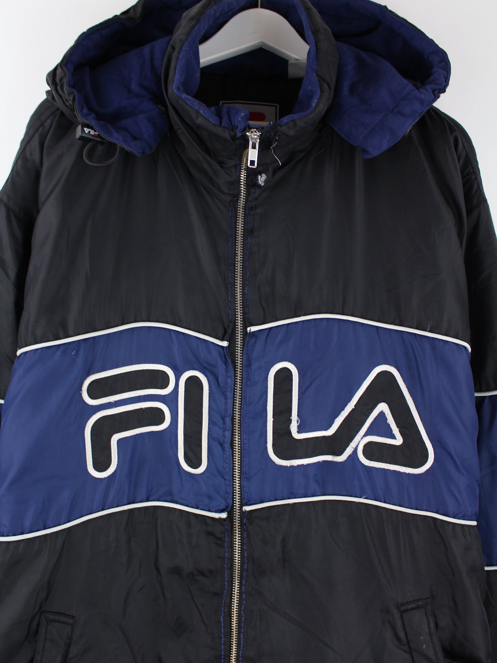 Schwarze Jacke mit gesticktem Logo der Brand Fila aus den 90'ern in Größe XL. Sie ist aus Synthetik hergestellt. Den Zustand würden wir als 'In Ordnung' bezeichnen (vergl. Bilder).