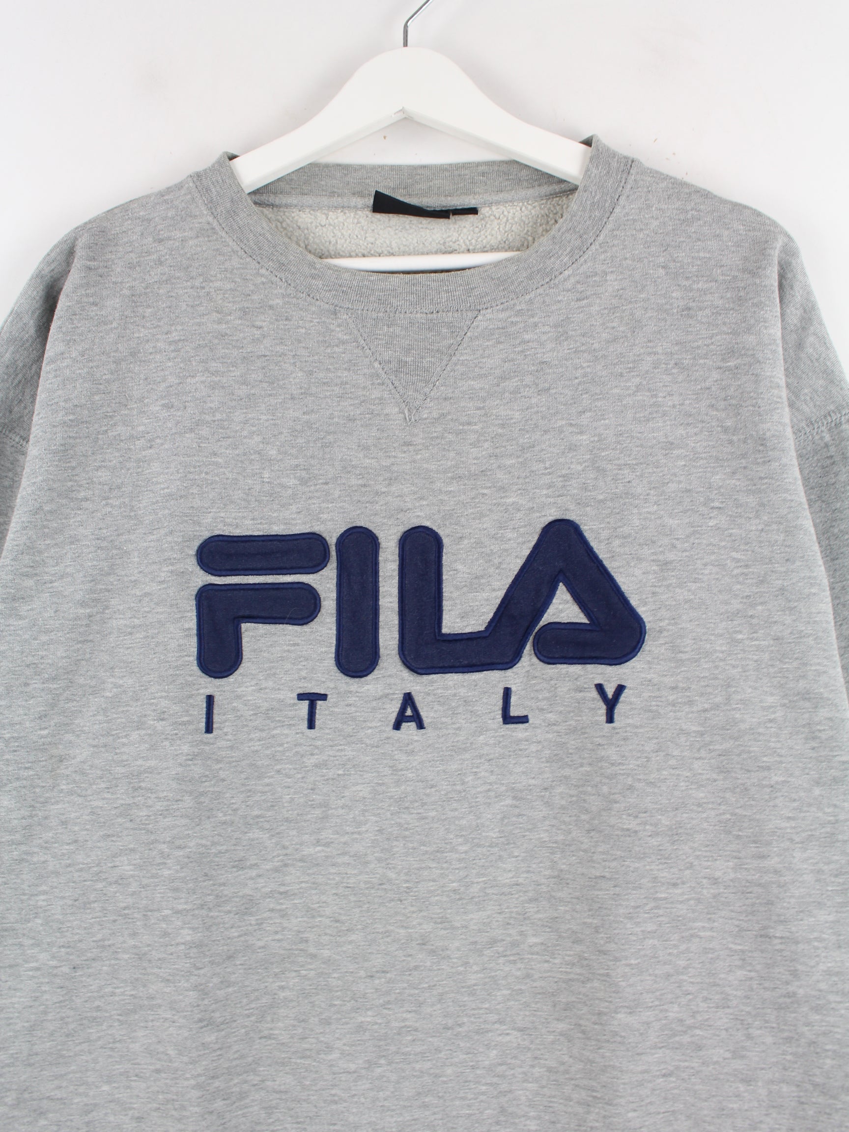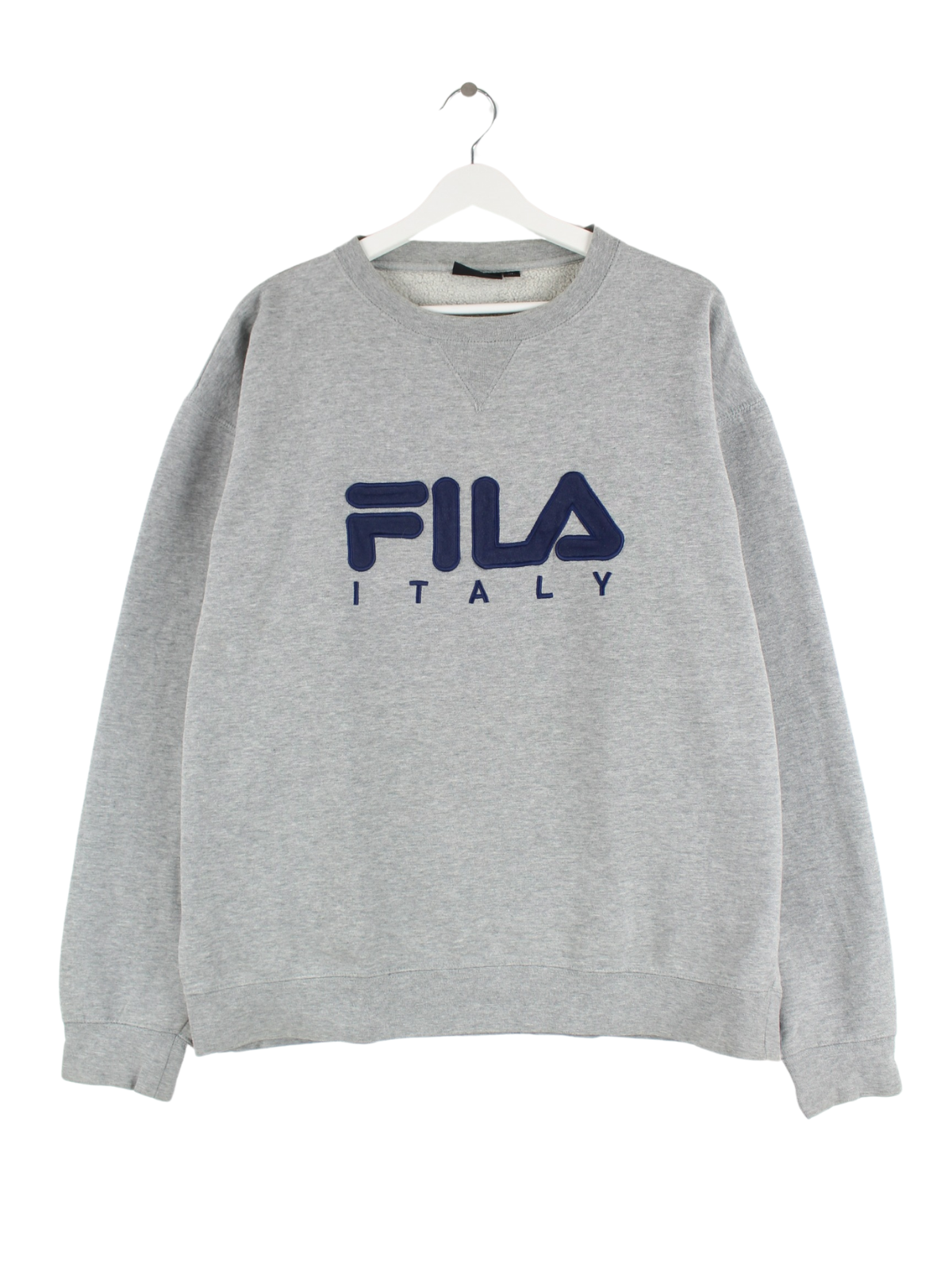Grauer Sweater mit Stickereien aus dem Hause Fila in Größe XL. Er ist aus einer Baumwollmischung produziert und in gutem Zustand im Bestand.