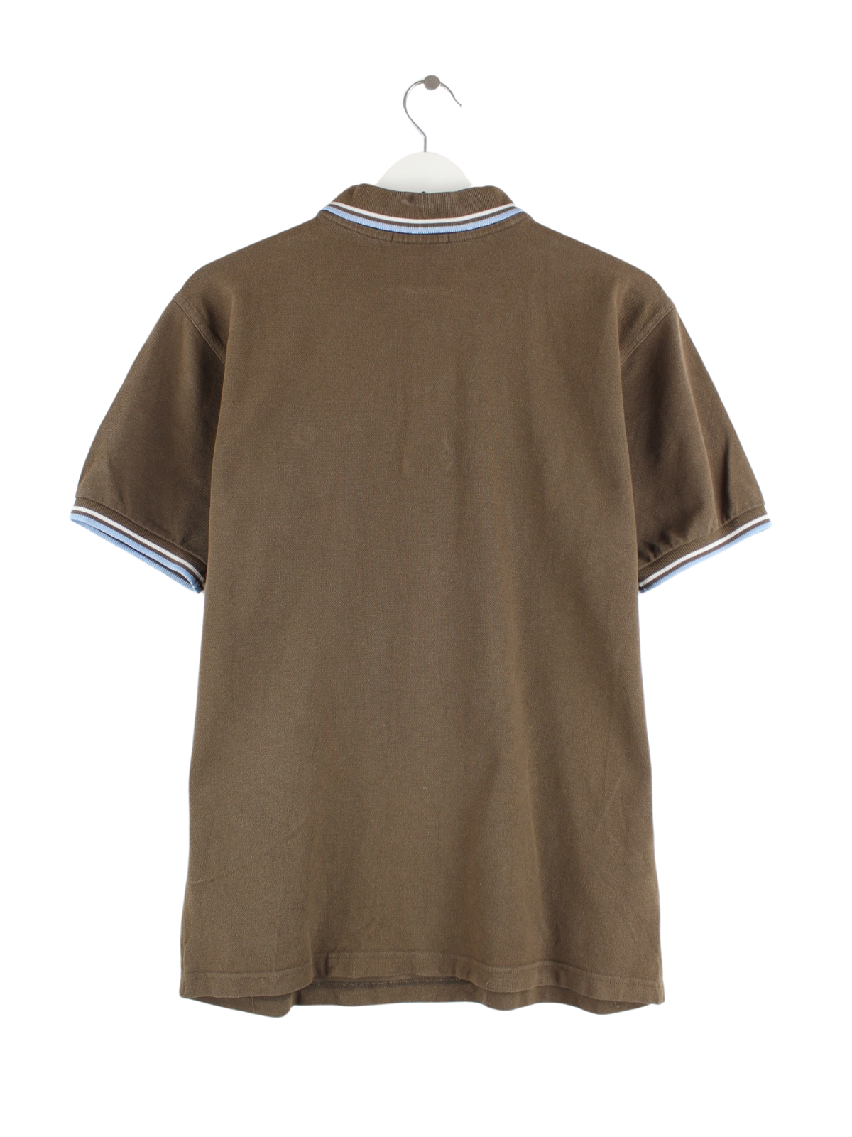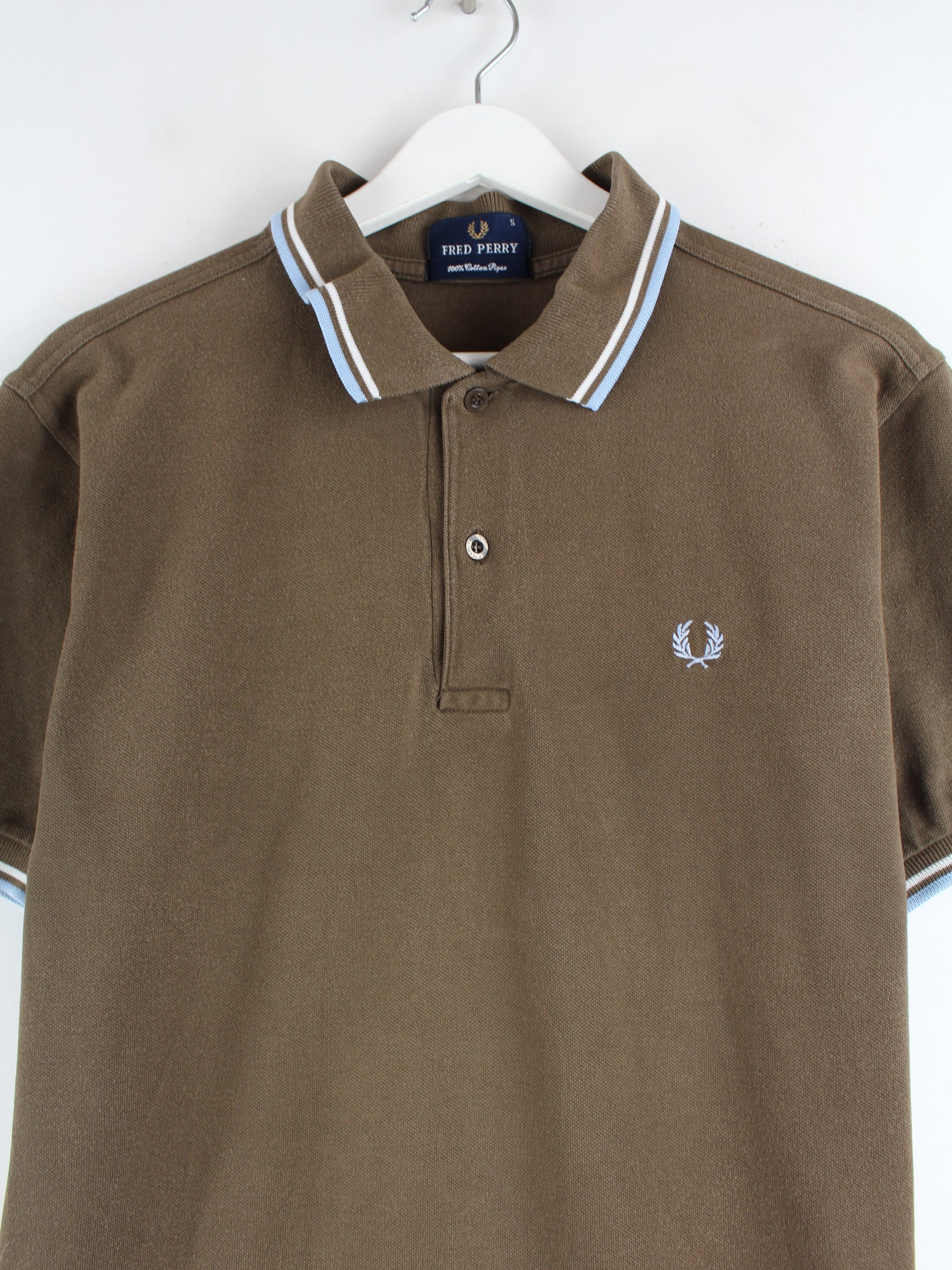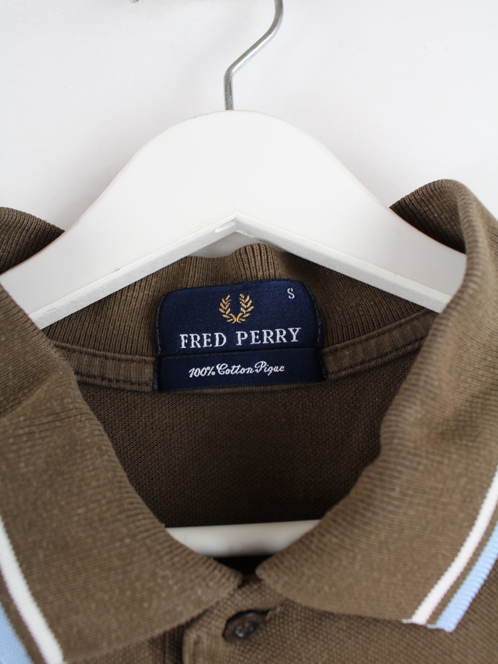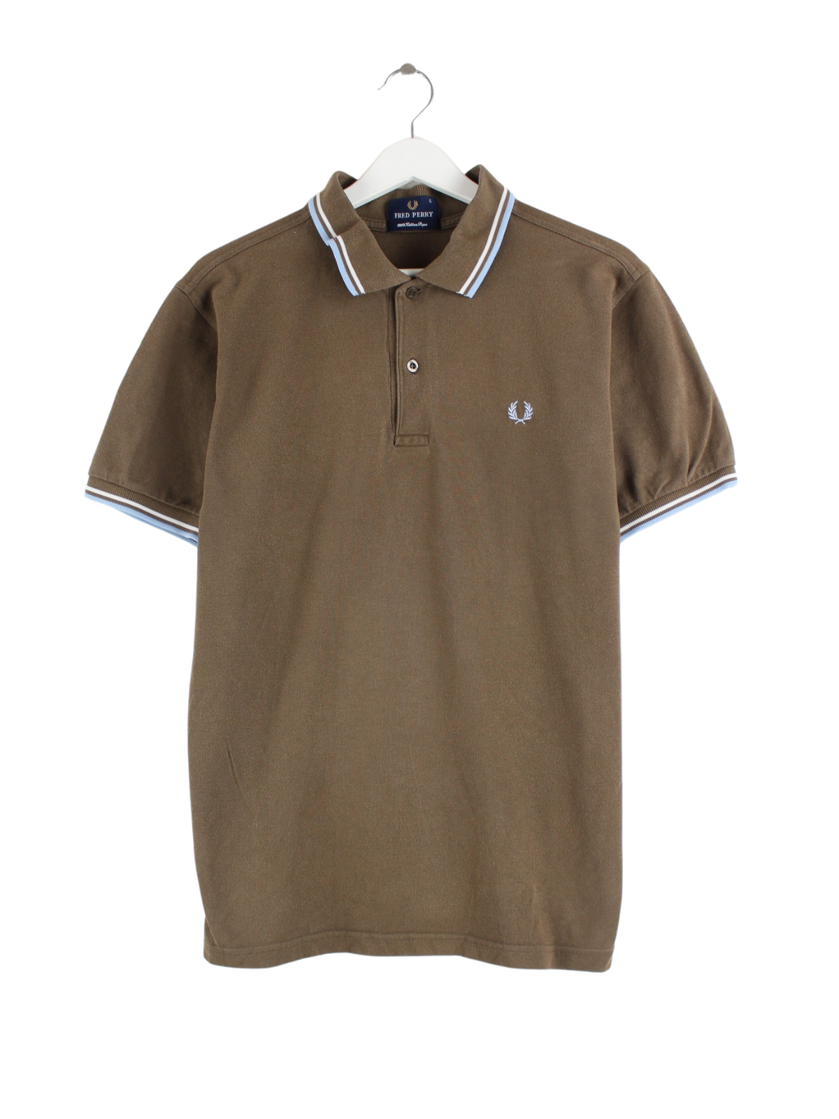 Braunes Poloshirt vom Label Fred Perry in Größe S. Es ist aus Baumwolle und in sehr gutem Zustand auf Lager.