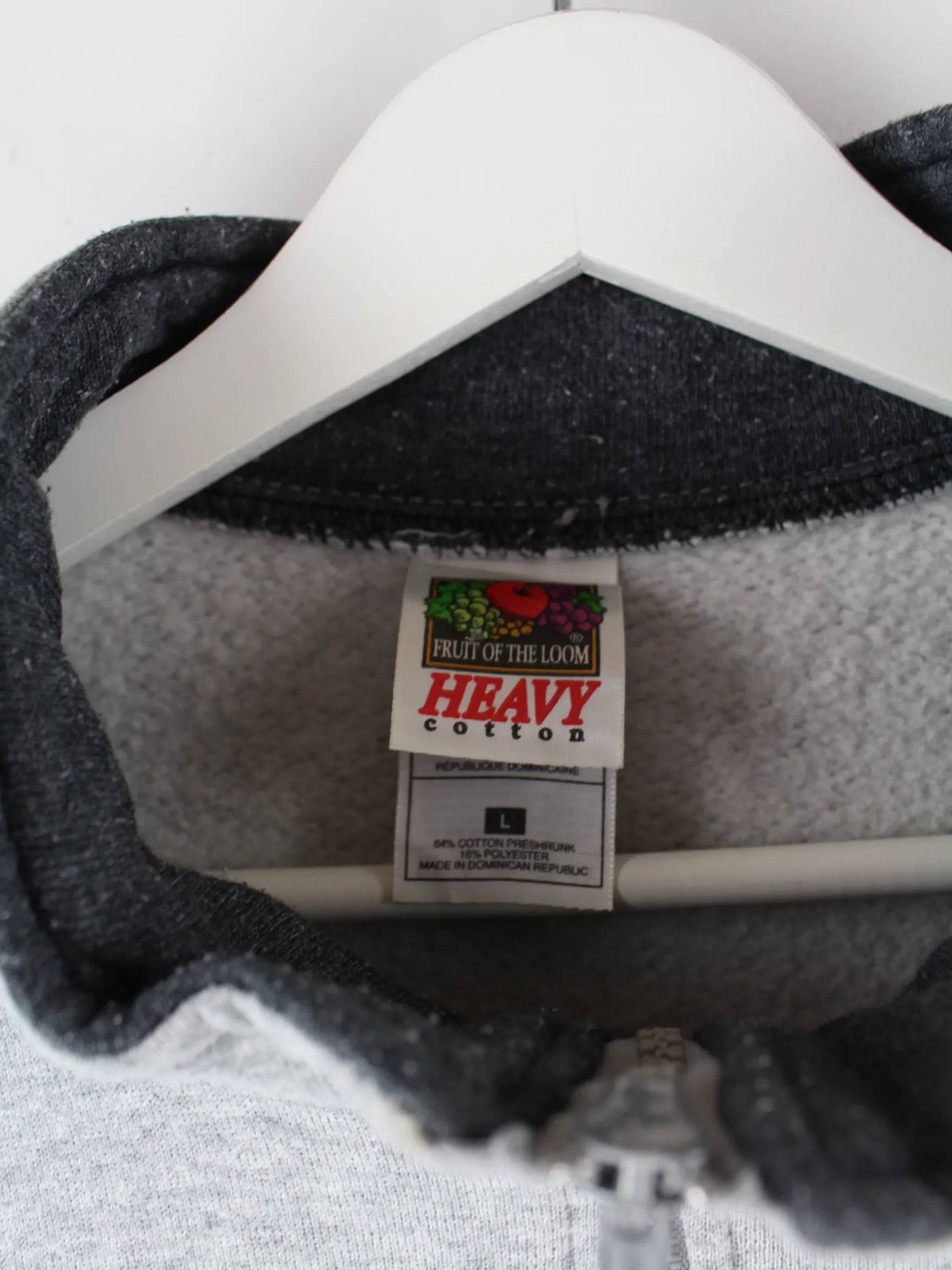 Grauer Sweater mit halbem Reißverschluß von Fruit of the Loom aus den 90'ern in Größe L. Er ist aus einer Baumwollmischung angefertigt und in sehr gutem Zustand auf Lager.