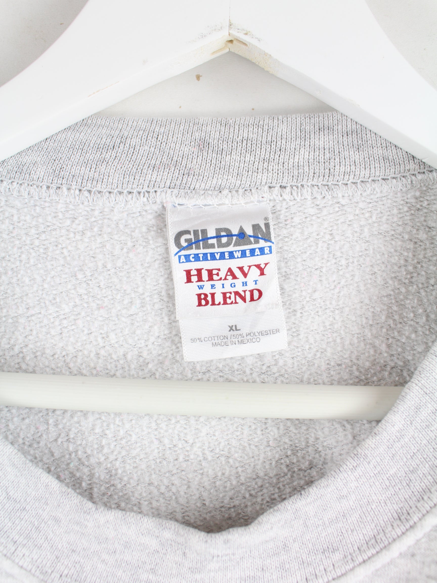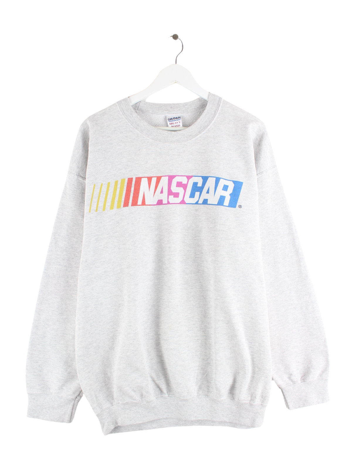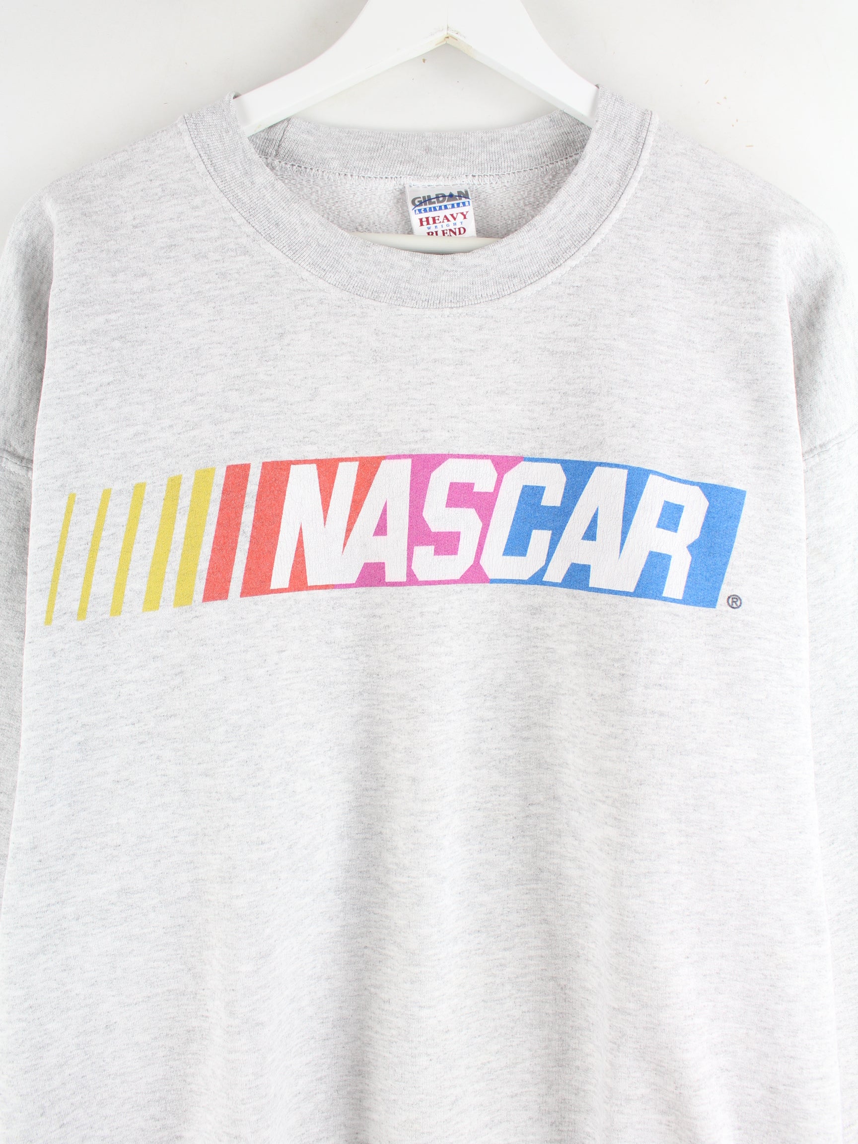 Grauer Sweater der Marke Gildan in Größe XL. Er ist aus einer Baumwollmischung gemacht und in sehr gutem Zustand im Angebot. Mit schickem Nascar Print.