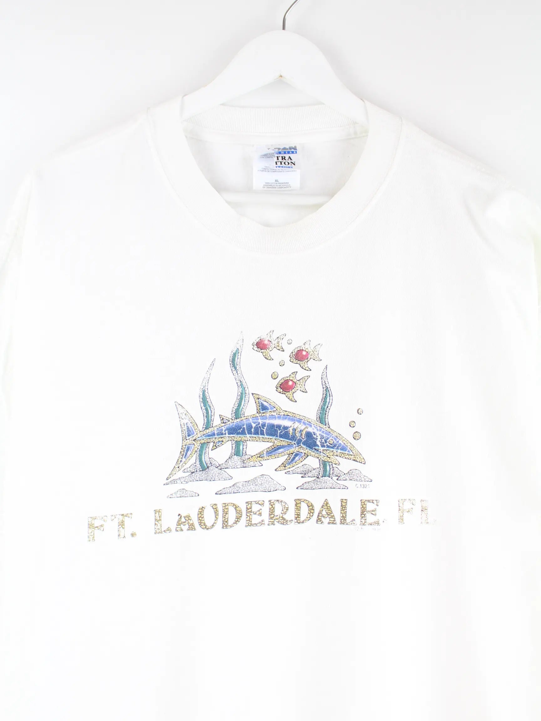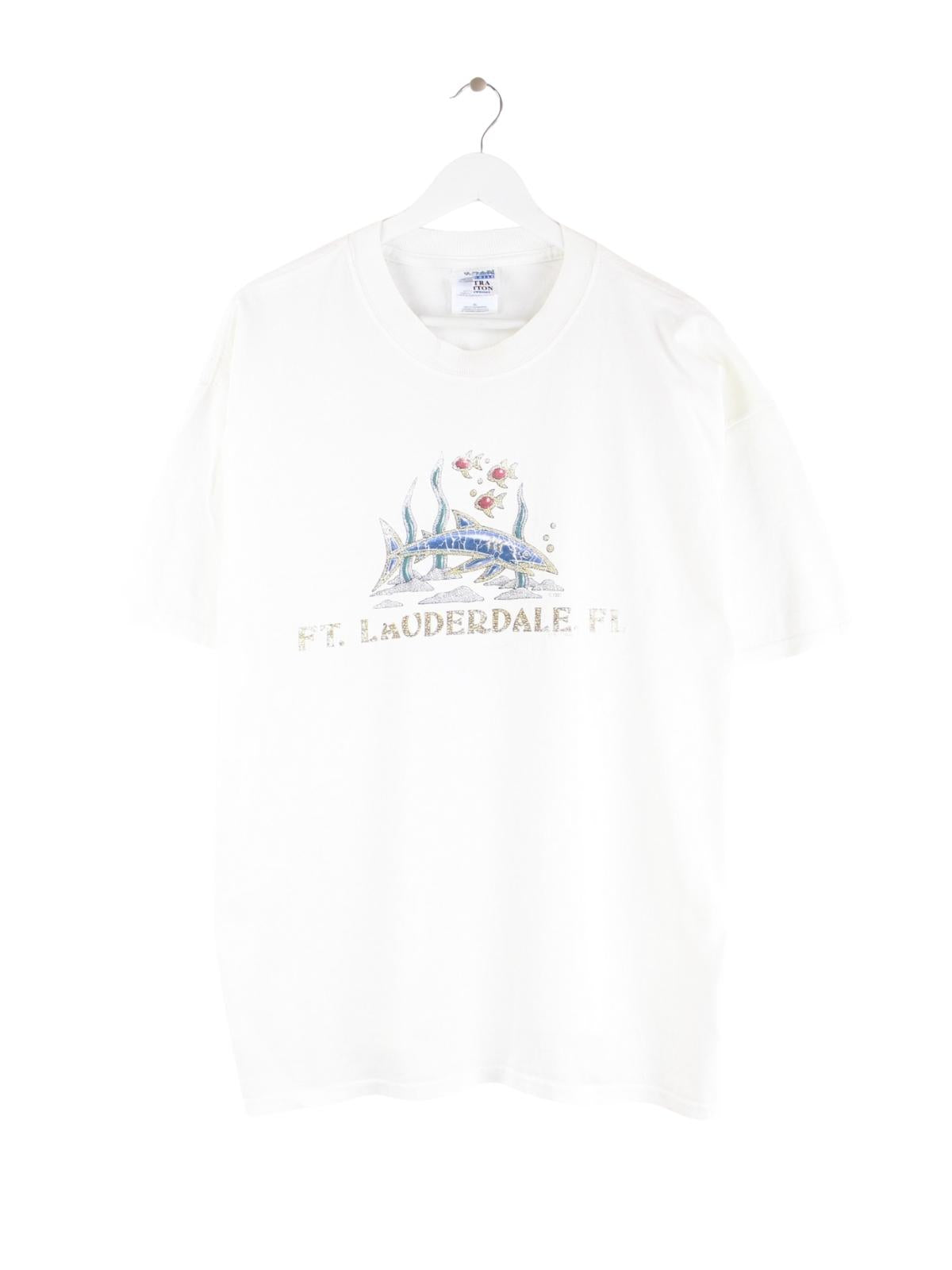 Vintage Souvenir T-Shirt von Gildan in Größe XL aus den 90'ern. Es ist aus Baumwolle angefertigt und in Weiß in Stock. Mit tollem Vintage Print.