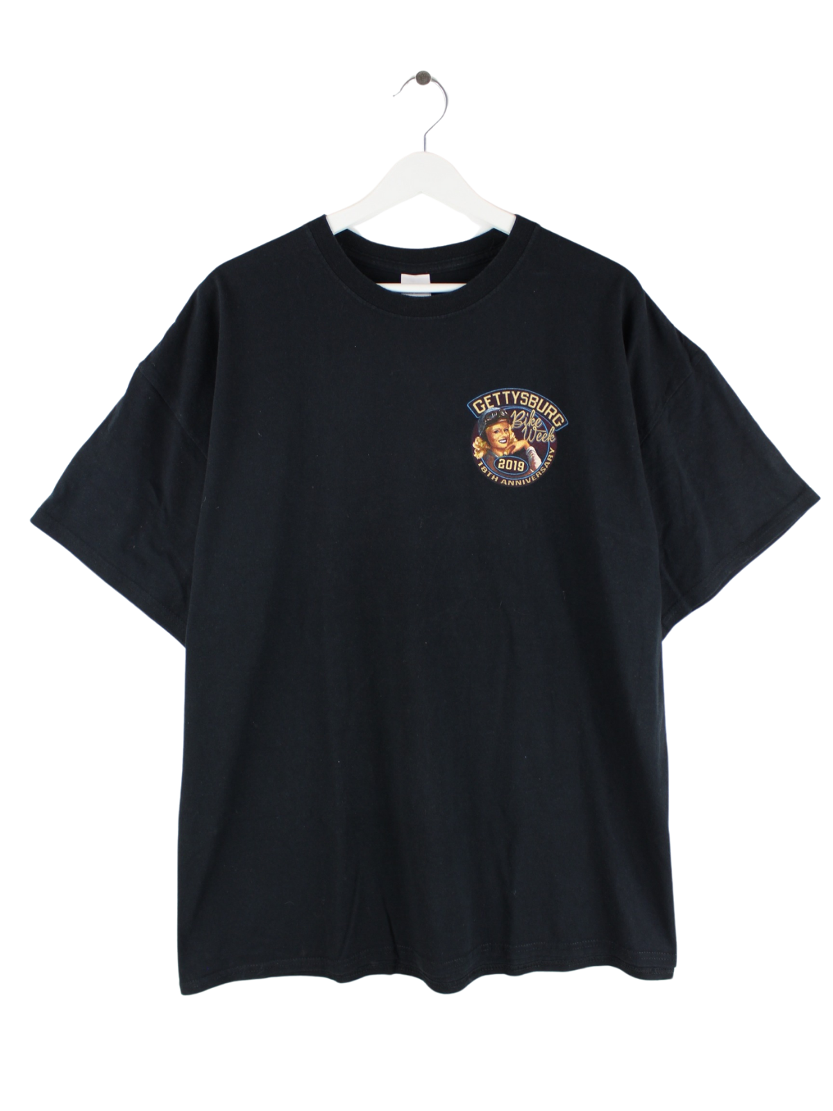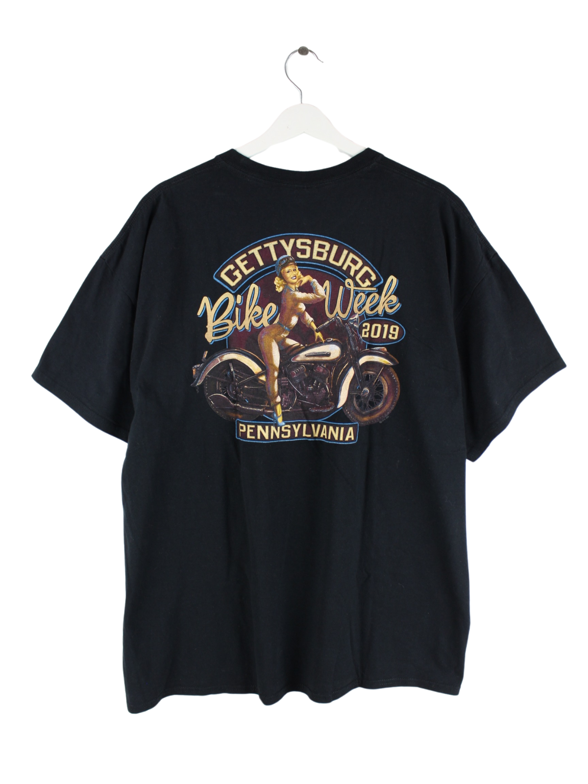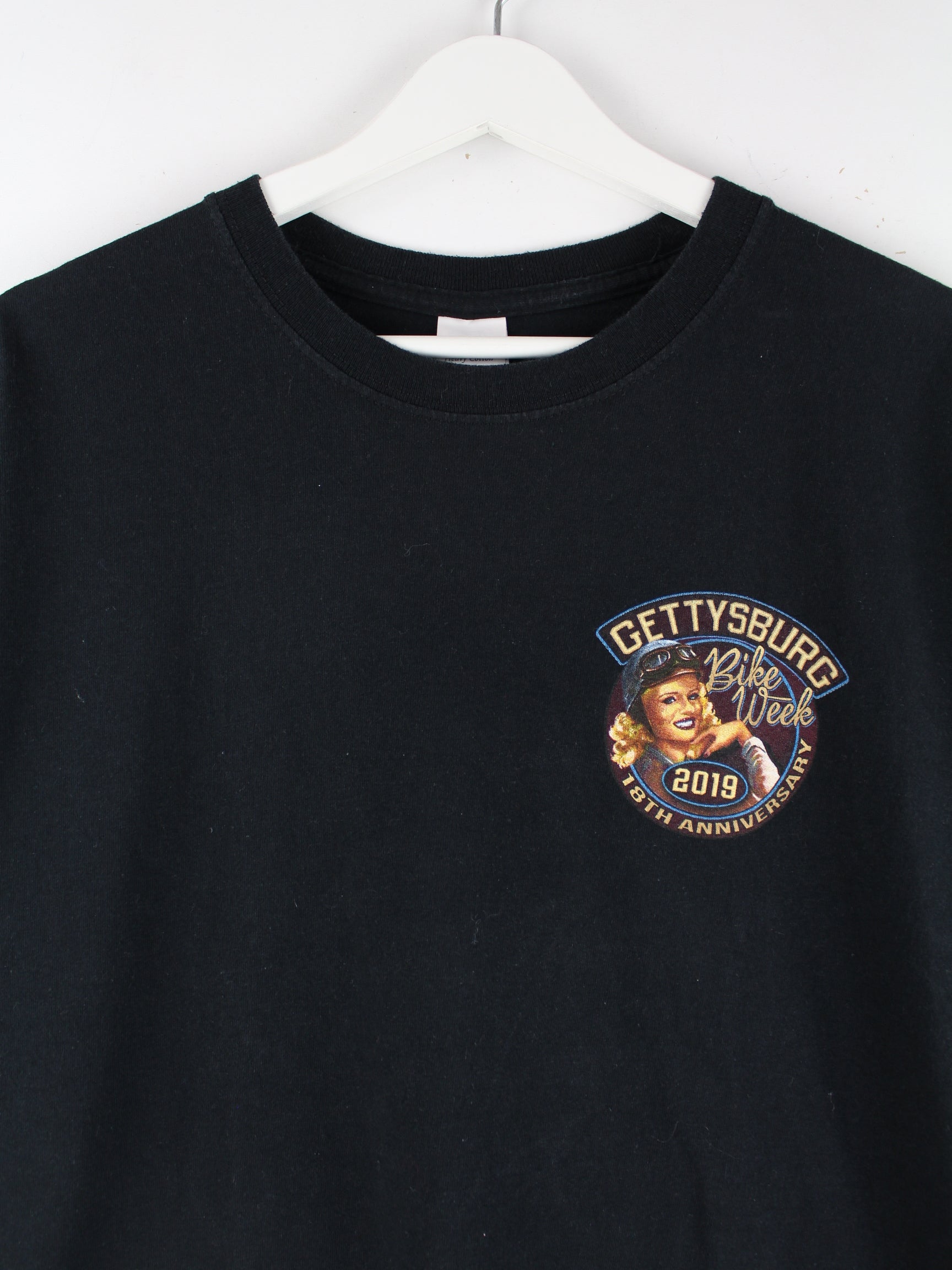T-Shirt der Marke Gildan in Größe L. Es ist aus Baumwolle produziert und in Schwarz auf Lager. Mit schönem Biker Print.