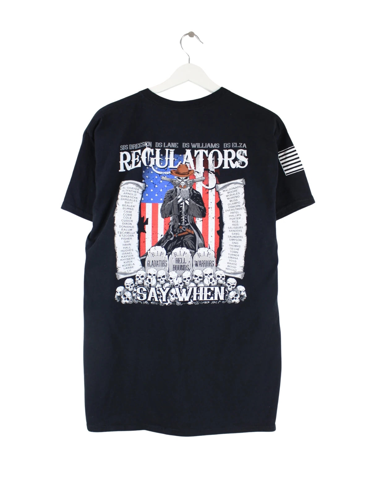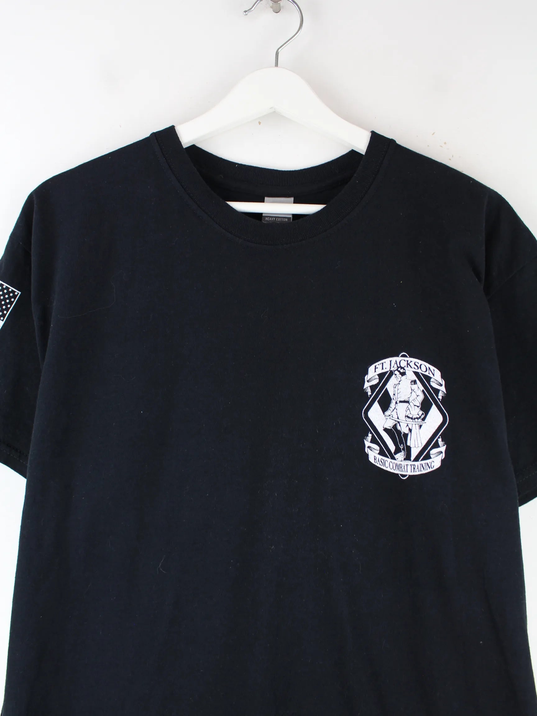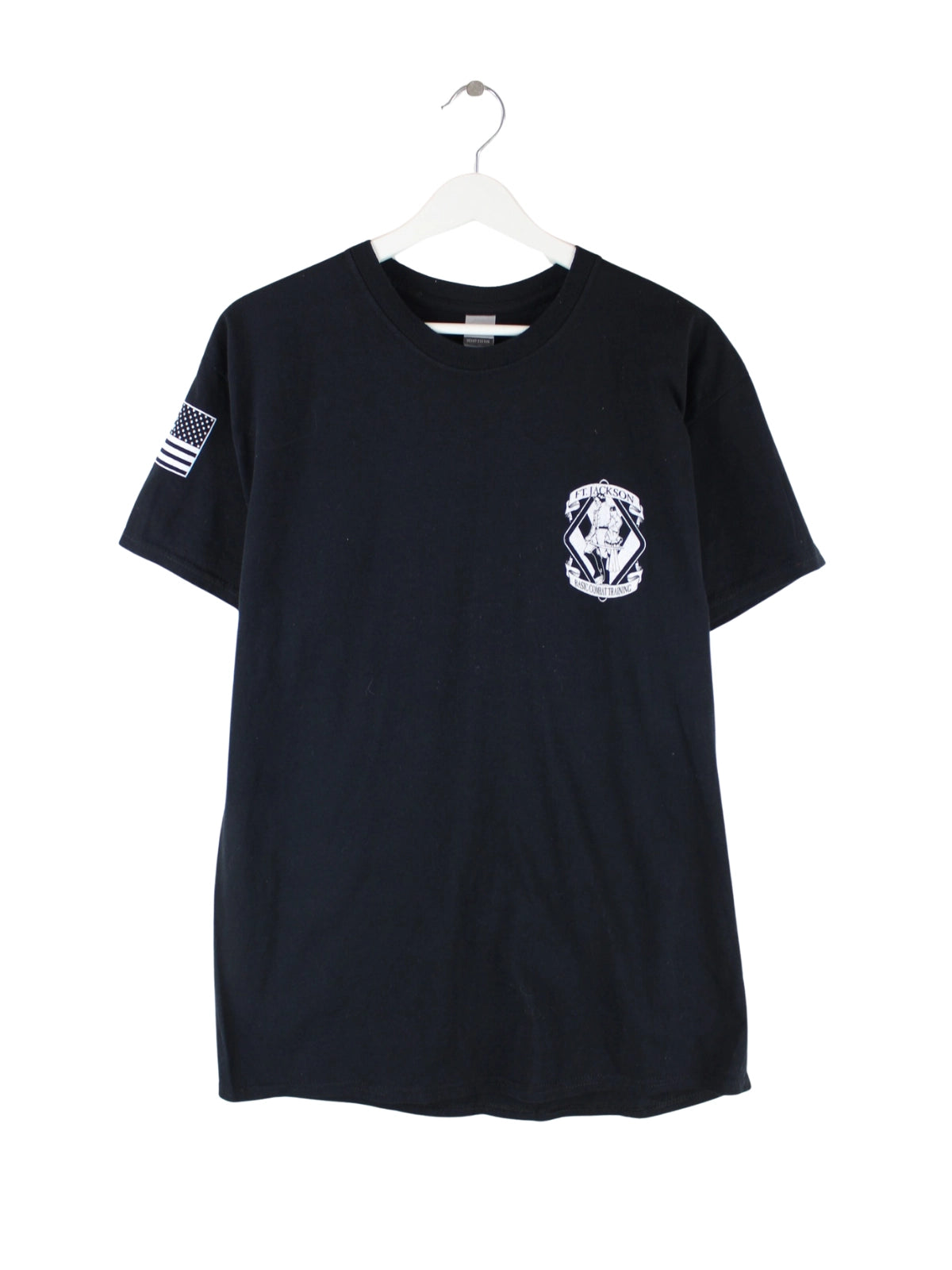 T-Shirt aus dem Hause Gildan in Größe L. Es ist aus Baumwolle gemacht und in Schwarz zu bekommen. Mit seltenem USA Print.