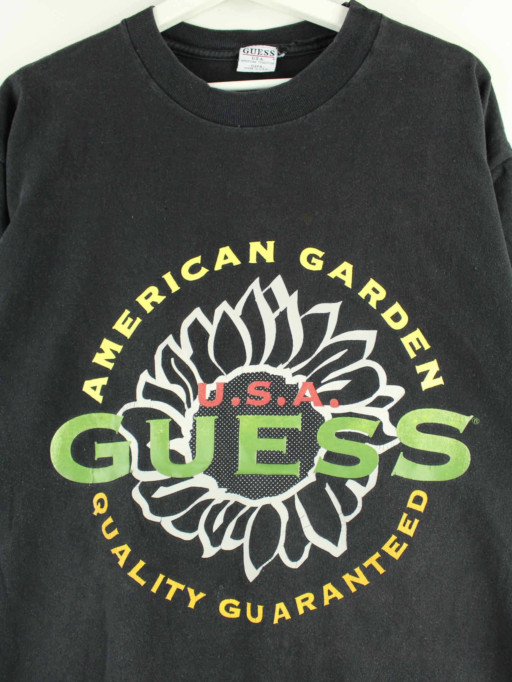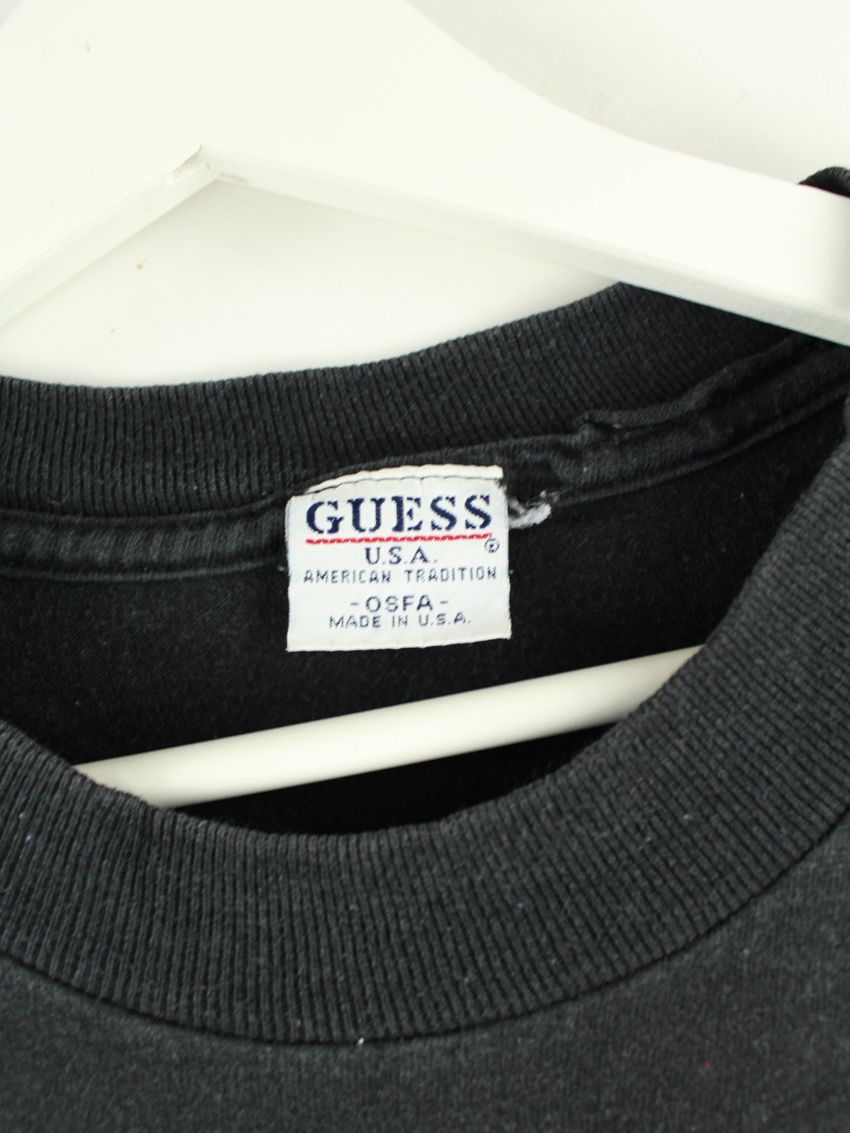 T-Shirt aus dem Hause Guess in Größe L aus den 90'ern. Es ist aus Baumwolle angefertigt und in Schwarz in Stock. Mit schönem Vintage Print.